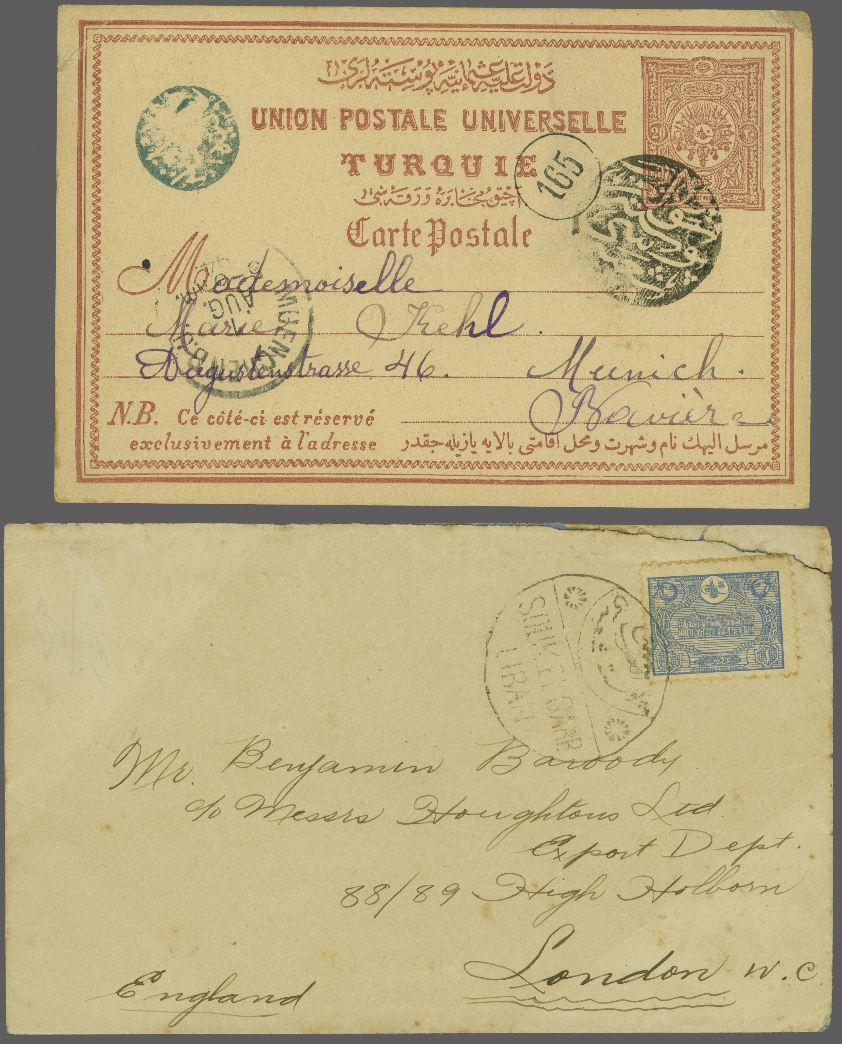 1309" negative seal handstamp (Souk el Garb Postal Branch 1893) well struck in black (Coles & Walker fig. 120, Ziya fig. 1 - rated 'RR'). Sender's personal seal in blue at left and Munich arrival (Aug 1). Slight corner bend to card but otherwise