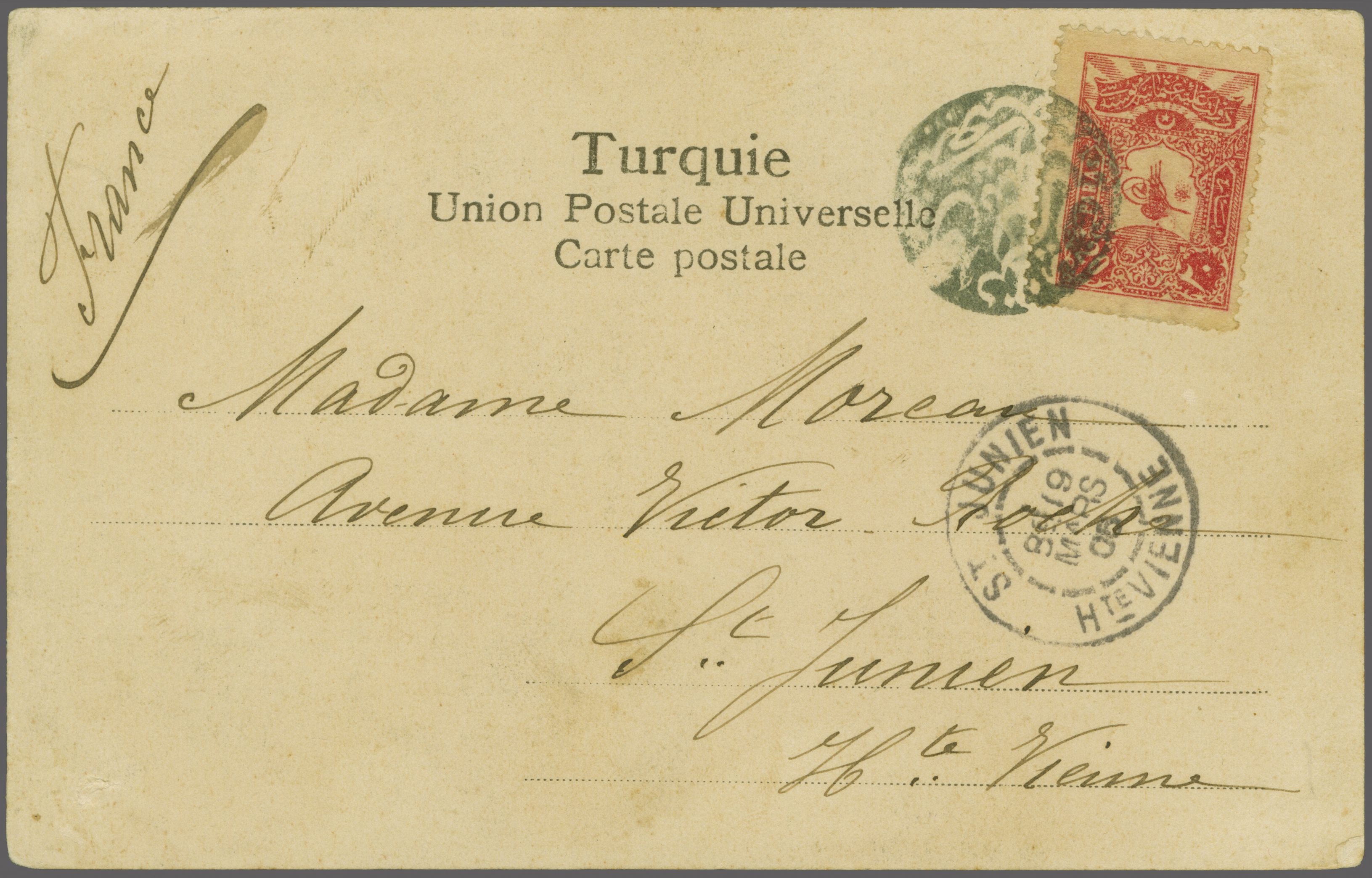 upper segment) in black (Coles & Walker unlisted, Ziya fig. 2 - rated 'RR'). St. Junien arrival (July 18) in black. Rare. Note: This card is illustrated in the Ziya catalogue 'T - Z' on page 41 (Image 1)