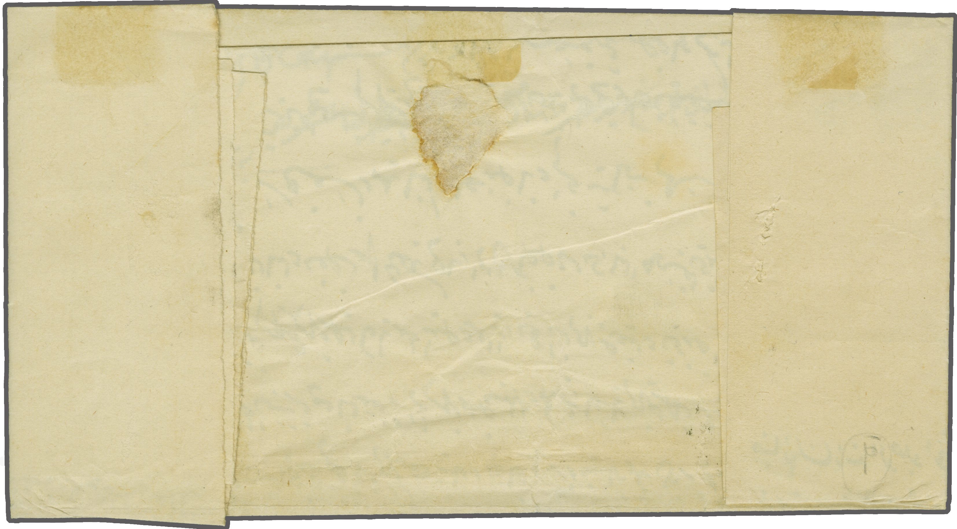 SHUBESI" negative seal handstamps in black (Coles & Walker fig. 139, Ziya fig. 2 - rated 'RRR'). Reverse with "Beyrouth / Turquie" cds (Sept 6), Alexandria cds, London cds (Sept 16) in red and Philadelphia arrival cds; together with early an