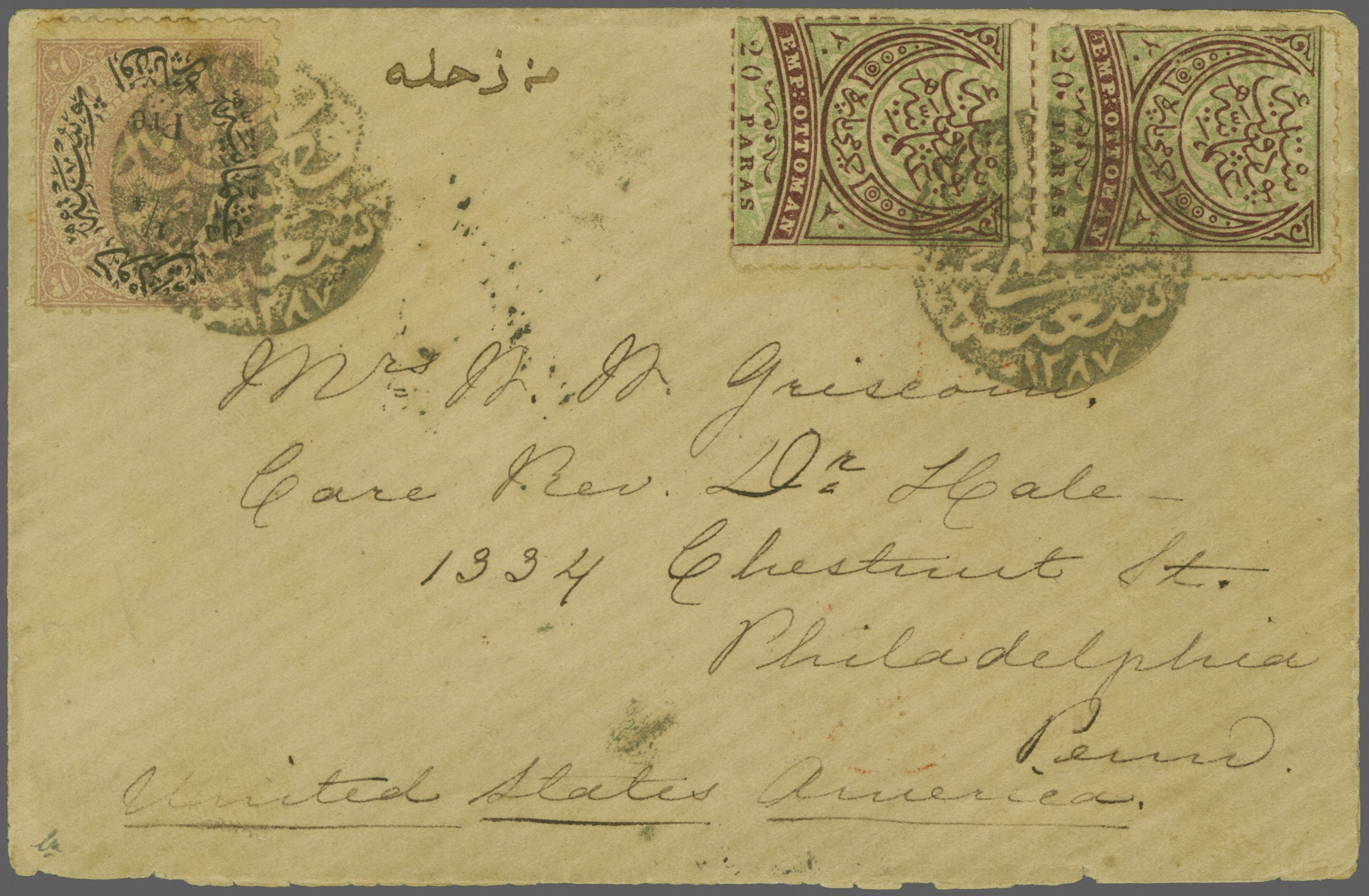 Sanjak of Djebel Lubnan - Zahle / Zahlé 1876: Turkey ¼ pia. on 20 pa. lilac used with 1876 Empire 20 pa. violet on green in a vertical pair on small 1880 cover to Philadelphia, USA at single rate tied by circular "ZAHLE POSTA