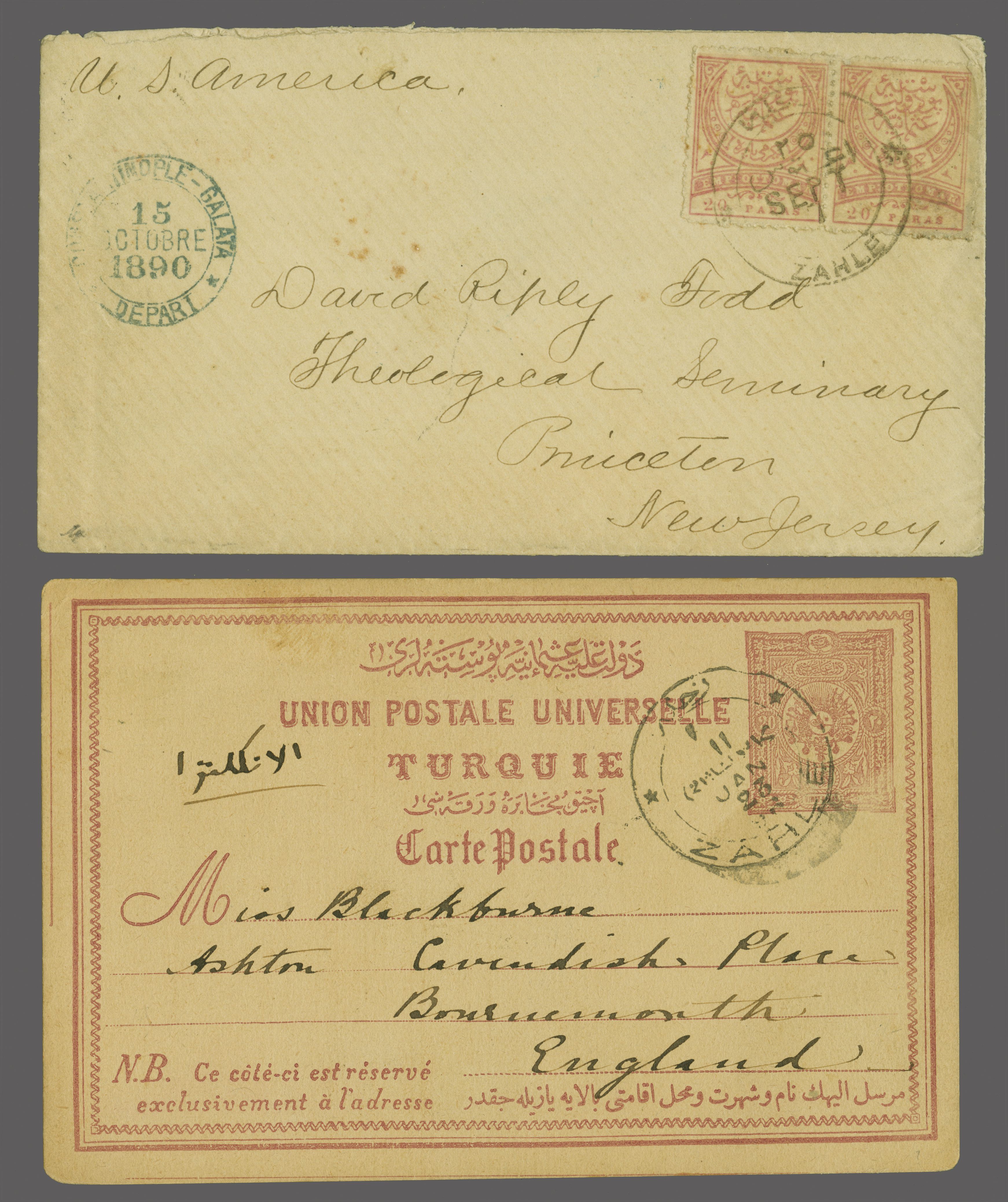 Walker fig. 141, Ziya fig. 3 - rated 'RR'). "Constantinople - Galata / Depart" cds (Oct 15) in blue at left and reverse with New York datestamp and Princeton arrival (Oct 28) in black; together with 1892 20 pa. claret postal stationery card used to