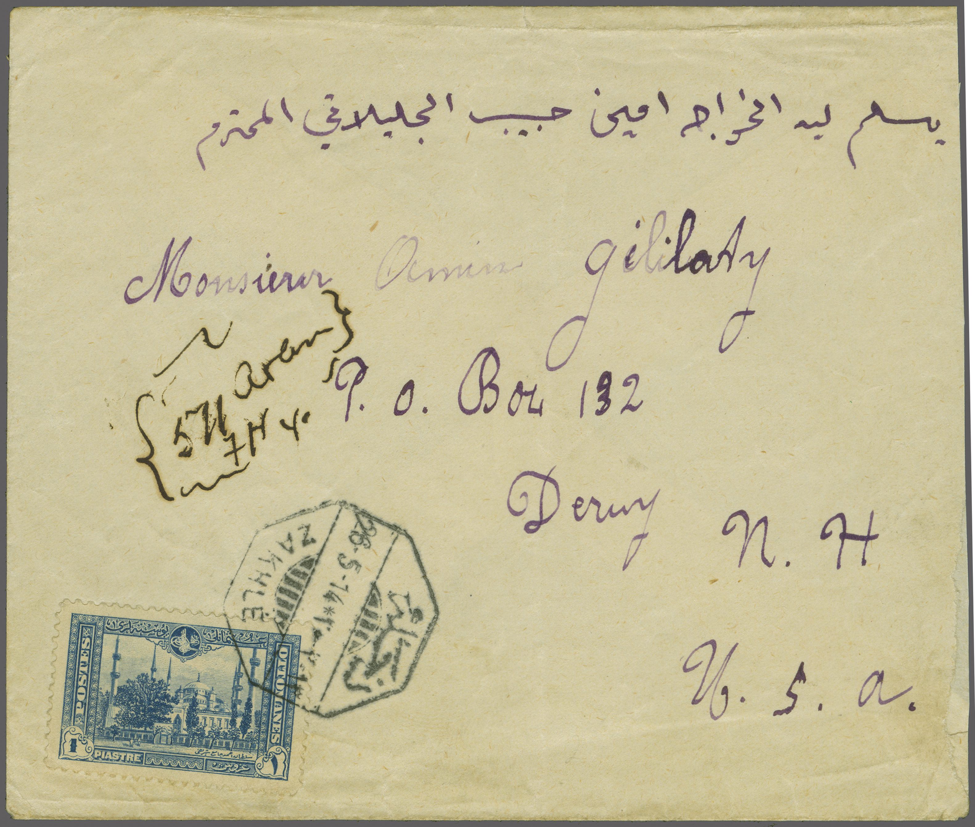 Sanjak of Djebel Lubnan - Zahle / Zahlé 1914: 1 pi. deep blue, used example on 1914 cover to Derry, NH, USA tied by bilingual octagonal "ZAKHLÉ" datestamp (May 26) well struck in black (Coles & Walker fig. 160, Ziya fig. 6