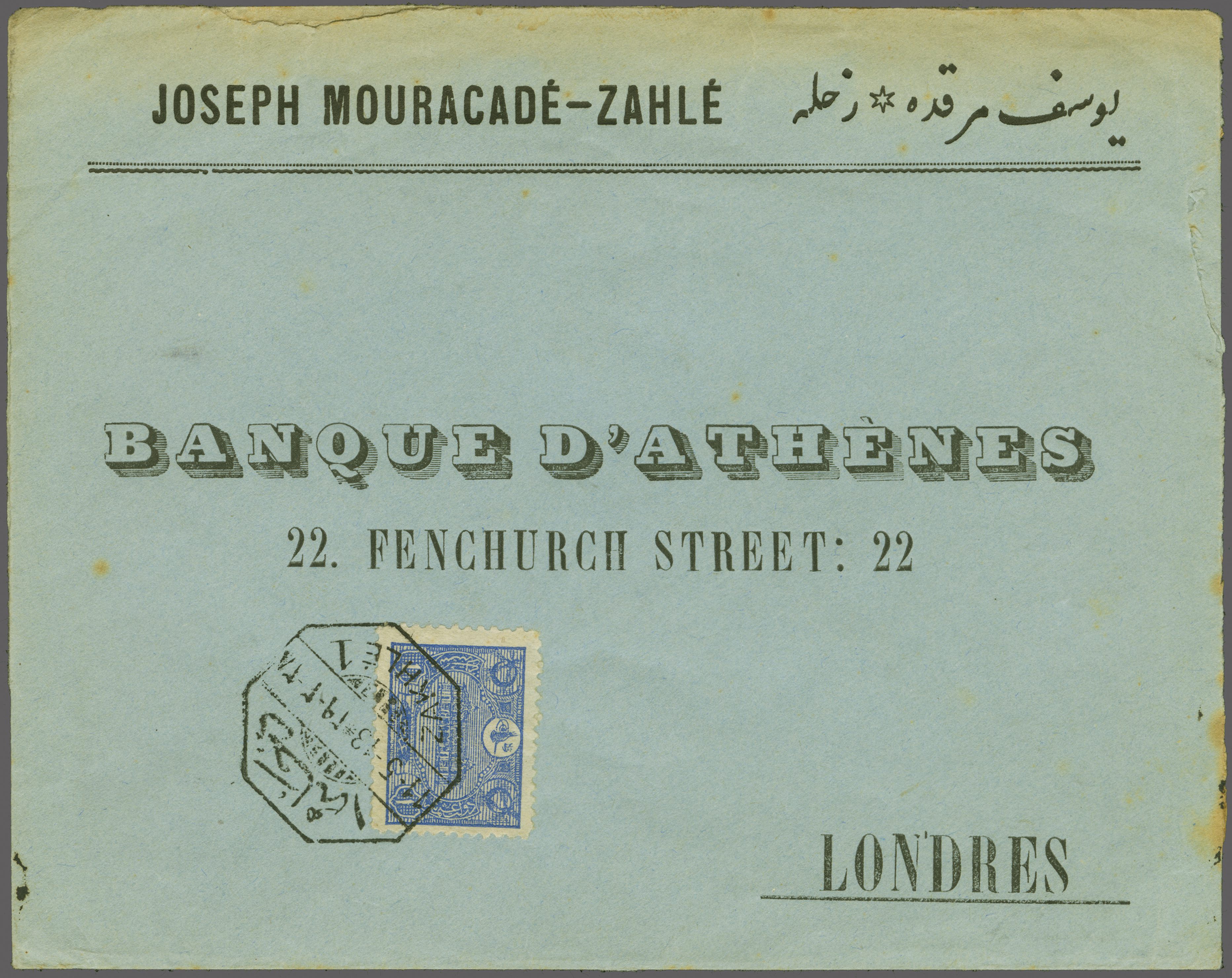 Sanjak of Djebel Lubnan - Zahle / Zahlé 1913: Turkey 1 pi. ultramarine used on printed envelope to London tied by bilingual octaginal "ZAKHLÉ 1" datestamp (May 11) well struck in black (Coles & Walker listed but not