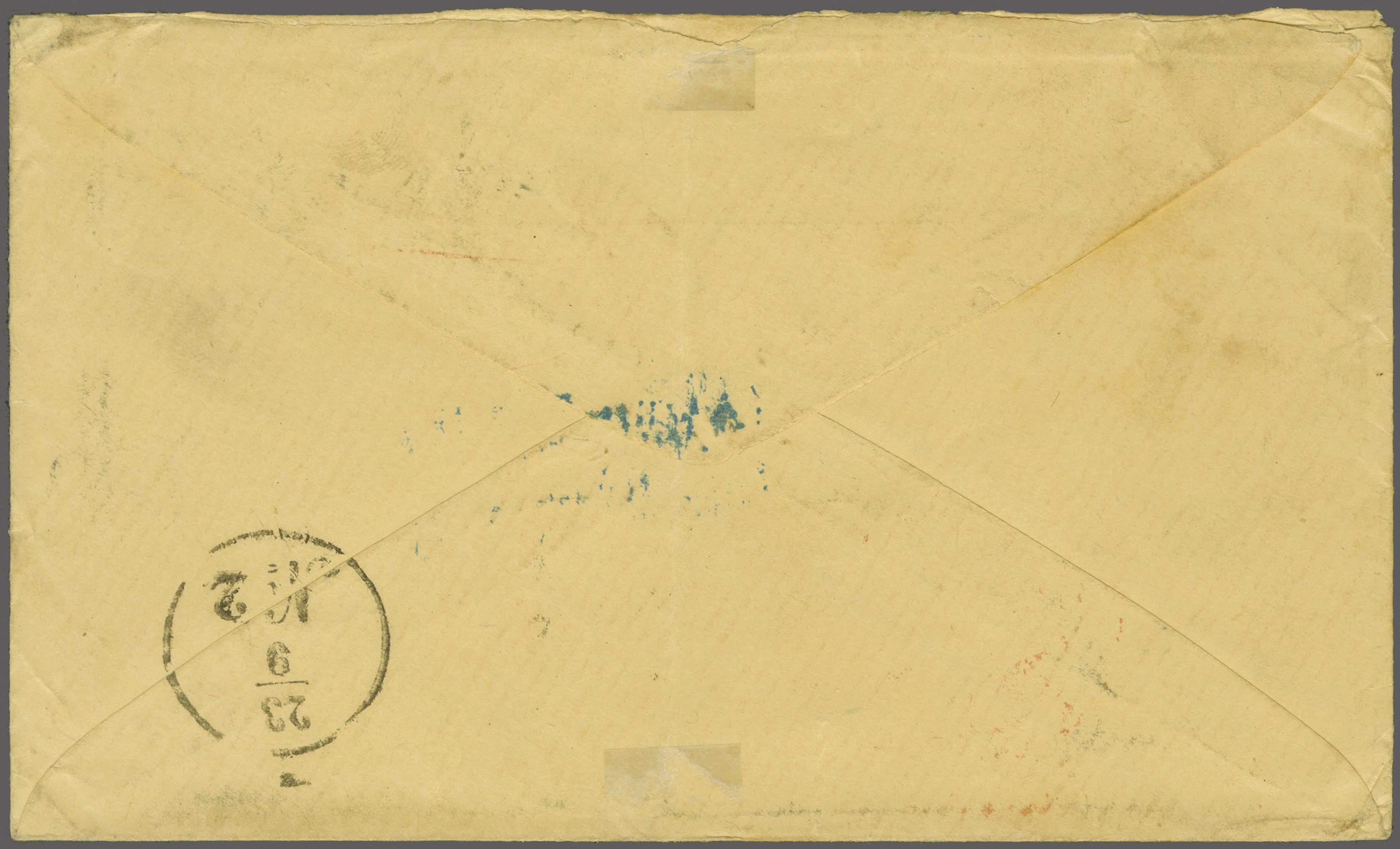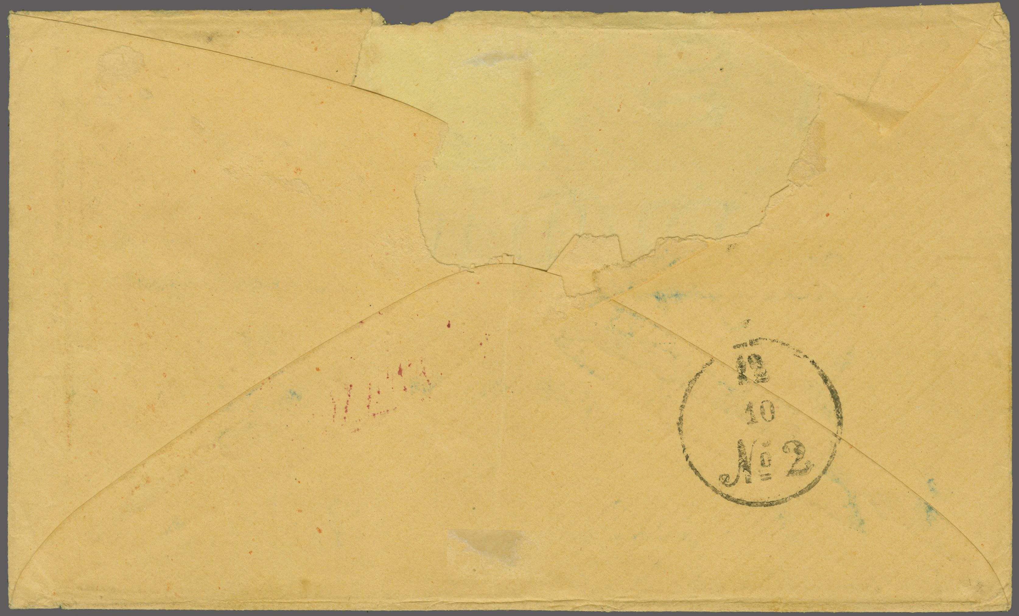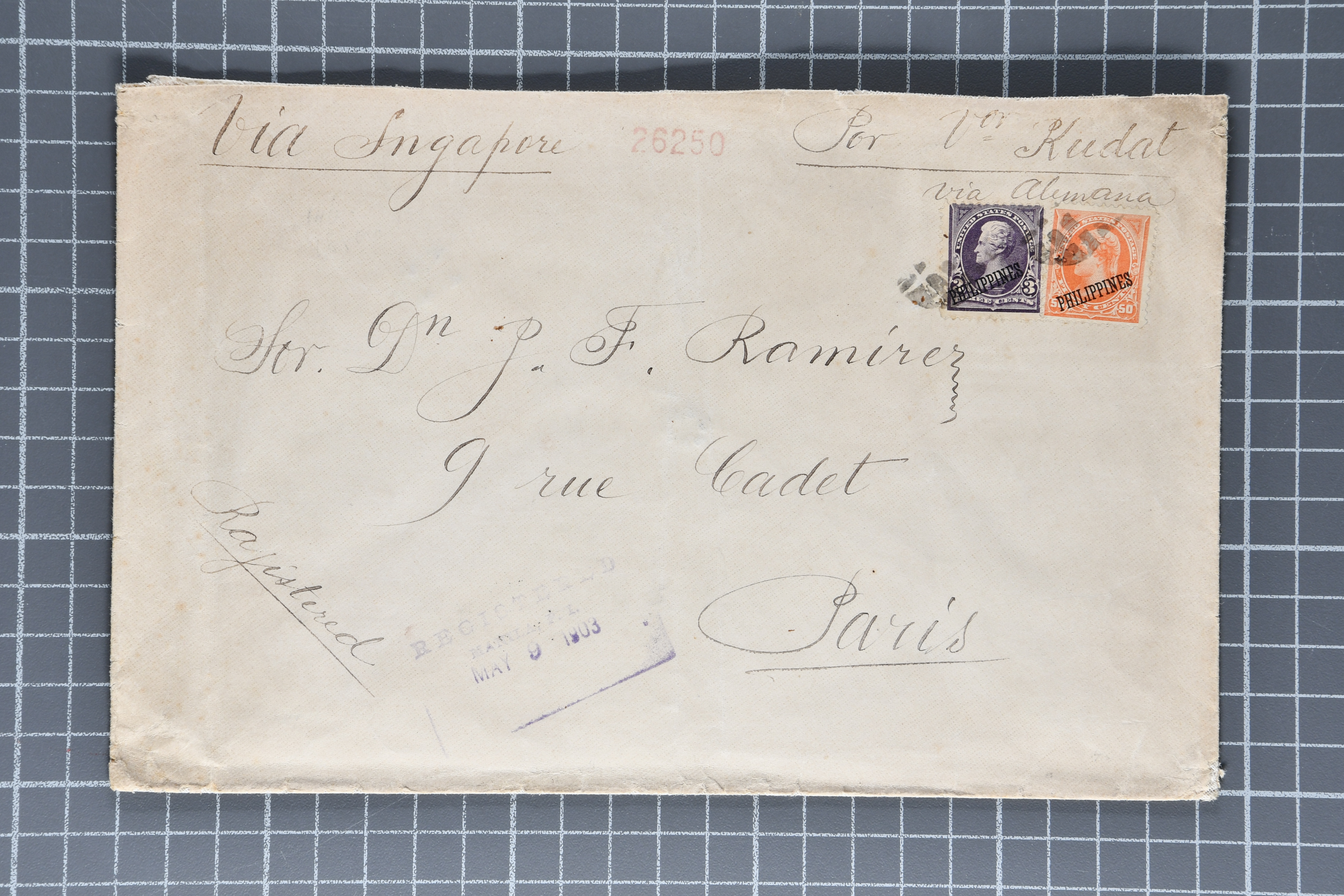 1149 cover imagePhilippines under US administration, 1899: Overprinted 50 c. orange and 3 c. purple used on 1903 registered cover to Paris endorsed "Via Singapore, Por Vapor Kudat, via Alemana", each tied by segmented handstamps in black with framed "REGISTERED / MANILA P.I." datesatamp at left (May 9) in violet. Reverse with Paris arrival (June 10) and handstruck company address for a firm specialising in perfume. Trimmed slightly at top but a rare commercial usage of the 50 c. value Scott = $ 400+ (Image 1)