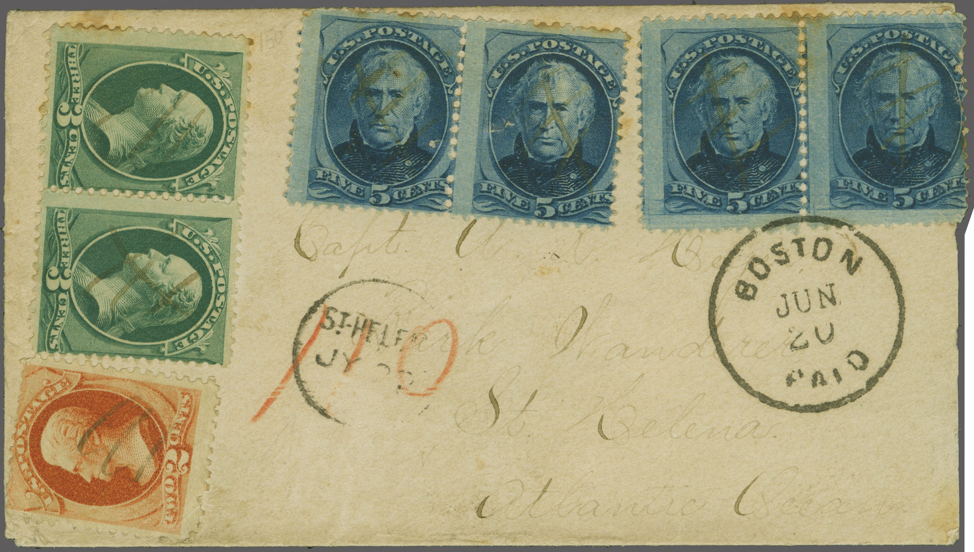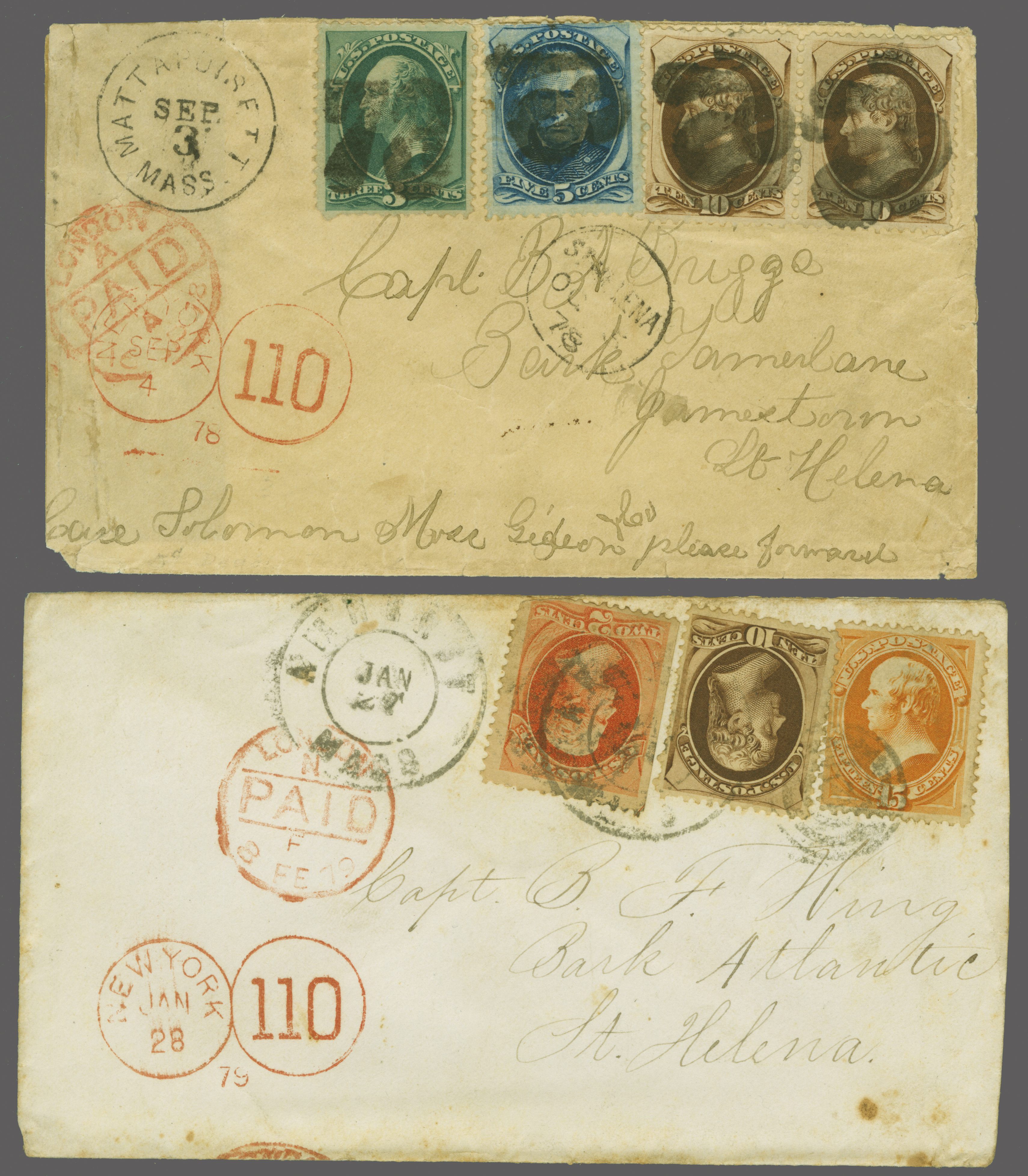 1155 cover image1879: Jackson 2 c. vermilion, Washington 3 c. green horizontal pair in combination with Taylor 5 c. blue horizontal pairs (2), used on circa 1880 Whaling Mail envelope from Boston to St Helena, dated 20 June, cancelled by manuscript pen cancel, the first pair of Taylor tied by BOSTON PAID 20 JUN' cds in black, addressed to ''Captain A.R. Heyer, Bark Wanderer, St. Helena, Atlantic Ocean'', with ST. HELENA JY 22 overwritten by ''110'' (c.) in red, for 11 d. postage due for British share. Reverse, faint London transit cds the dated indistinguishable. Stamps have faults and tone spots to edges. Comes with an accompanying envelope originating in San Diego franked with a tri-colour combination of US (4) at 27 c. rate sent to Captain A. Heyer's wife Myra, Barque Wander, St Helena, underpaid and taxed double rate of 2 s. 8 d. (single rate tax 1 s. 4 d.). Part of lower front missing but stamps mainly fine. Scarce duo of Whaling Mail with heartfelt human interest story attached (see note below) and the pair of covers combine extremely well. Note: Postal charges from the U.S.A. to St. Helena where erratic at this time, the official rate being 27 c. from 1877 to 1885, these covers therefore covered that rate (the Boston cover was overpaid by 1c.) The bark ''Wanderer'' was the last whaling vessel to be built at the Mattapoisett ship yard. It was launched from New Bedford, Massachusetts, in June 1878, thereafter on a four year maiden voyage. Between 1878 and 1924 she carried out over twenty whaling expeditions and went on to appear in the film ''Down to the Sea in Ships'' in 1922 before being wrecked in 1924 on what was intended to be her final journey - the last wooden ship to set sail on a whaling voyage. In Febuary 1881 Myra, the wife of Captain Andrew Heyer, died in childbirth on St. Helena and Captain Heyer left the ship to care for his daughter, who was named Myra after her mother. The Captain returned to Massachussetts from St. Helena when young Myra was eight months old. Reference: Cameo Volume 18, Number 3, Whole Number 102, October 2017, illustrated pg. 220. Provenance: Collection Welch; Markovits and Hogg (Image 1) (Image 2)