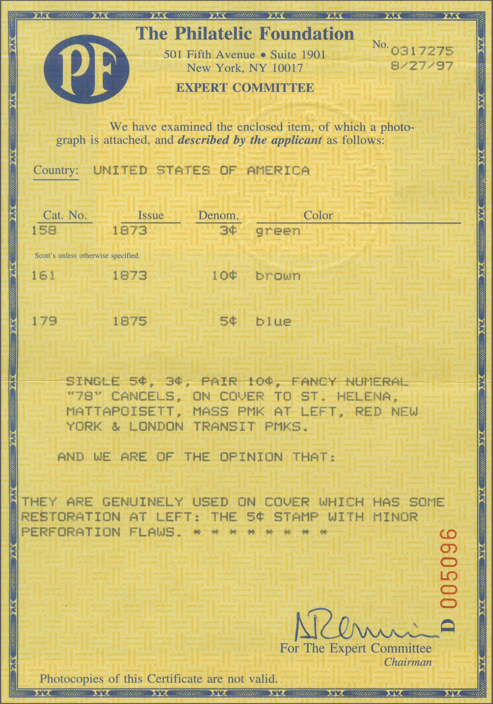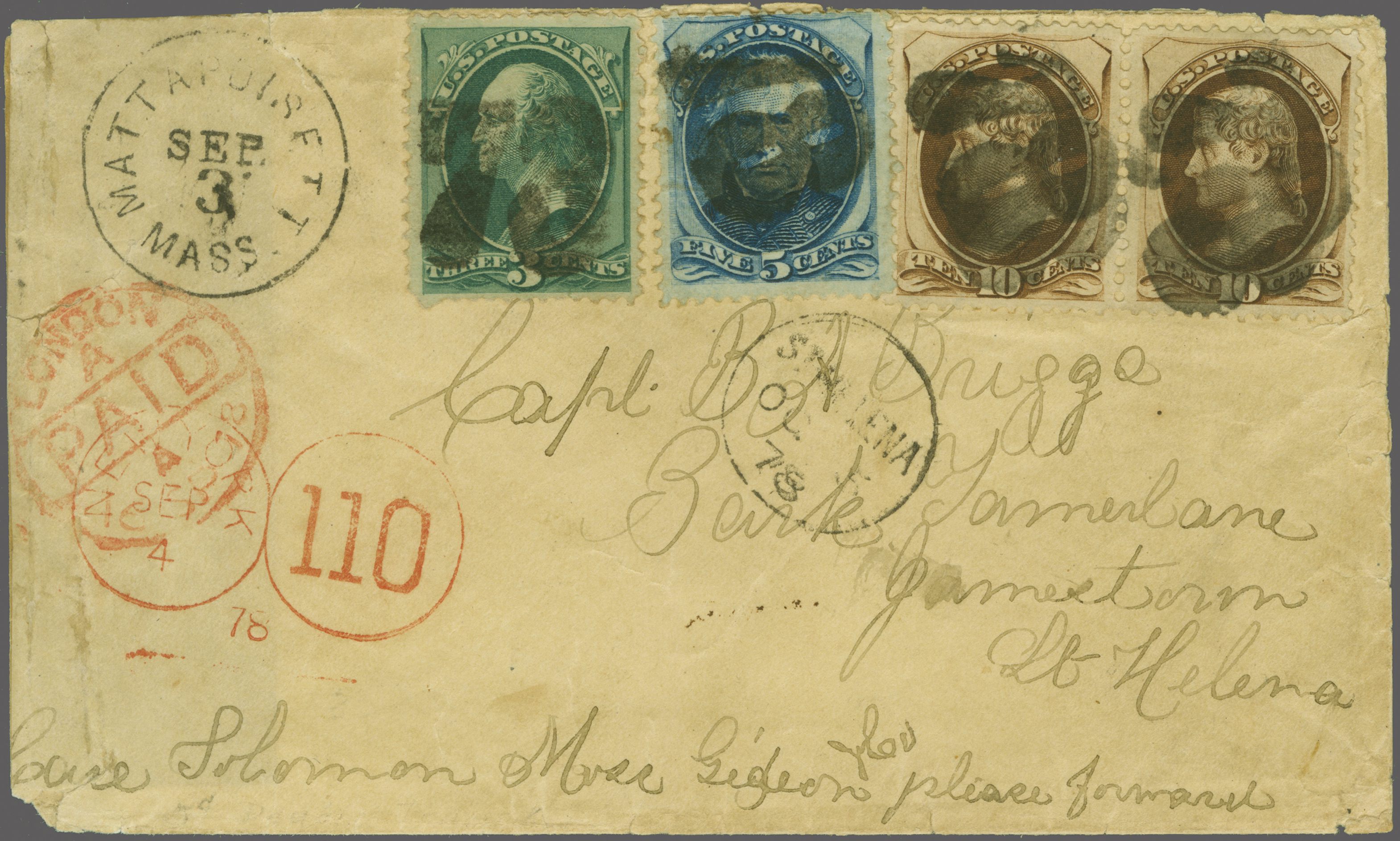 1154 cover image1873: Washington 3 c. green with 1875 Taylor 5 c. blue in combination with horizontal pair 1873 Jefferson 10 c. brown, all fresh vibrant color, used on cover from Mattapoisett (Mass.), USA to St Helena, dated 3 September 1878, tied by Mattapoisett '78' duplex in black, Whaling Mail addressed to Capt. B.A. Brigg, transit double circle in red 'NEW YORK SEP 4 - 110', British PO in red 'LONDON PAID 16 SEPT 78', and arrival cds 'ST HELENA - OC 5 78'. Some tears and wrinkles to envelope, restored slightly on left side. Small perf. fault to 5 c. Otherwise fine and scarce tri-colour combination. Comes with an additional Whaling Mail cover originating from US franked with tri-colour combination addressed to Capt. B. F. King, Bark Atlantic. Has faults but scarce example. Cert. PF (1997) the Brigg's cover (Image 1) (Image 2) (Image 3)