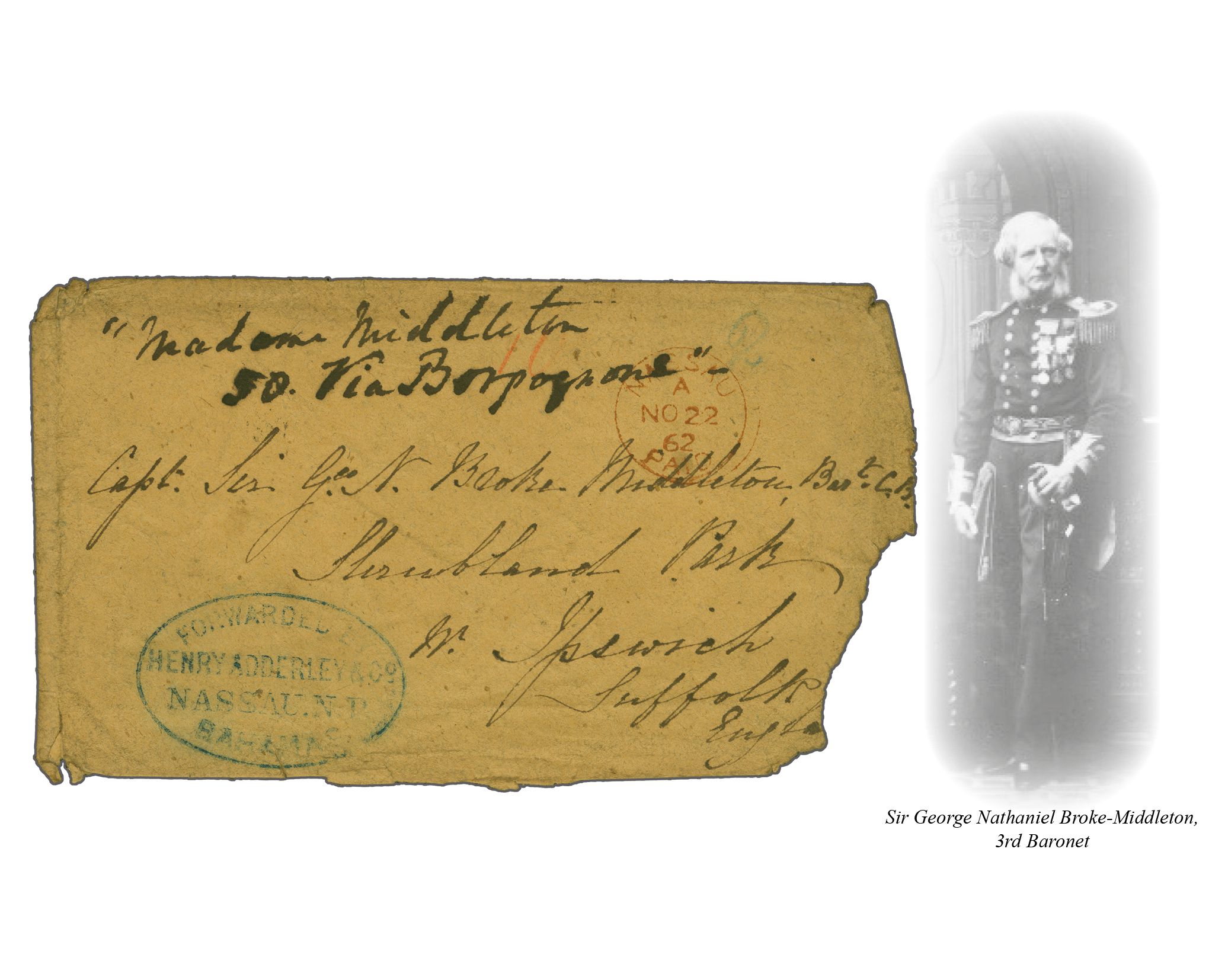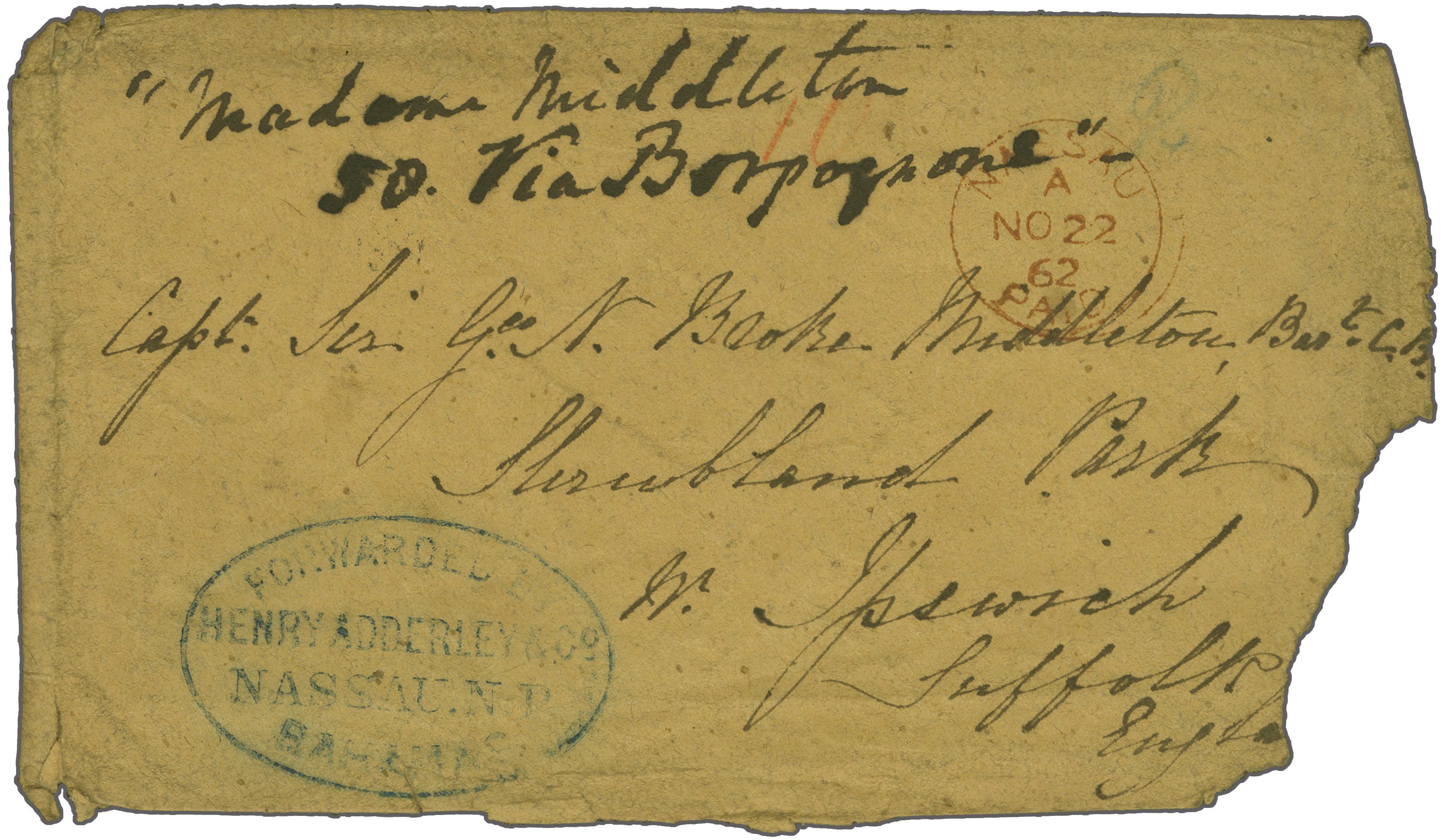 5603 cover imageCivil War 1862: Blockade Run cover from the Confederacy mailed to Capt. Sir George N. Broke Middleton, Ipswich, England with oval framed "FORWARDED BY / HENRY ADDERLEY & Co. / NASSAU N.P. / BAHAMAS" in blue and "NASSAU / PAID" code A circular datestamp in red (Nov 22). Rated with red "10" (cents) in crayon and "2" in blue. Reverse with Ipswich cds (Dec 17) and Needham Market arrival cds of the same day. Cover with some damage but reverse stating in manuscript "Mr. Harry Middleton about his Boy "Hal" - answered in Duplicate" which would indicate that Harry Middleton was in the Confederacy at the time. Note: Capt. Sir George N. Broke Middleton was a man of considerable influence and wealth (at this date he was a retired Rear Admiral and in 1864 was High Sheriff of Suffolk), upon his death his estates were inherited by Lady de Saumarez making her the second largest landowner in London after the Duke of Westminster (Image 1) (Image 2) (Image 3)