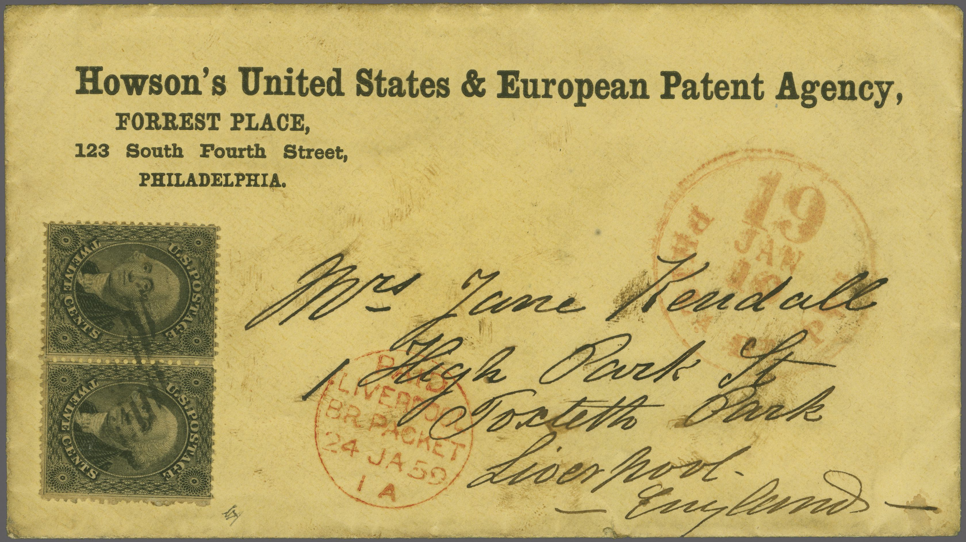 5597 cover image1857/61: 12 c. black, plate I, perf. 15½, a horizontal pair used on 1859 printed cover to Liverpool cancelled by barred obliterators in black, with circular "19 / PHILA. BR. PKT." credit datestamp in red (Jan 10) and carried from Boston by Cunard Steamer "America" with "PAID / LIVERPOOL / BR. PACKET" cds (Jan 24) in red of arrival. Some soiling and opening tear on reverse but scarce Scott = $ 700+ (Image 1) (Image 2)