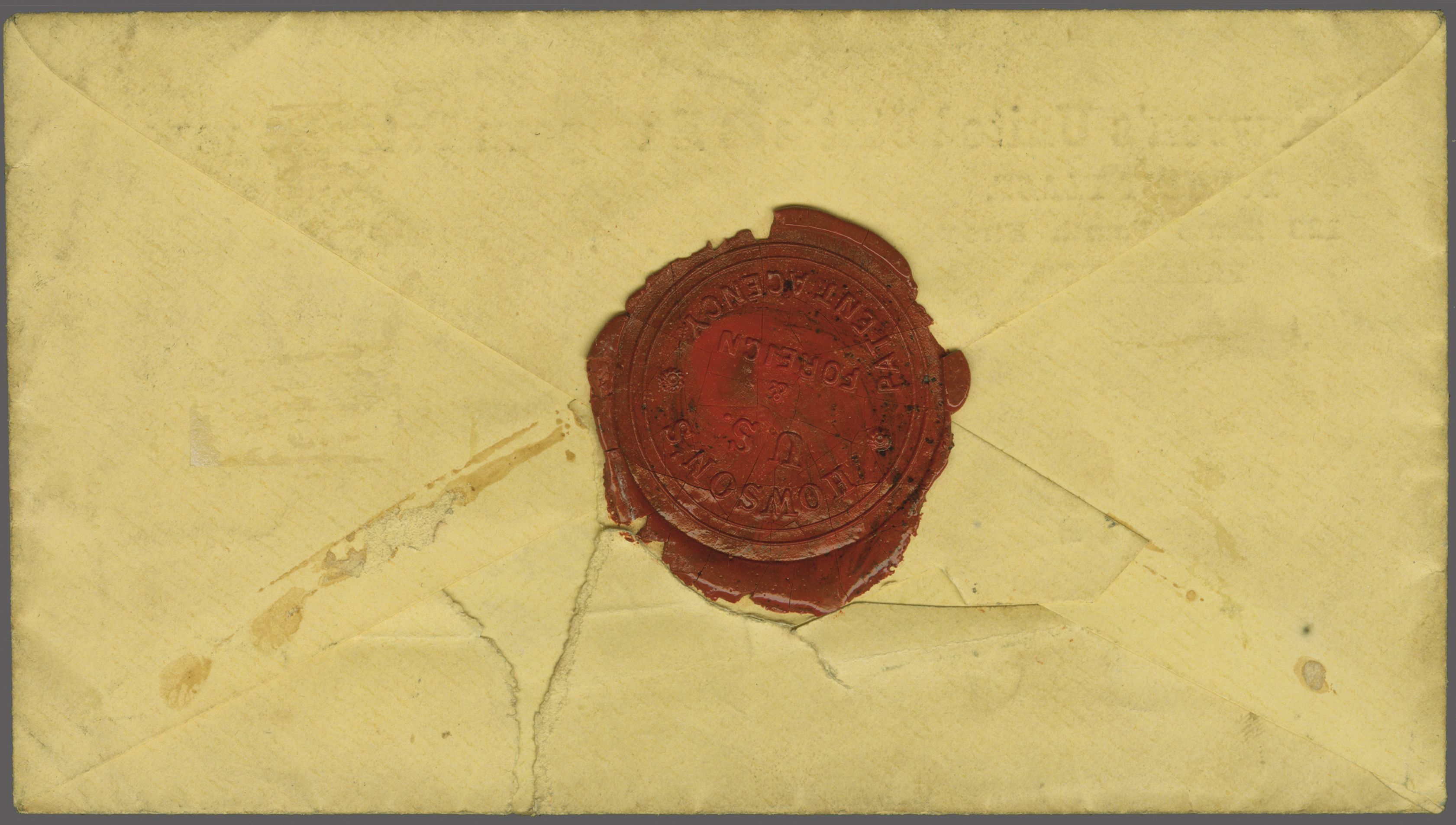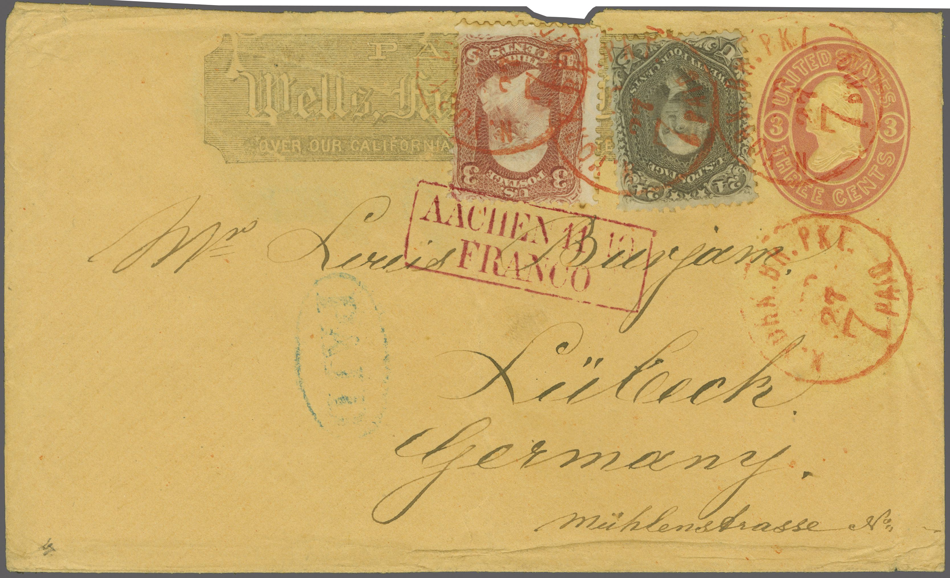 5600 cover image1861/66: 3 c. rose and 24 c. greyish lilac used on Wells Fargo 3 c. pink on yellow postal stationery envelope to Lübeck, with oval framed "PAID" in blue and the adhesives unusually tied by "N. YORK BR. PKT. / 7 PAID" circular datestamps in red (Sept 27) and the 3 c. additionally tied by framed "AACHEN 11 10 / FRANCO" in carmine. Reverse with part flap missing and Lübeck arrival cds (Oct 12) in black. Minor opening tear at top and some age spots but a rare usage (Image 1) (Image 2)