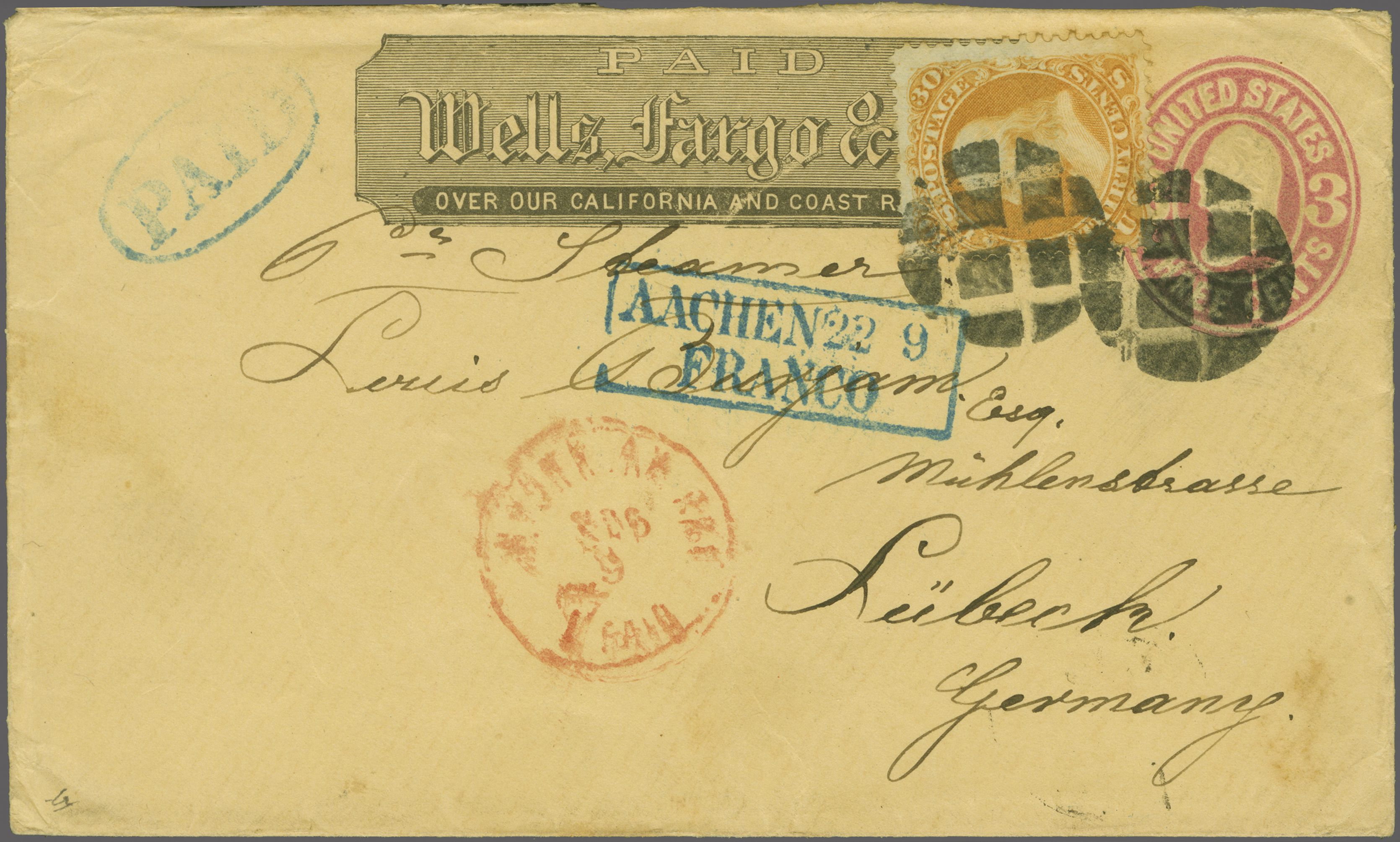 5599 cover image1861/62: Franklin 30 c. orange, a used example on Wells Fargo 3 c. pink postal stationery envelope to Lübeck, tied by segmented cork handstamps in black. Oval framed "PAID" in blue at left, circular "N. YORK. AM. PKT. / 7 PAID" in red (Sept 9) and framed "AACHEN 22 9 / FRANCO" in blue. Lübeck arrival on reverse (Sept 23). Slightest aging on perfs. but a charming and scarce usage (Image 1) (Image 2)
