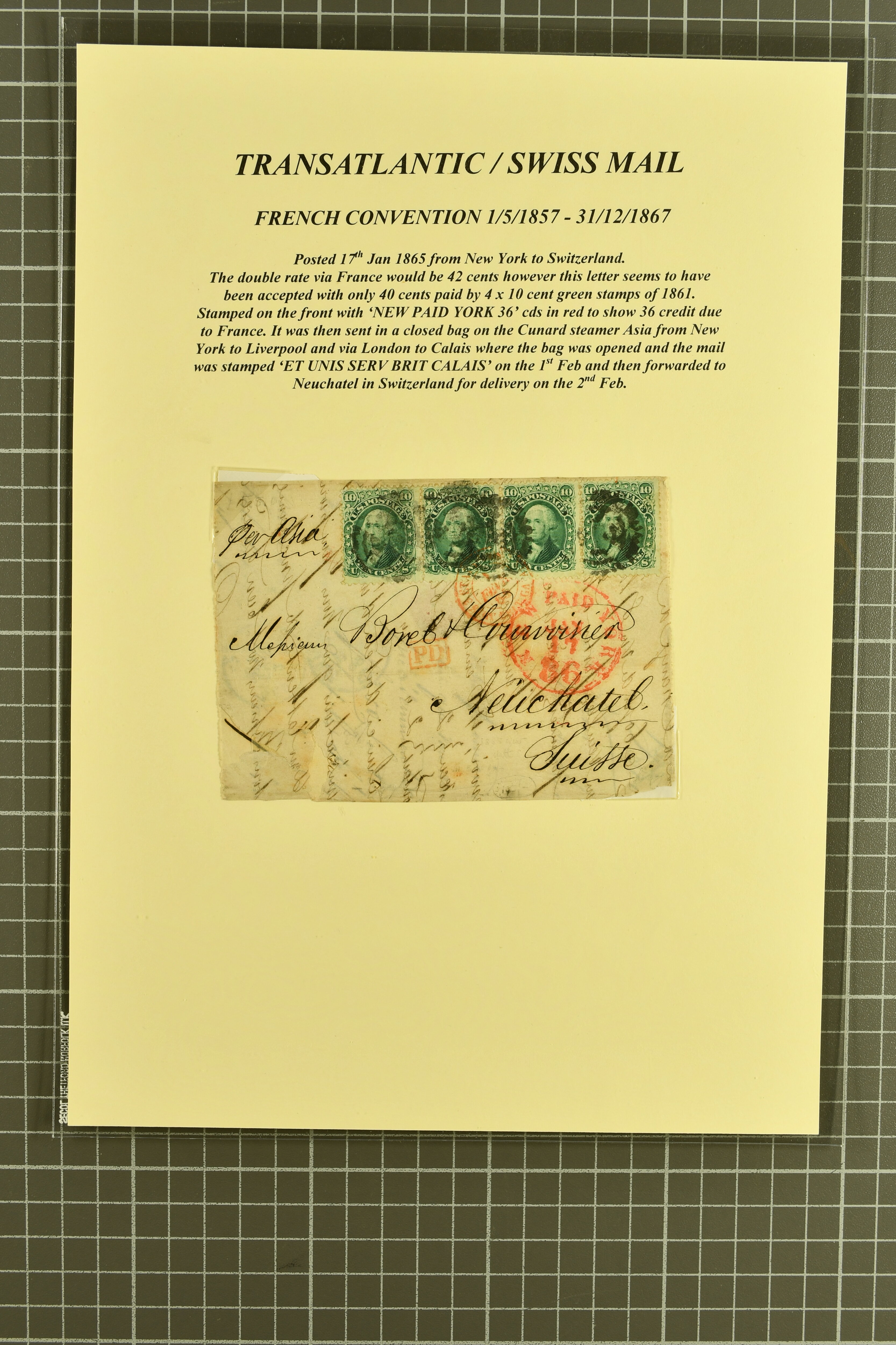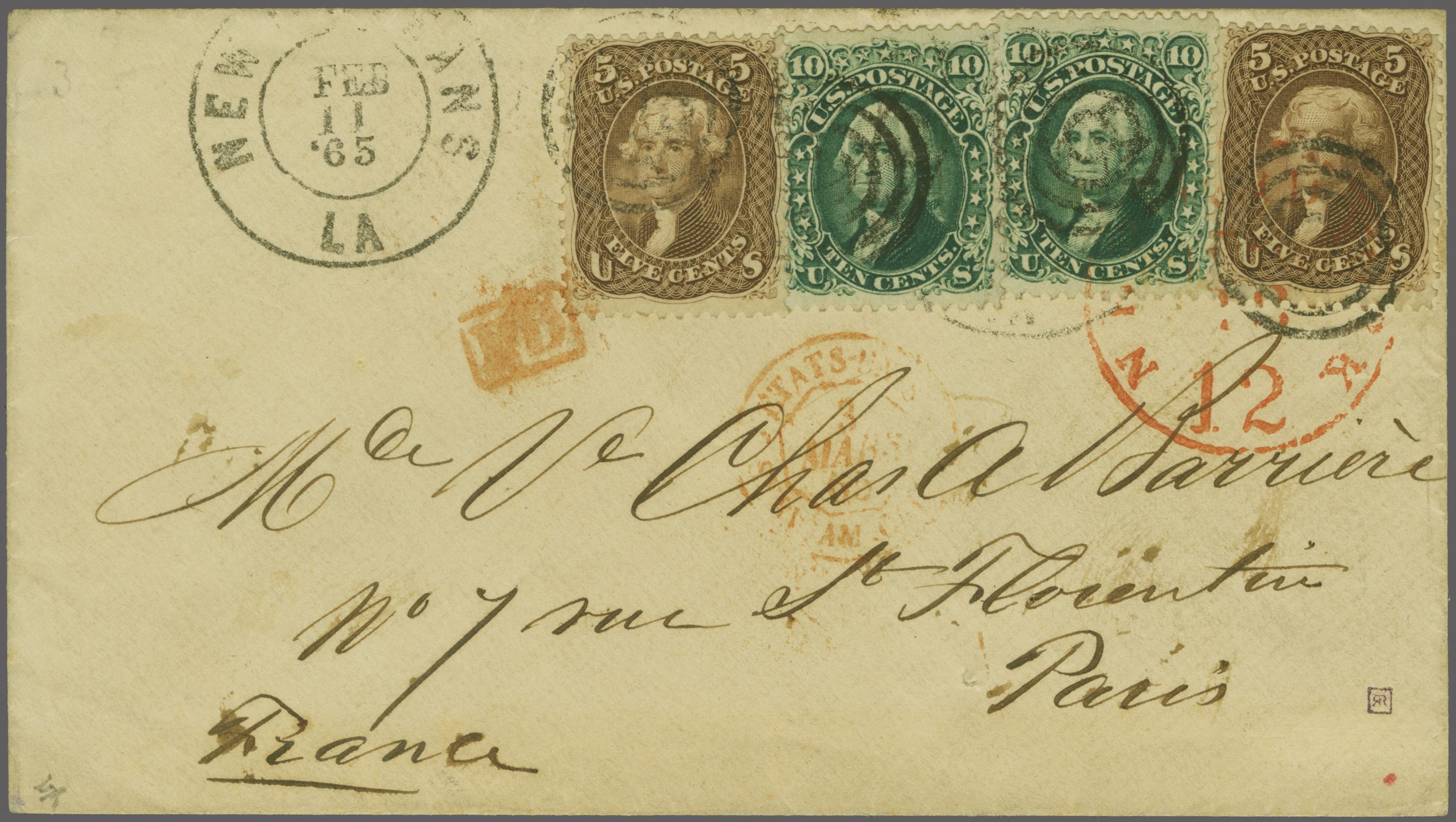 5598 cover image1861/66: 5 c. brown (two examples) and 10 c. green (two examples) used on 1865 cover to Paris, France all tied by concentric ring handstamps with NEW ORLEANS despatch cds (Feb 11) in black at left. "New York / 12" (cents) credit datestamp in red (Feb 16) with "Etats-Unis" entry marking in red (March 3). A fine and fresh cover (Image 1) (Image 2)