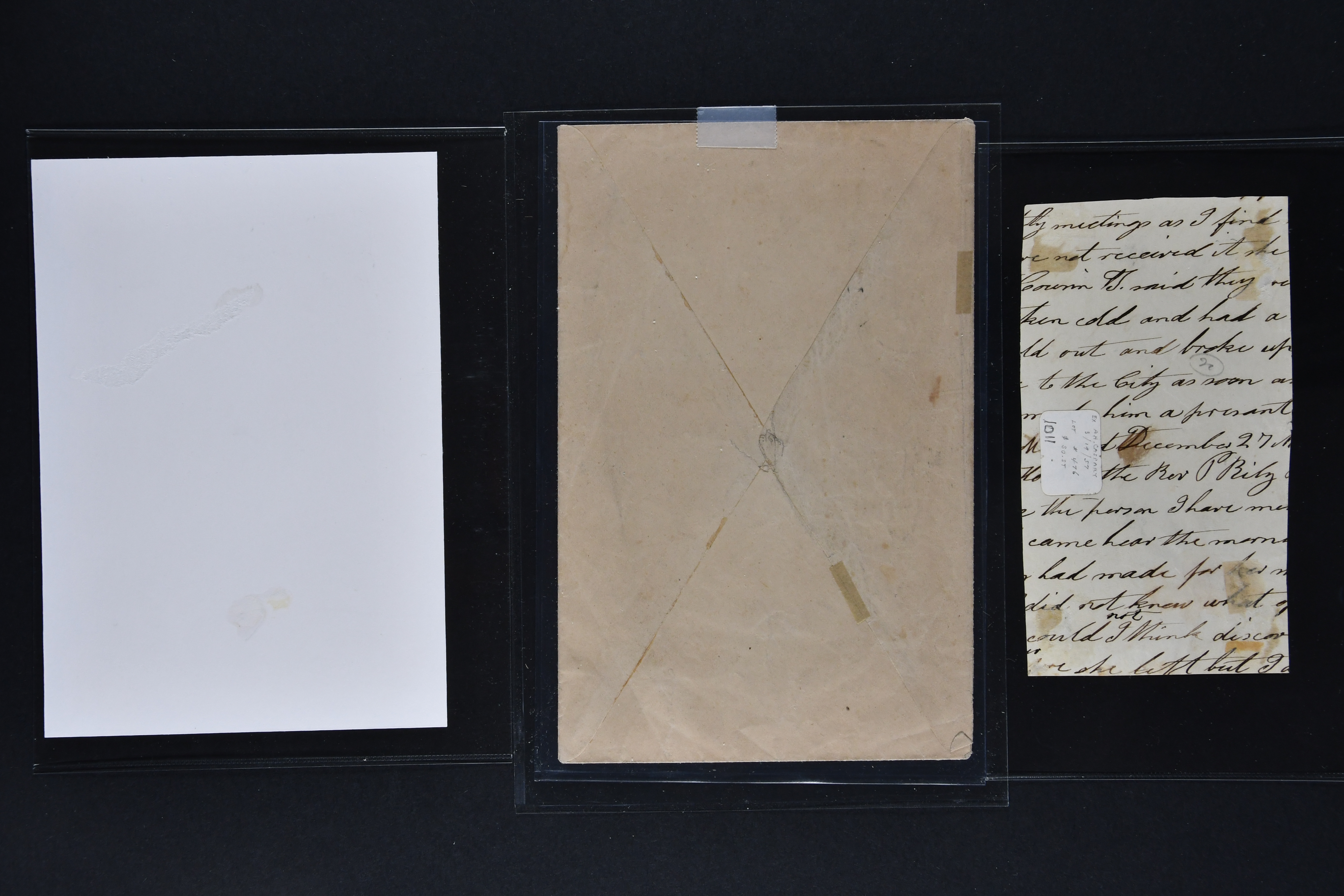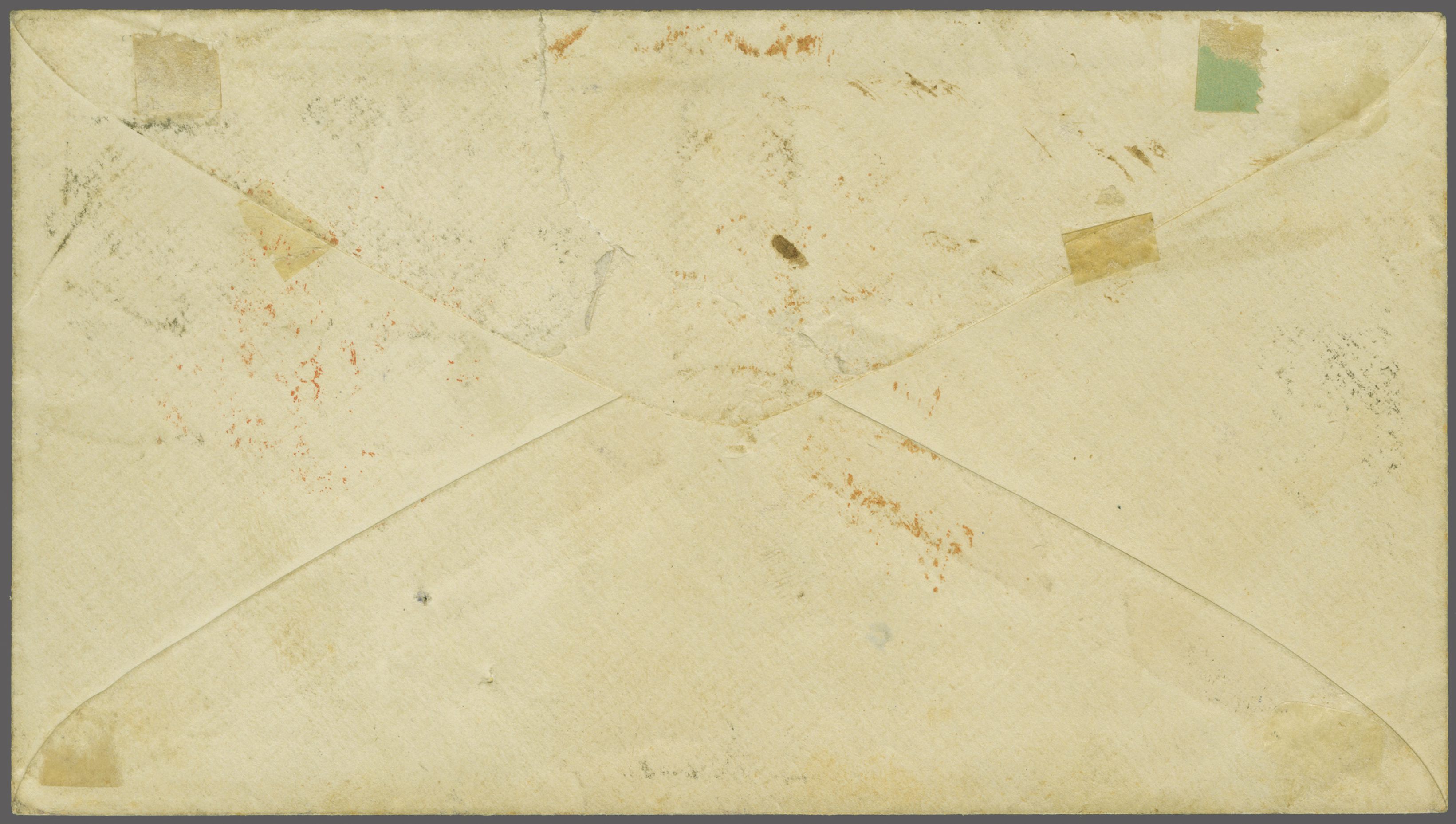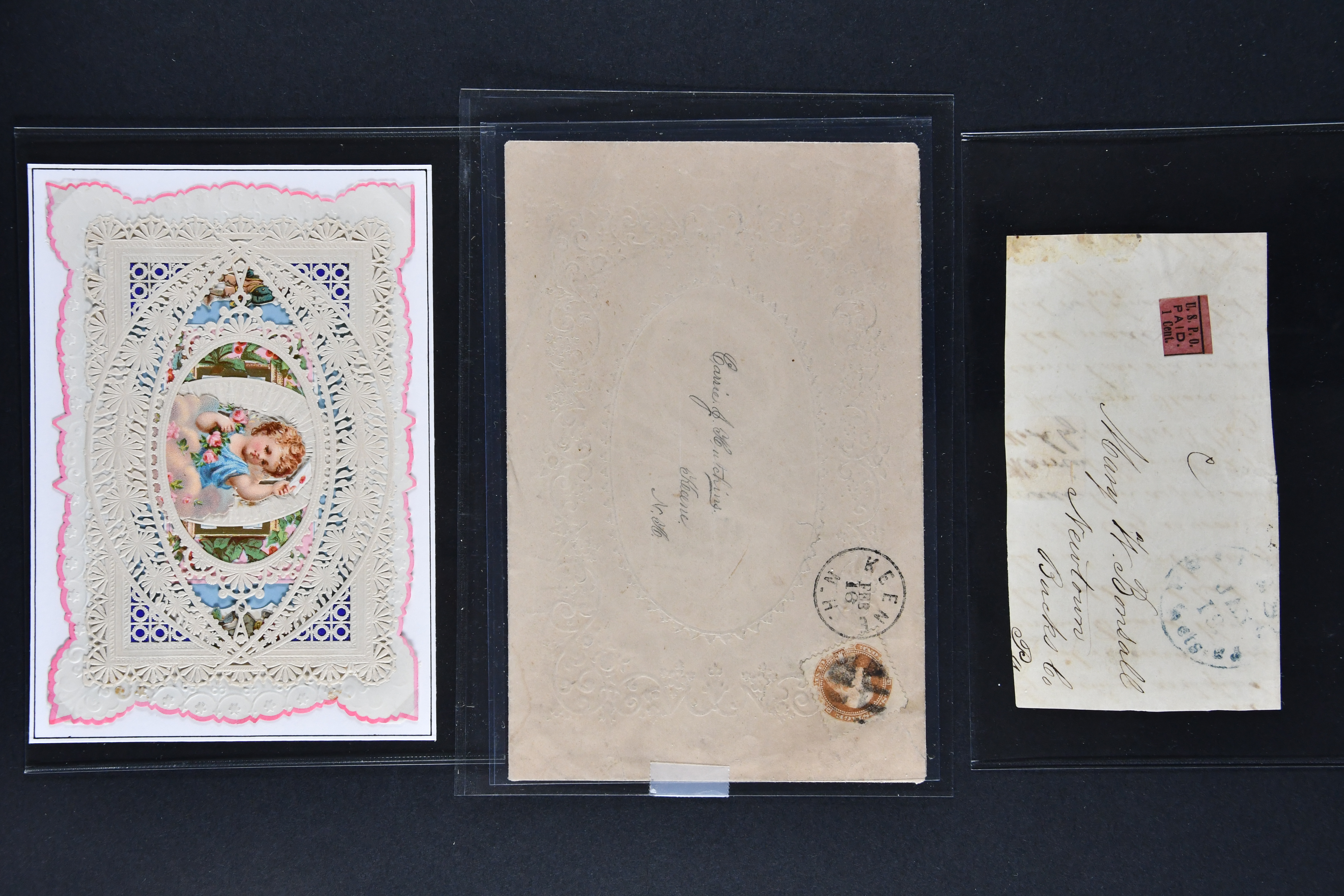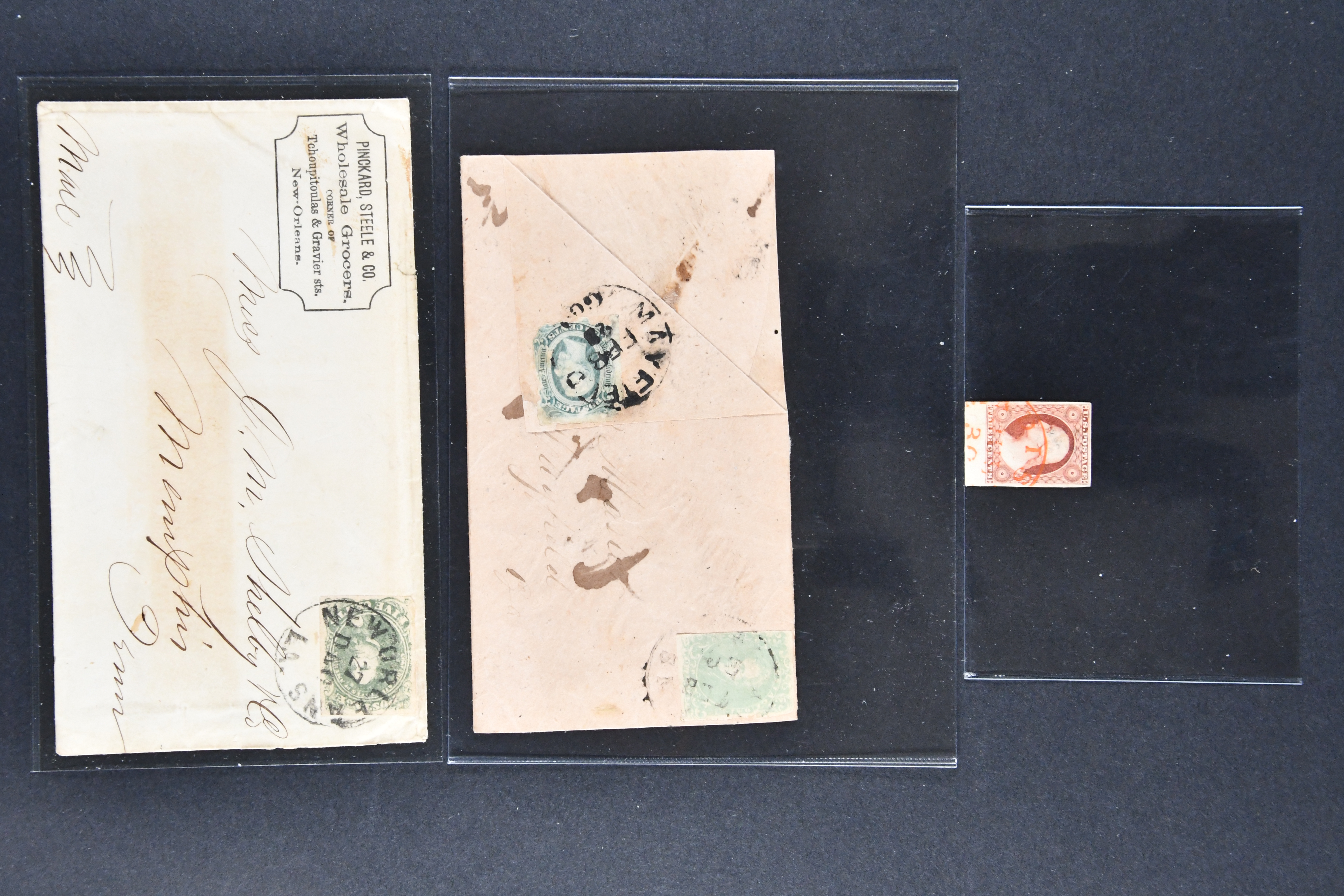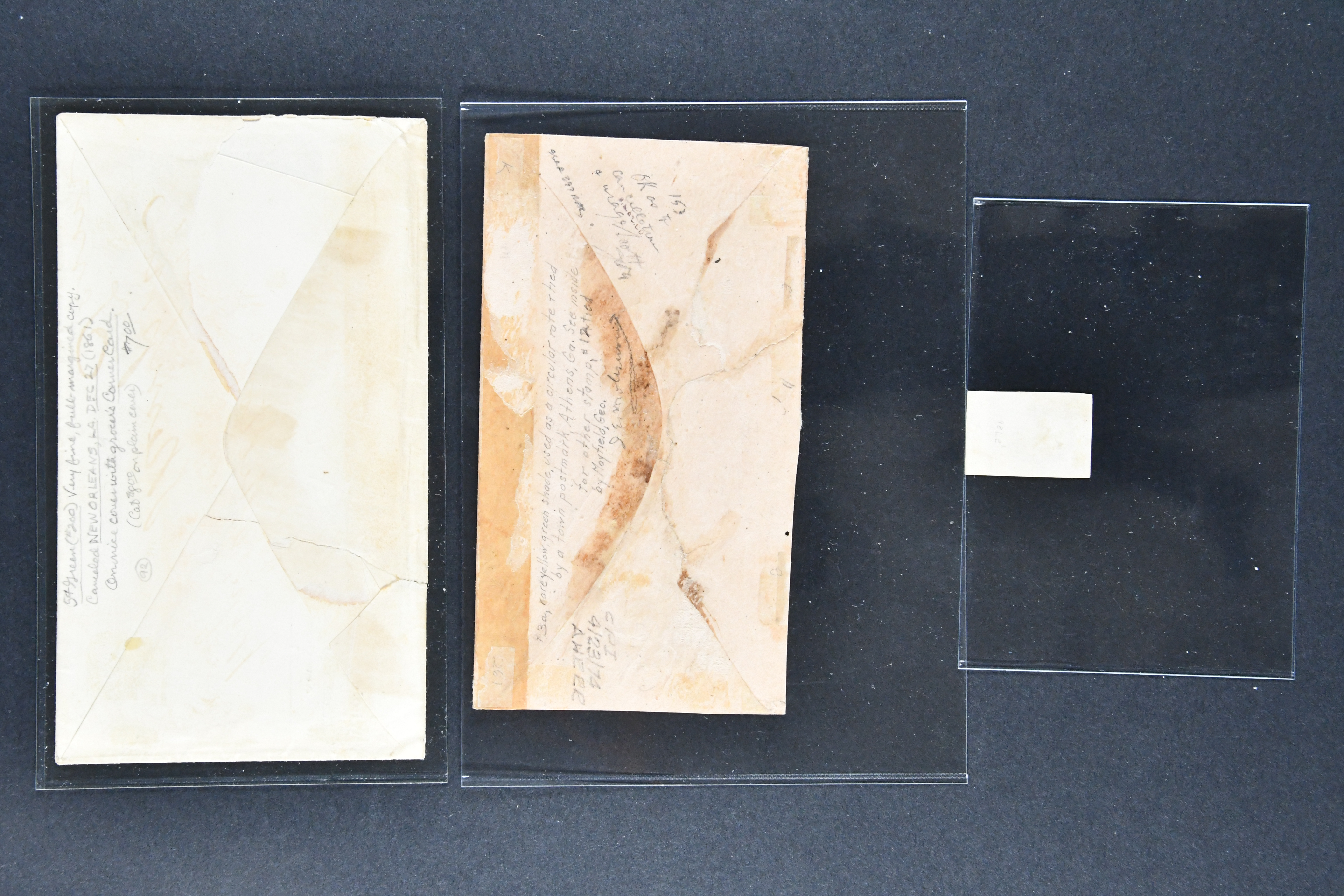 1153 cover image1849/69: Group (5 items) with 1849/50: "U.S.P.O. / PAID / 1 Cent." black on rose Carrier label, imperforate, used on cover front to Newton, Bucks Co., PA with "PHILADELPHIA PA / 5 cts." circular datestamp in blue (Jan 19) at right (ex Collection Caspary); USA 3 c. orange-brown, Type II, imperf. marginal example (pos. 98 L2L) superb (Scott 10A), 1869 1 c. buff used on local Valentine's embossed envelope tied by "KEENE / N.H." circular datestamp (Feb 16) with complete Valentine multicoloured lace insert, Confederate States: 5 c. yellowish-green 1861, Stone 1, a fine large margined example on 1861 advertising corner envelope (Pickard & Steele & Co. / Wholesale Grocers) to Memphis tied by "NEW ORLEANS / LA." cds (Dec 27) in black; 1862 2 c. pale yellow-green used example on cover to Mayfield tied by "ATHENS / Ga." cds for circular rate; the cover turned and re-used franked by 1863 10 c. blue, sensibly folded to show both uses - the 2 c. being a very rare stamp on letter and especially so in this shade. Signed Molesworth on reverse (Image 1) (Image 2) (Image 3) (Image 4)