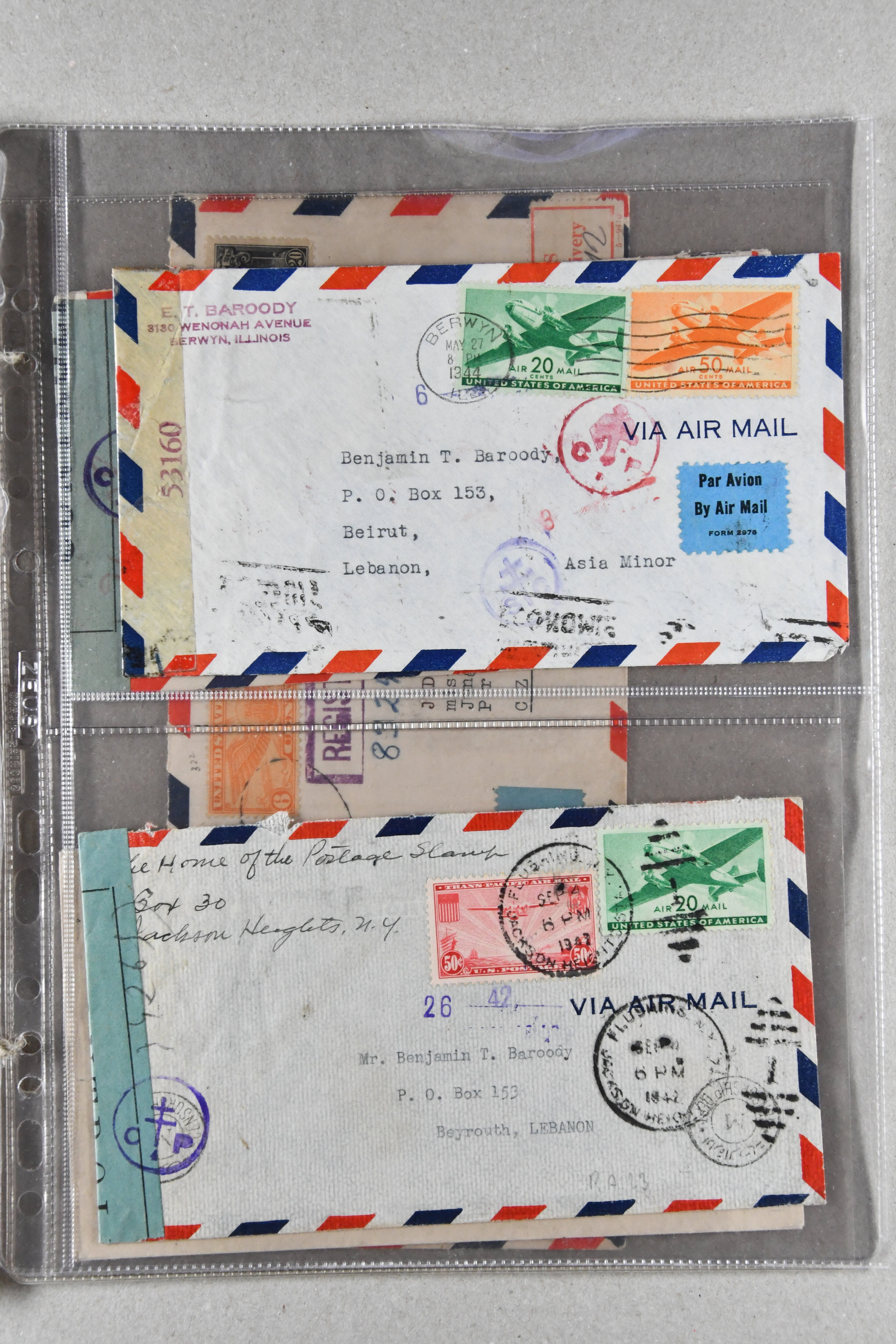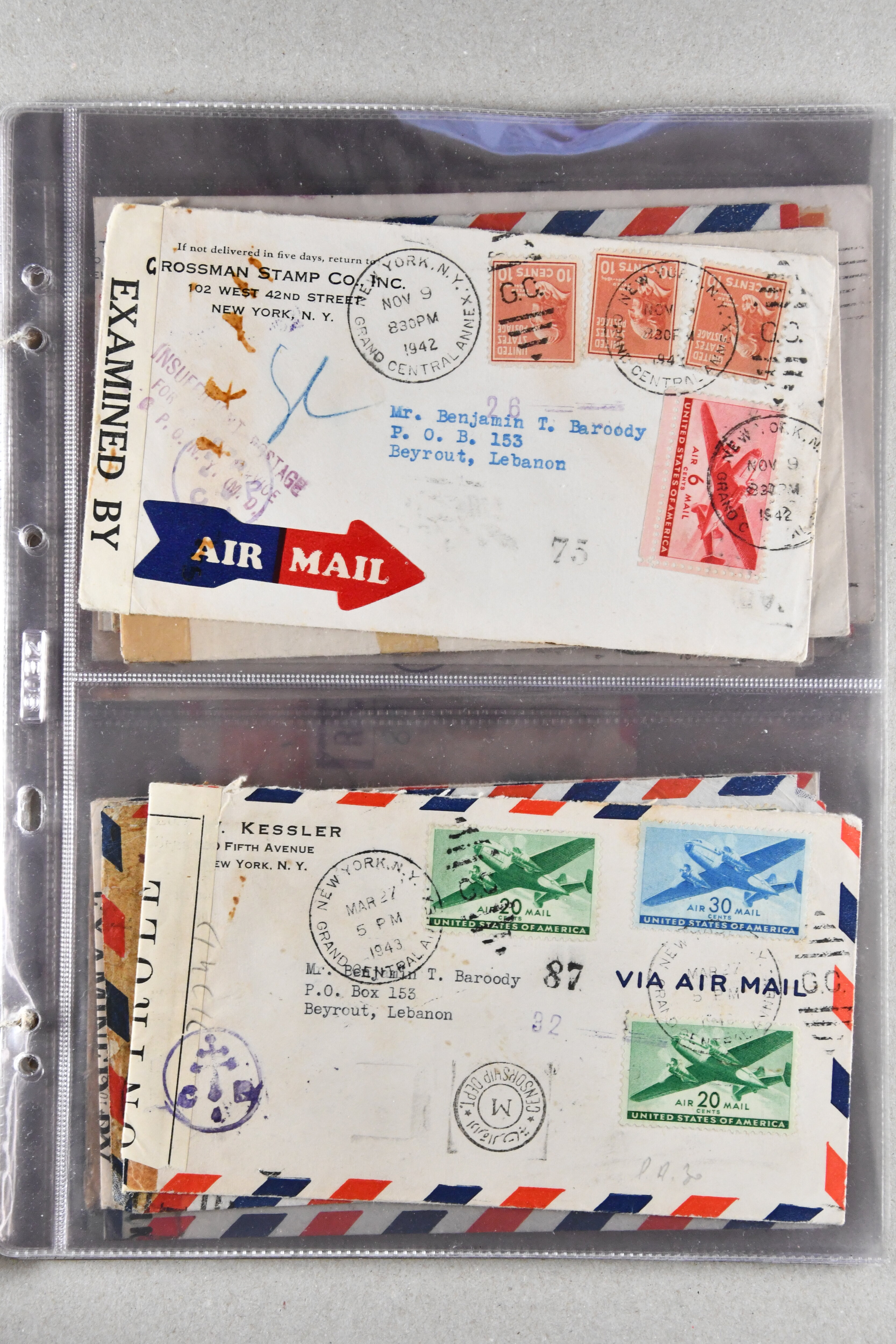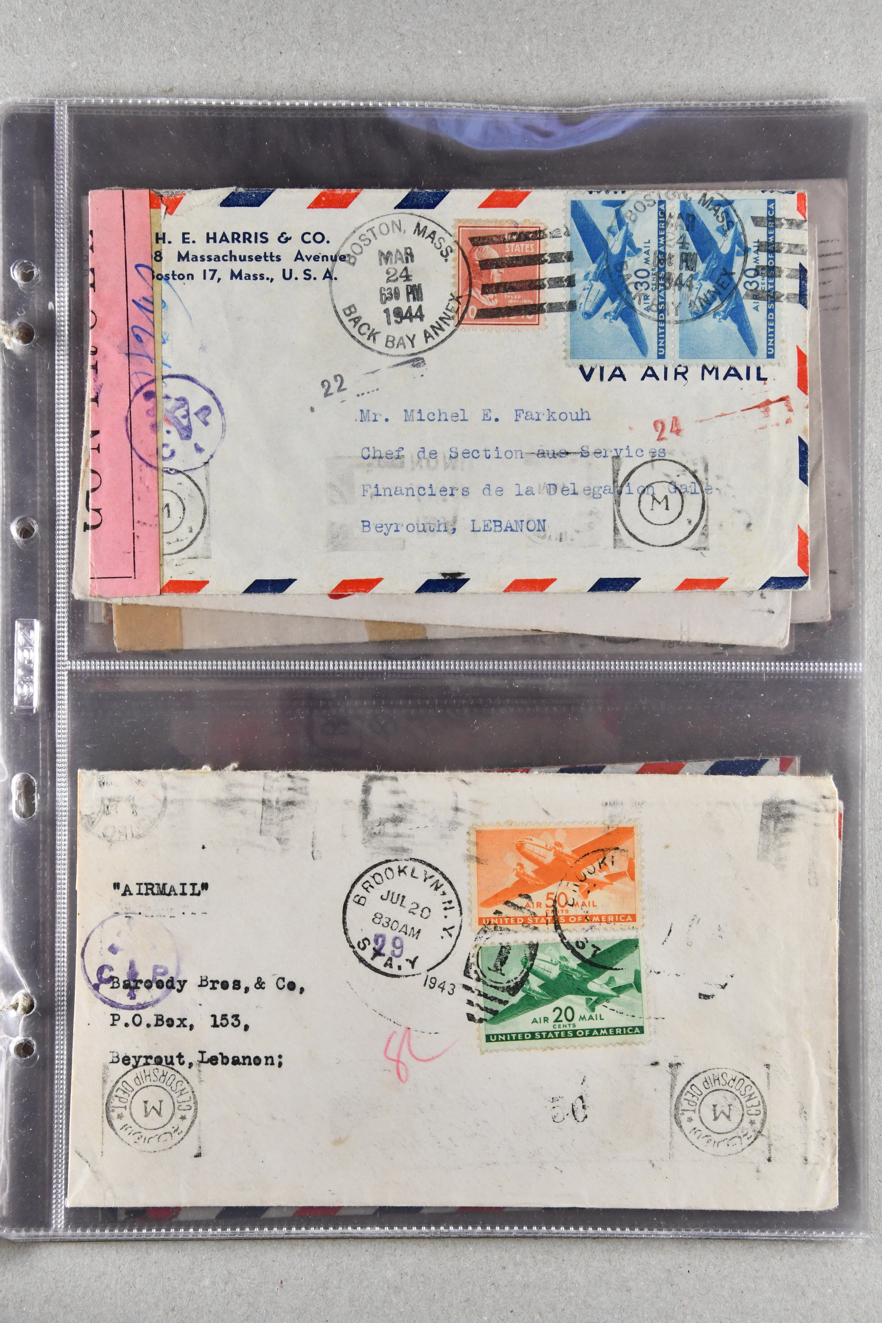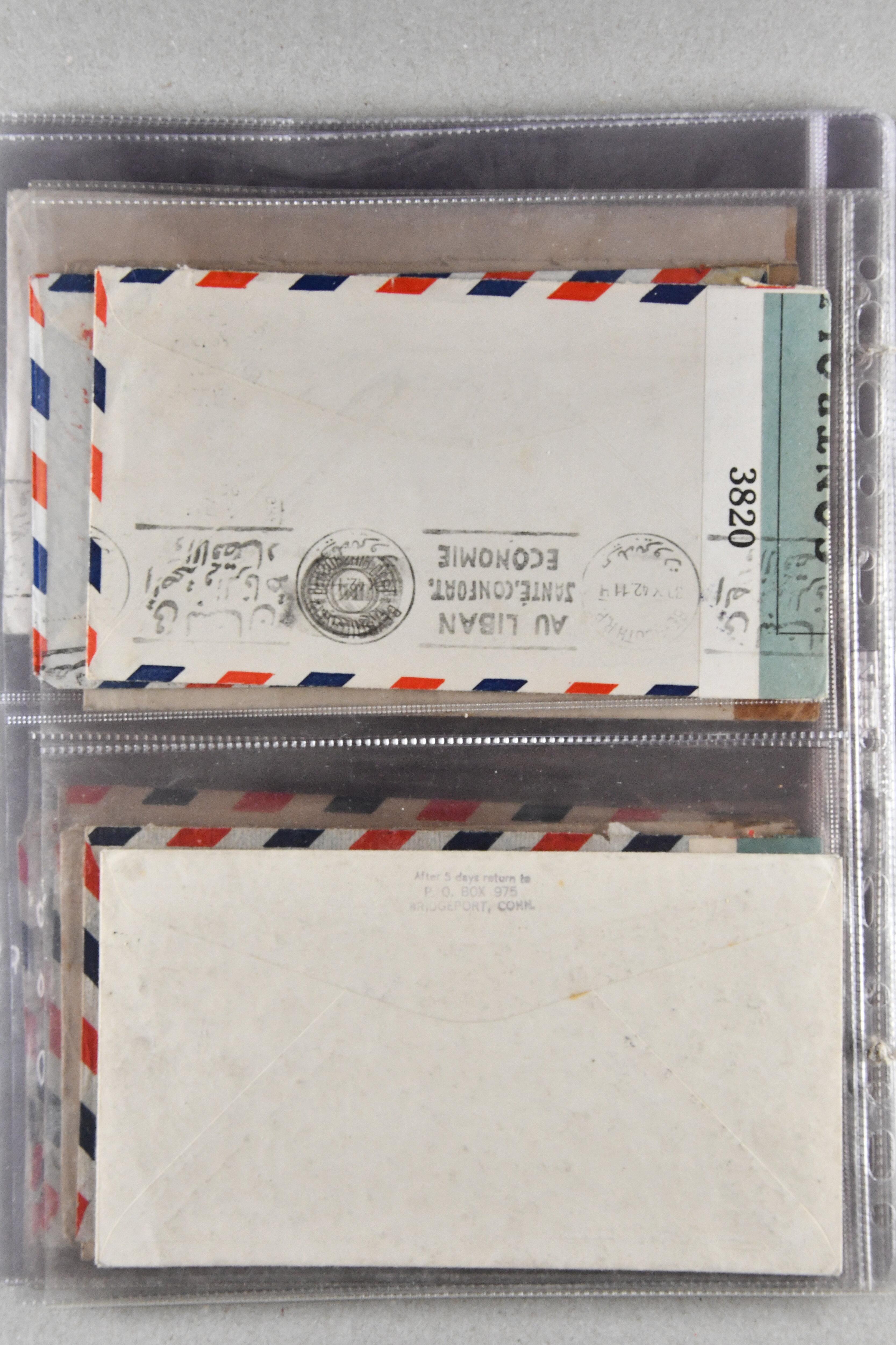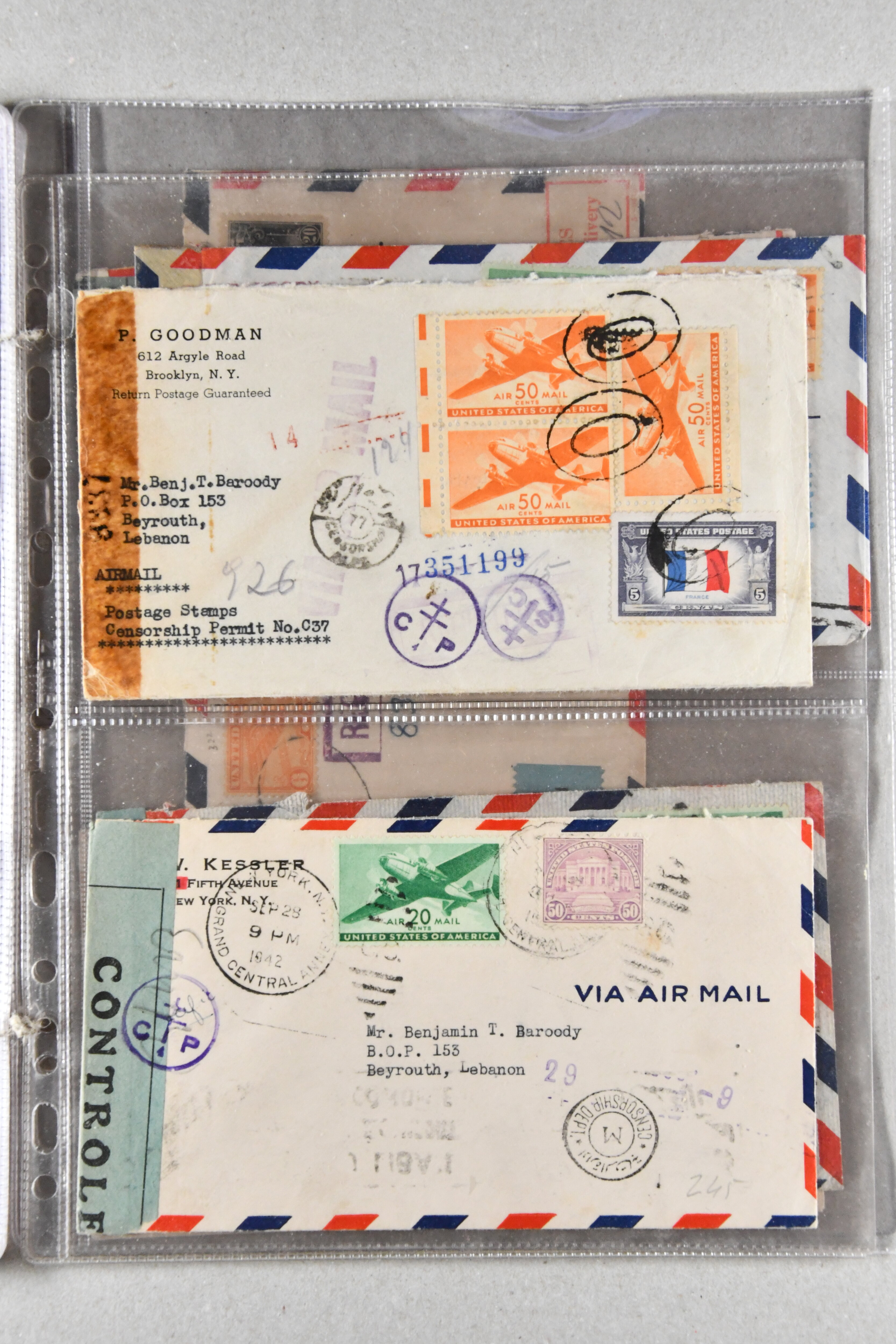 1156 cover image1938/44: United States WWII Airmail to Lebanon and Europe. Lot of 25 airmail covers, franked with a variety of US airmail and definitive issues of the period, showing a broad range of rates and combinations. 23 covers addressed to Beirut, Lebanon, plus 1 to Germany and 1 to Czechoslovakia. Nearly all covers show wartime censor markings or resealing labels, including US and foreign censor handstamps/tapes. Clear strikes of Boston, Chicago, Berwyn, New York and Jackson Hieghts and other US postmarks. Strong representation of the 1938 Transatlantic Clipper issue (10 ¢. & 25 ¢.). Several covers show mixed franking with definitives or commemoratives. Carried during the crucial WWII years when transatlantic and Middle East airmail routes were disrupted, rerouted, or censored. Covers to Lebanon reflect the shifting control of the French Mandate (Vichy / Free French), adding further postal-historical significance. Overall good to fine, typical flaws and opening wear. An appealing group for the collector of WWII postal history, US airmail usages, or Middle East destinations. The Lebanon correspondence, with varied censoring and frankings, provides excellent material for study or exhibit (Image 1) (Image 2) (Image 3) (Image 4) (Image 5) (Image 6) (Image 7) (Image 8) (Image 9) (Image 10) (Image 11) (Image 12) (Image 13) (Image 14) (Image 15) (Image 16) (Image 17) (Image 18) (Image 19) (Image 20) (Image 21) (Image 22) (Image 23) (Image 24) (Image 25)
