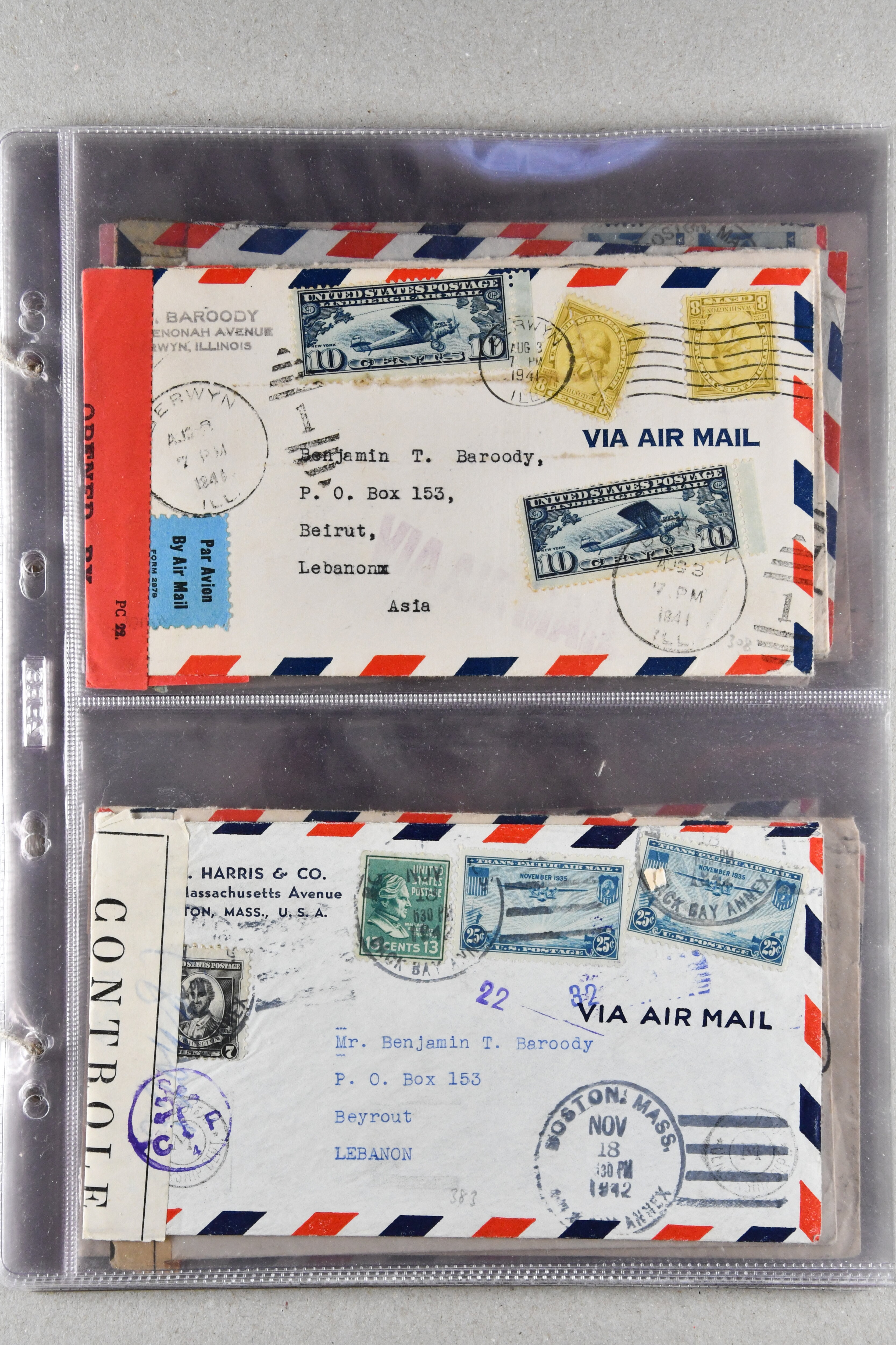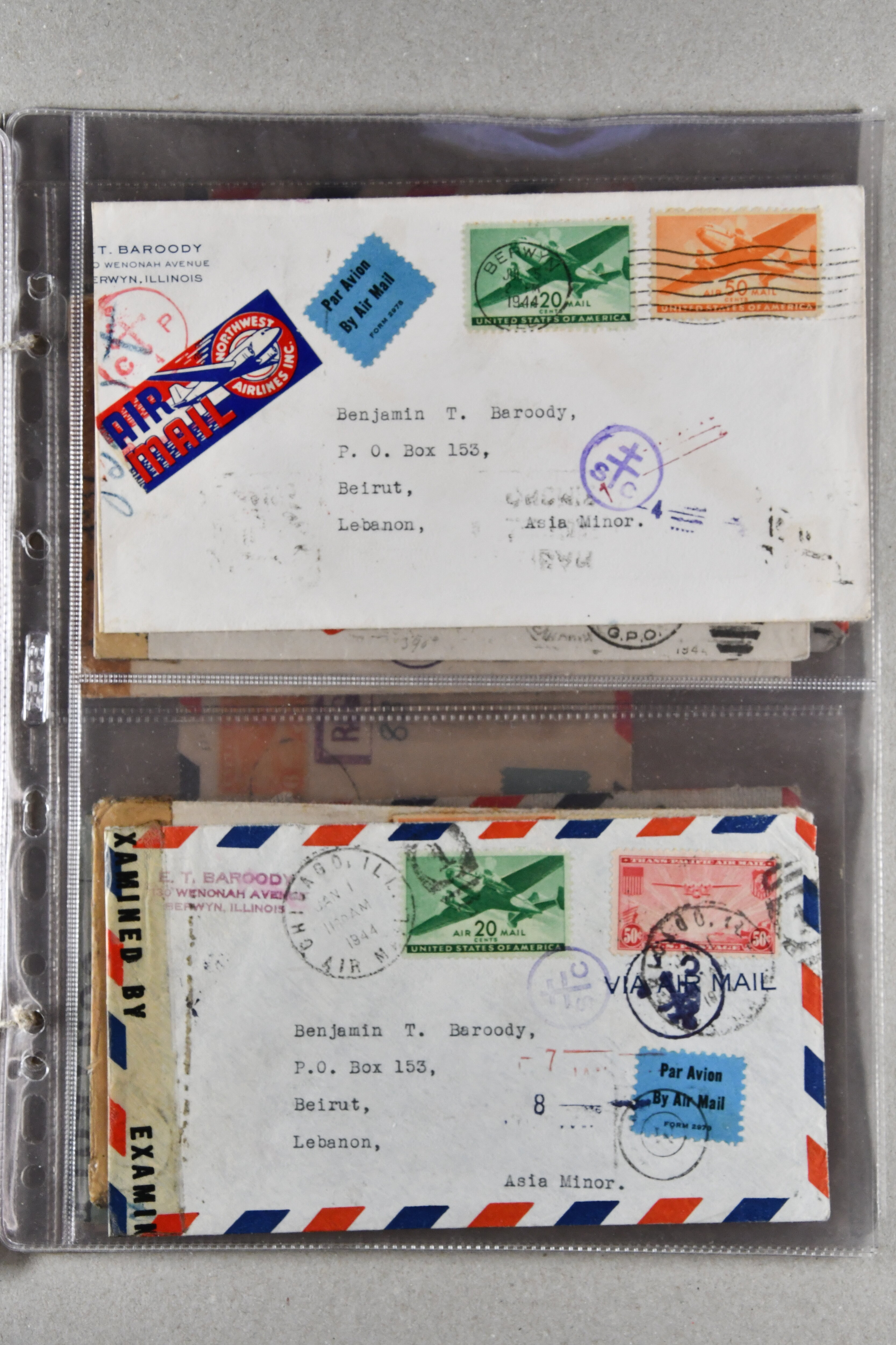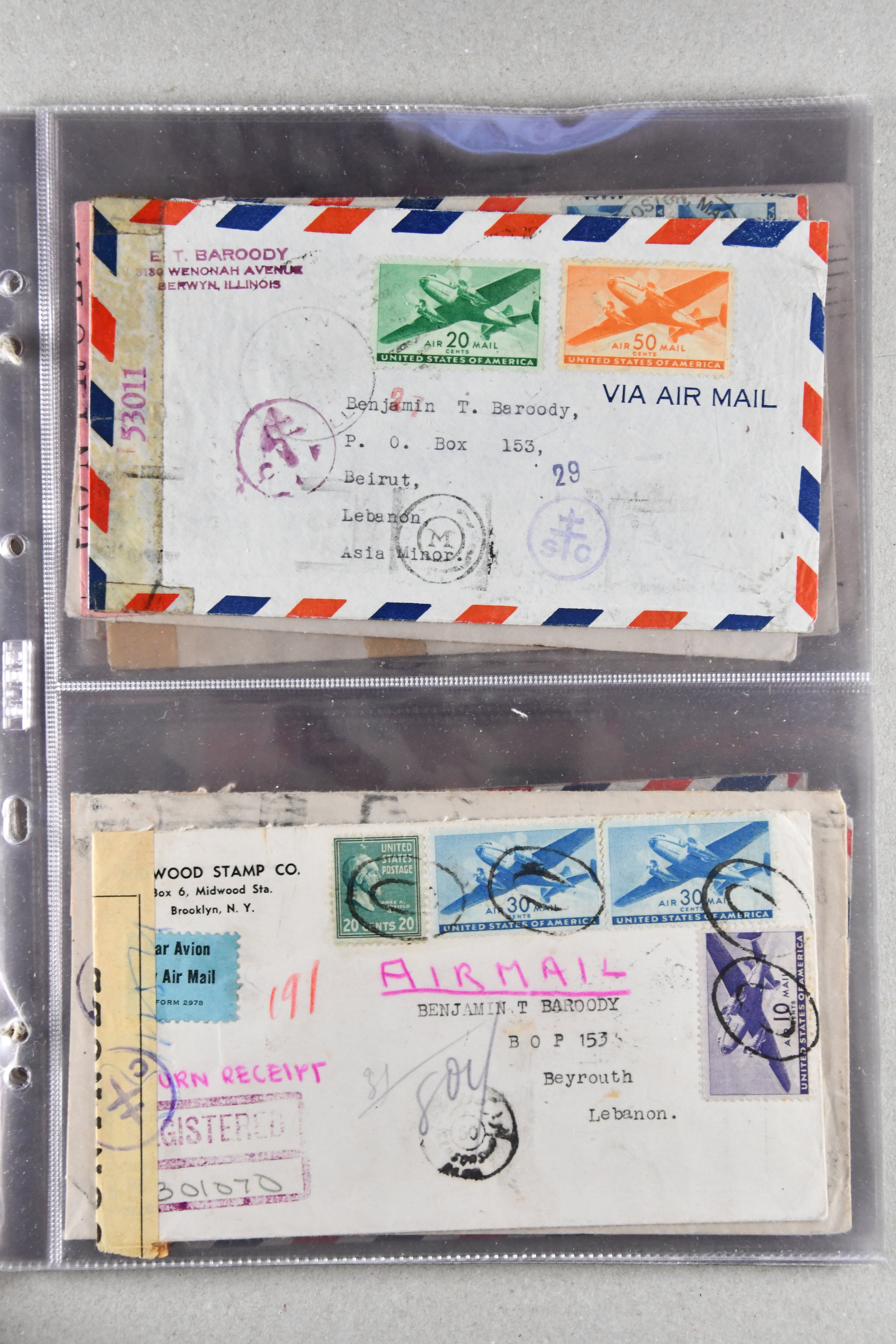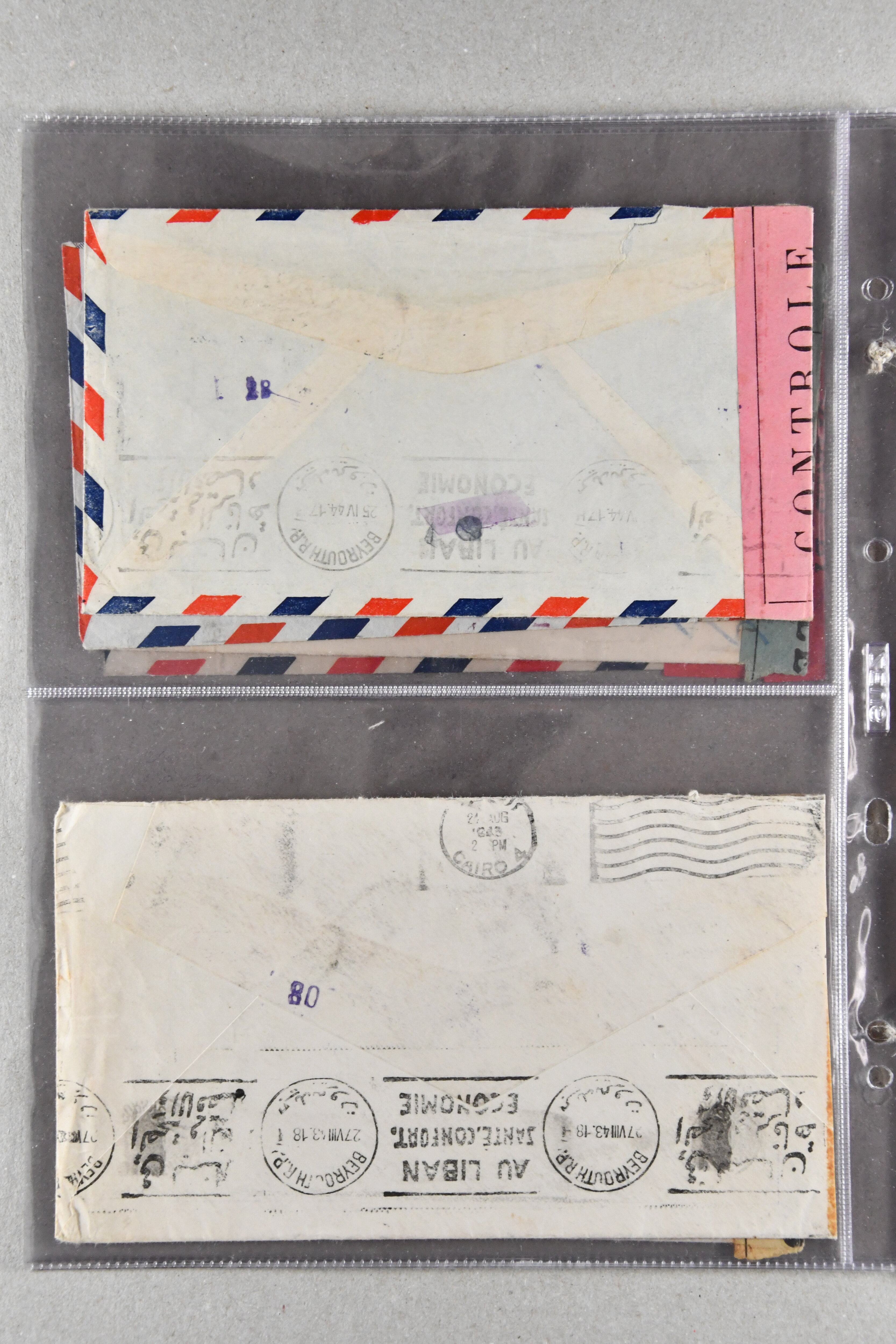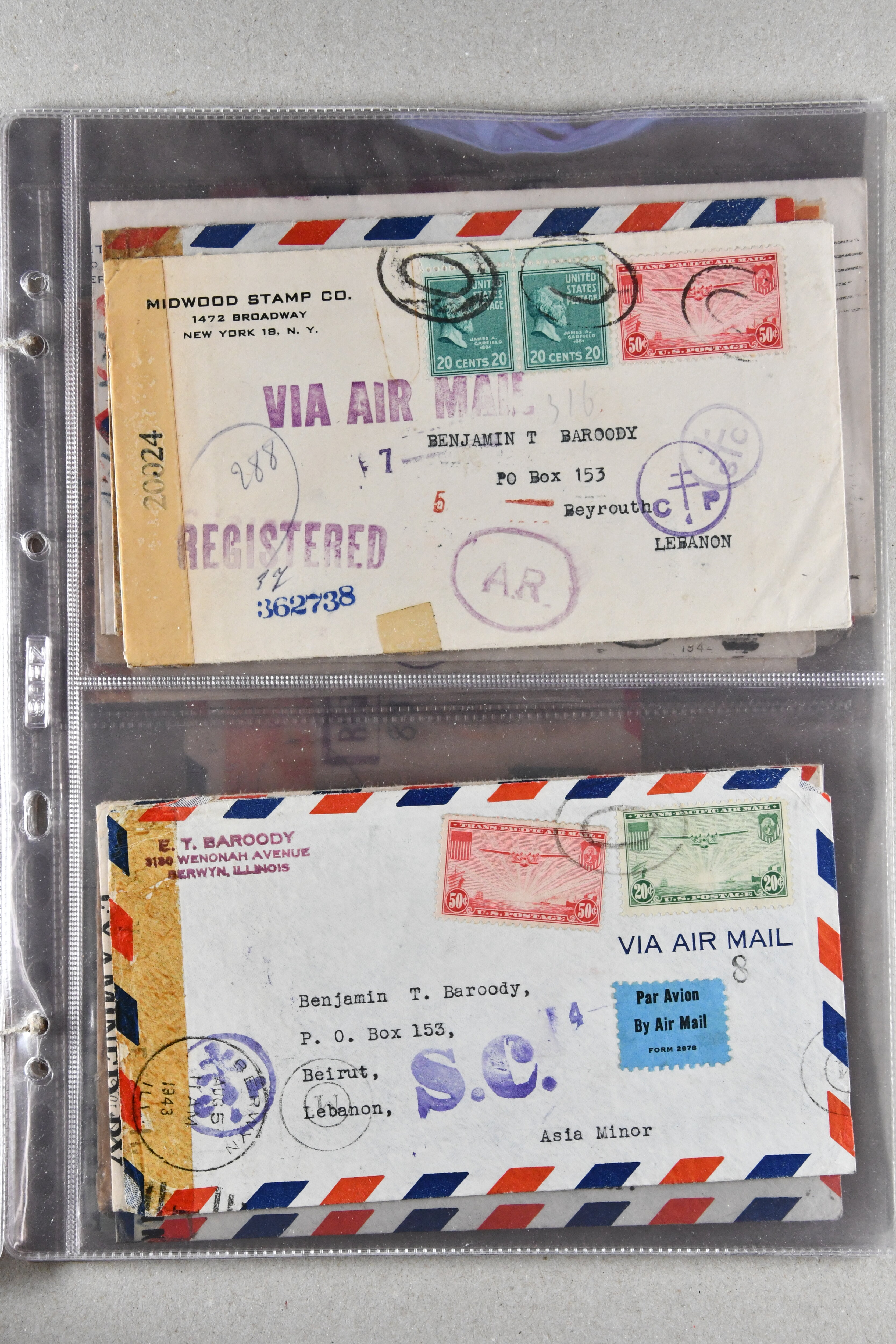 1156 cover image1938/44: United States WWII Airmail to Lebanon and Europe. Lot of 25 airmail covers, franked with a variety of US airmail and definitive issues of the period, showing a broad range of rates and combinations. 23 covers addressed to Beirut, Lebanon, plus 1 to Germany and 1 to Czechoslovakia. Nearly all covers show wartime censor markings or resealing labels, including US and foreign censor handstamps/tapes. Clear strikes of Boston, Chicago, Berwyn, New York and Jackson Hieghts and other US postmarks. Strong representation of the 1938 Transatlantic Clipper issue (10 ¢. & 25 ¢.). Several covers show mixed franking with definitives or commemoratives. Carried during the crucial WWII years when transatlantic and Middle East airmail routes were disrupted, rerouted, or censored. Covers to Lebanon reflect the shifting control of the French Mandate (Vichy / Free French), adding further postal-historical significance. Overall good to fine, typical flaws and opening wear. An appealing group for the collector of WWII postal history, US airmail usages, or Middle East destinations. The Lebanon correspondence, with varied censoring and frankings, provides excellent material for study or exhibit (Image 1) (Image 2) (Image 3) (Image 4) (Image 5) (Image 6) (Image 7) (Image 8) (Image 9) (Image 10) (Image 11) (Image 12) (Image 13) (Image 14) (Image 15) (Image 16) (Image 17) (Image 18) (Image 19) (Image 20) (Image 21) (Image 22) (Image 23) (Image 24) (Image 25)