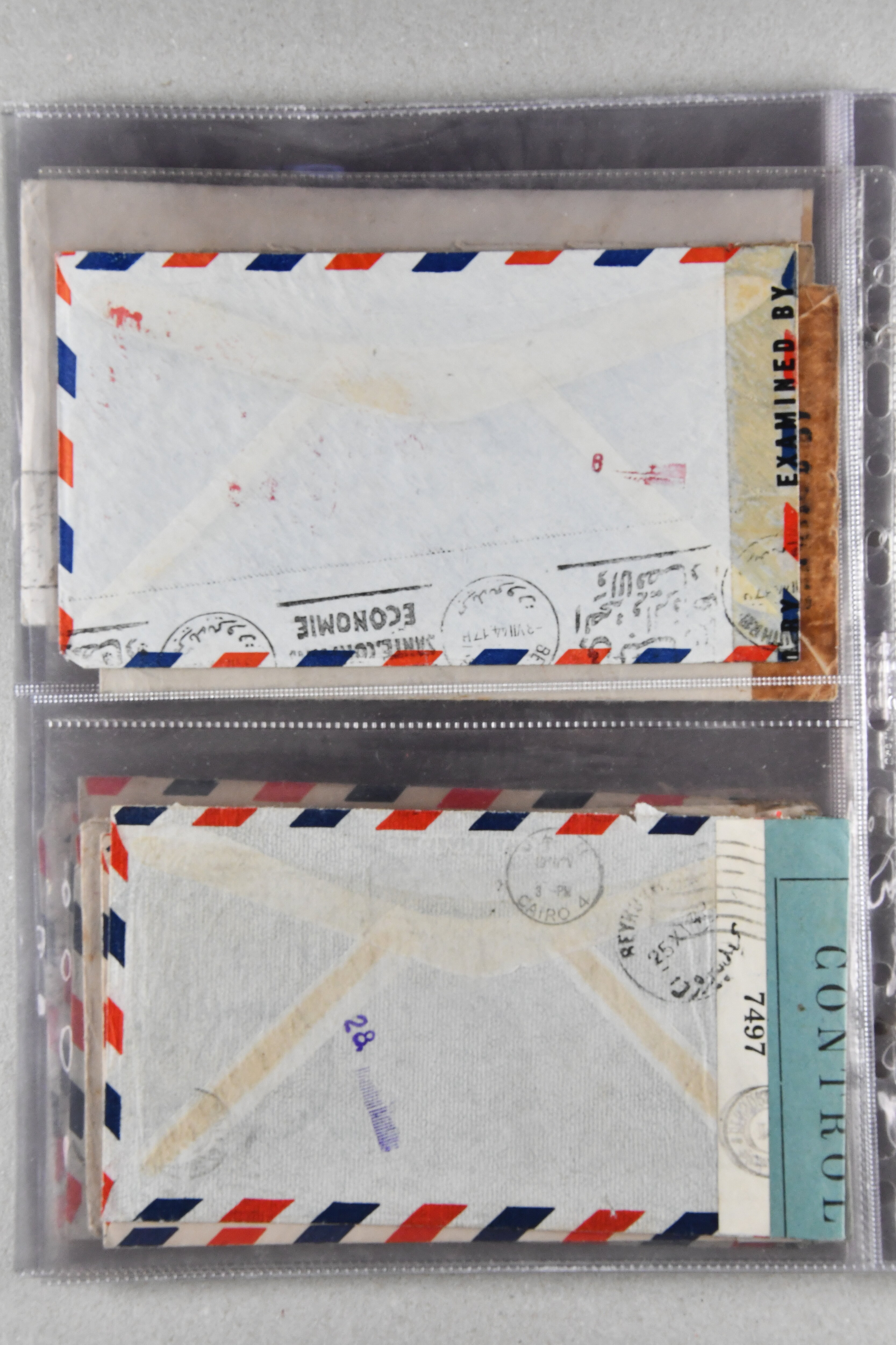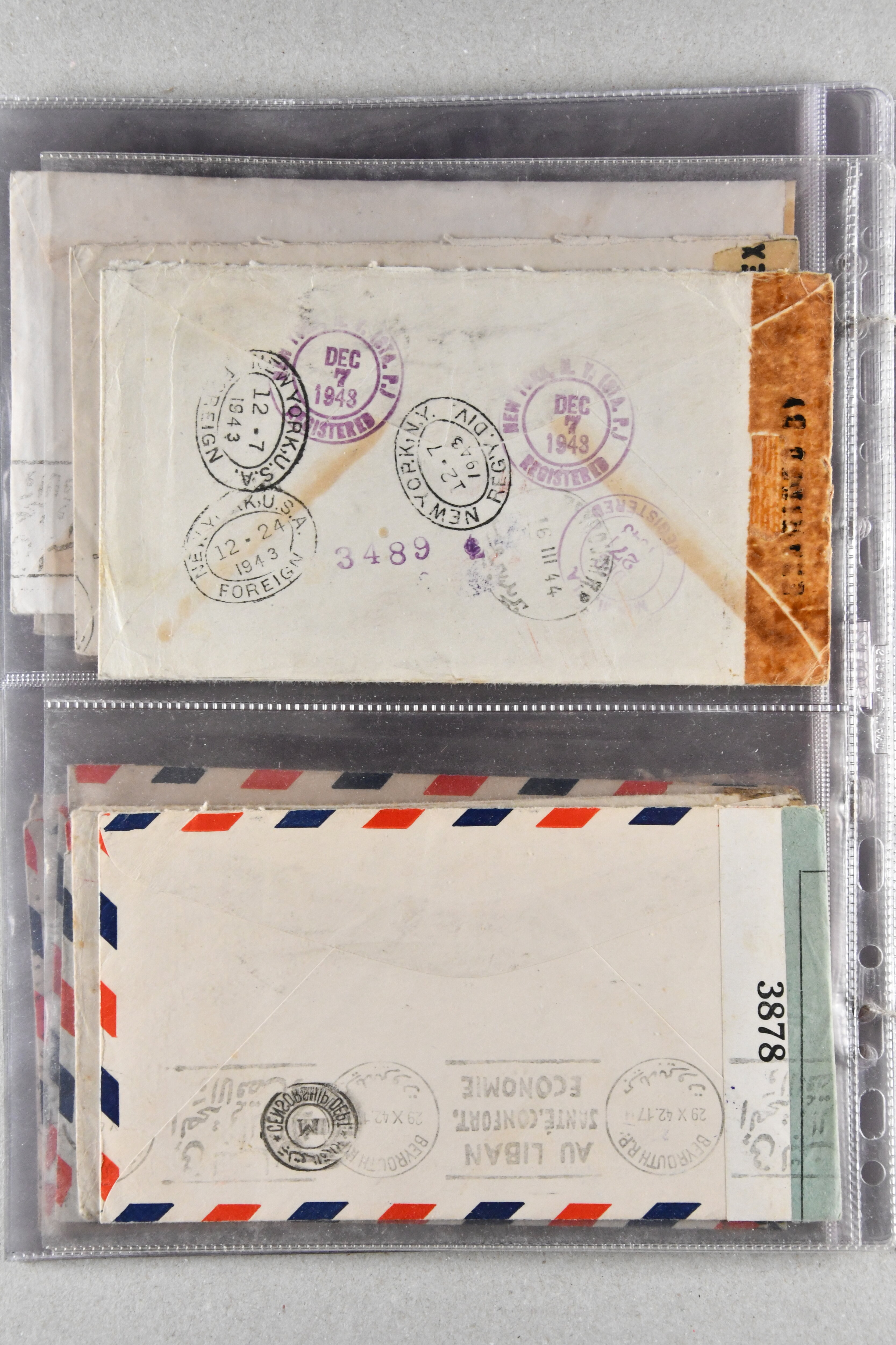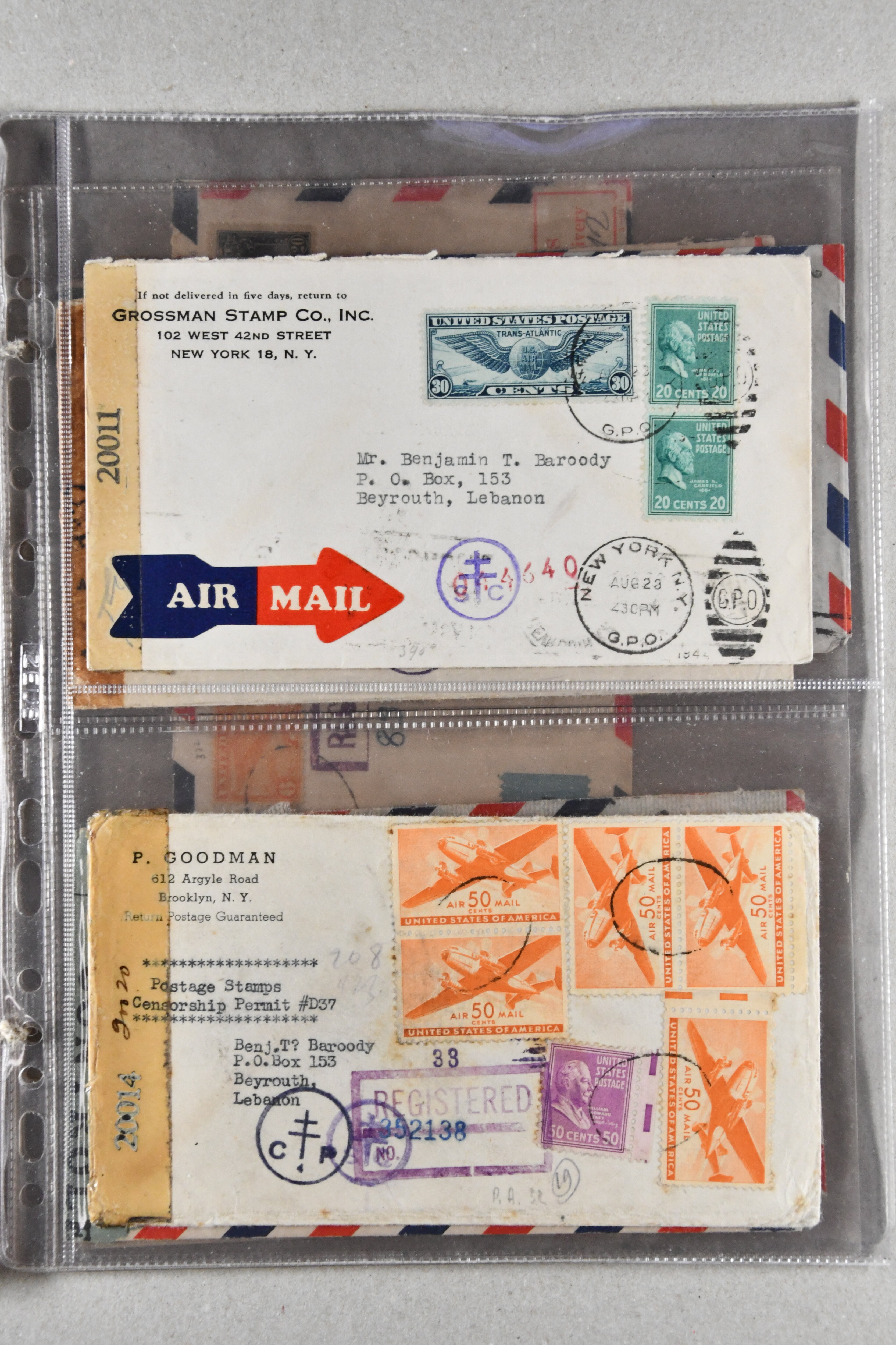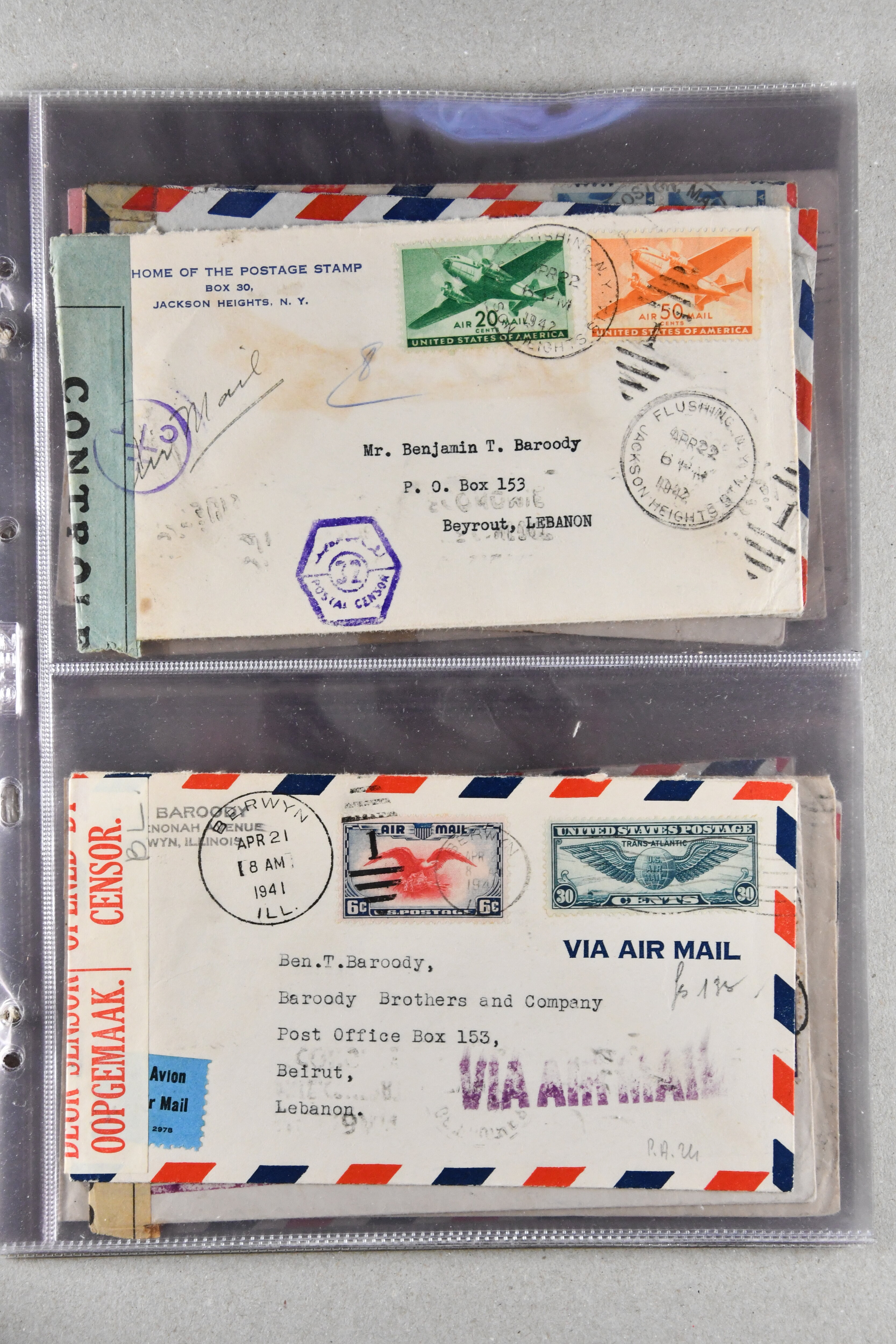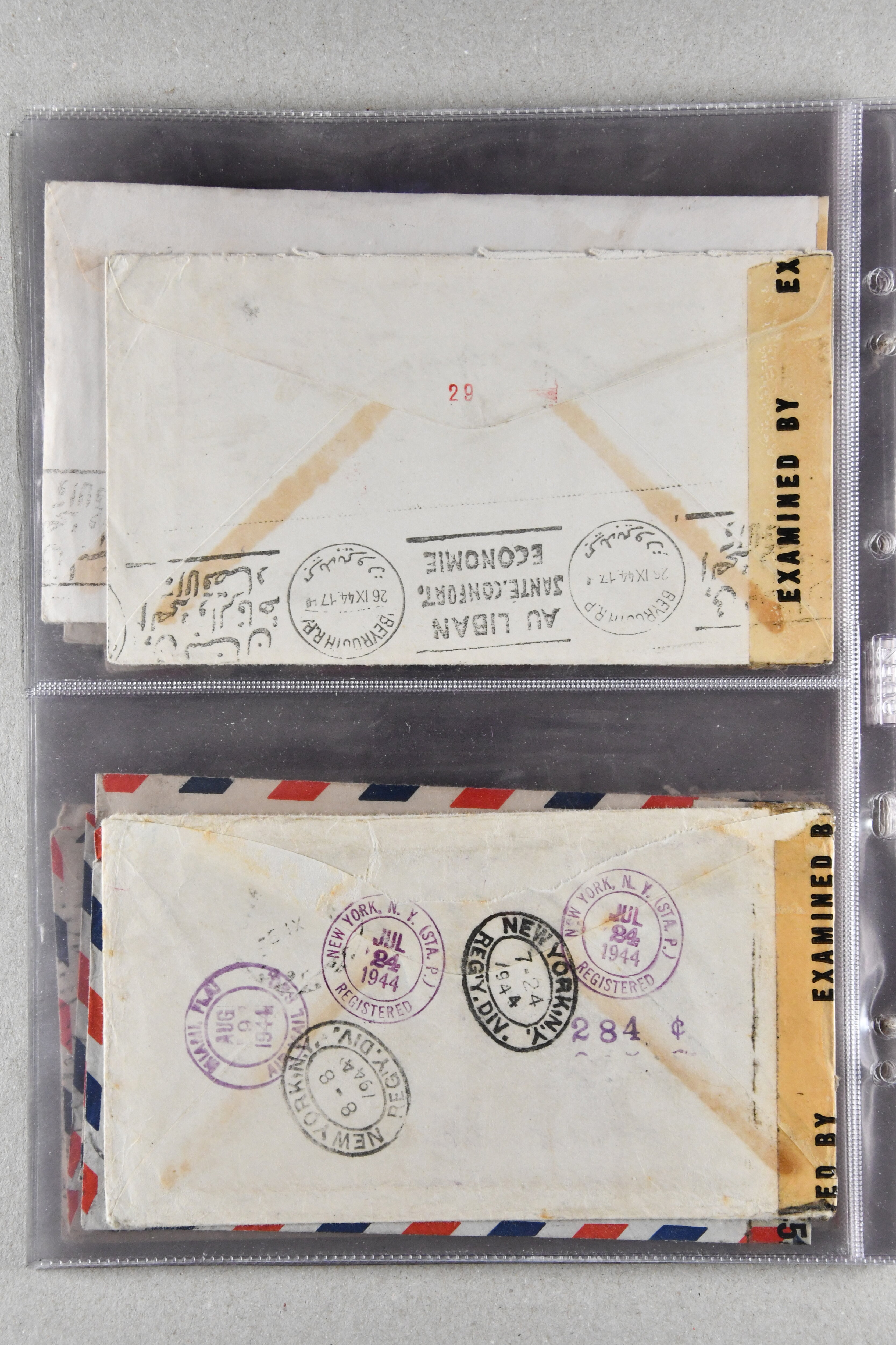 1156 cover image1938/44: United States WWII Airmail to Lebanon and Europe. Lot of 25 airmail covers, franked with a variety of US airmail and definitive issues of the period, showing a broad range of rates and combinations. 23 covers addressed to Beirut, Lebanon, plus 1 to Germany and 1 to Czechoslovakia. Nearly all covers show wartime censor markings or resealing labels, including US and foreign censor handstamps/tapes. Clear strikes of Boston, Chicago, Berwyn, New York and Jackson Hieghts and other US postmarks. Strong representation of the 1938 Transatlantic Clipper issue (10 ¢. & 25 ¢.). Several covers show mixed franking with definitives or commemoratives. Carried during the crucial WWII years when transatlantic and Middle East airmail routes were disrupted, rerouted, or censored. Covers to Lebanon reflect the shifting control of the French Mandate (Vichy / Free French), adding further postal-historical significance. Overall good to fine, typical flaws and opening wear. An appealing group for the collector of WWII postal history, US airmail usages, or Middle East destinations. The Lebanon correspondence, with varied censoring and frankings, provides excellent material for study or exhibit (Image 1) (Image 2) (Image 3) (Image 4) (Image 5) (Image 6) (Image 7) (Image 8) (Image 9) (Image 10) (Image 11) (Image 12) (Image 13) (Image 14) (Image 15) (Image 16) (Image 17) (Image 18) (Image 19) (Image 20) (Image 21) (Image 22) (Image 23) (Image 24) (Image 25)