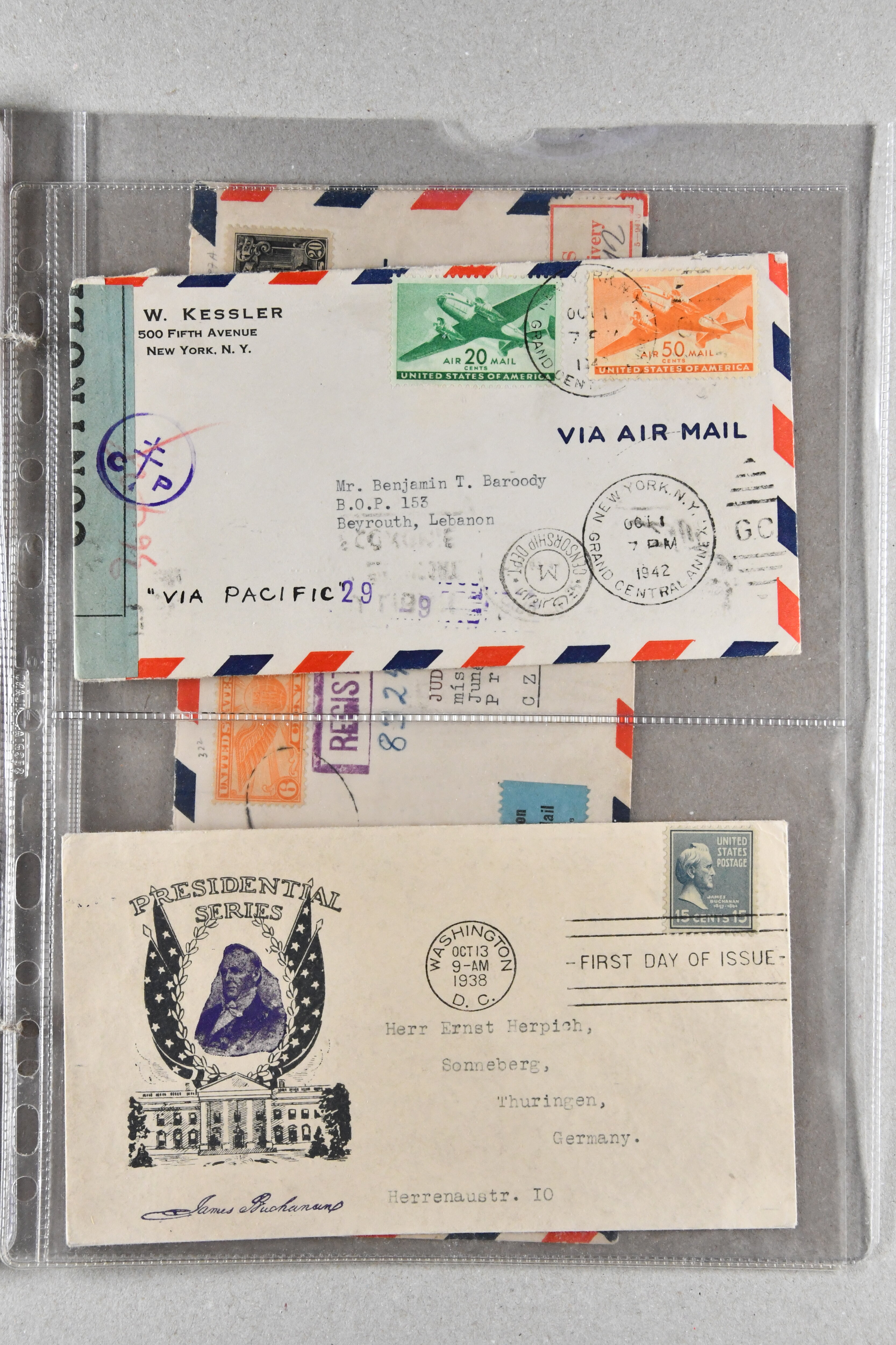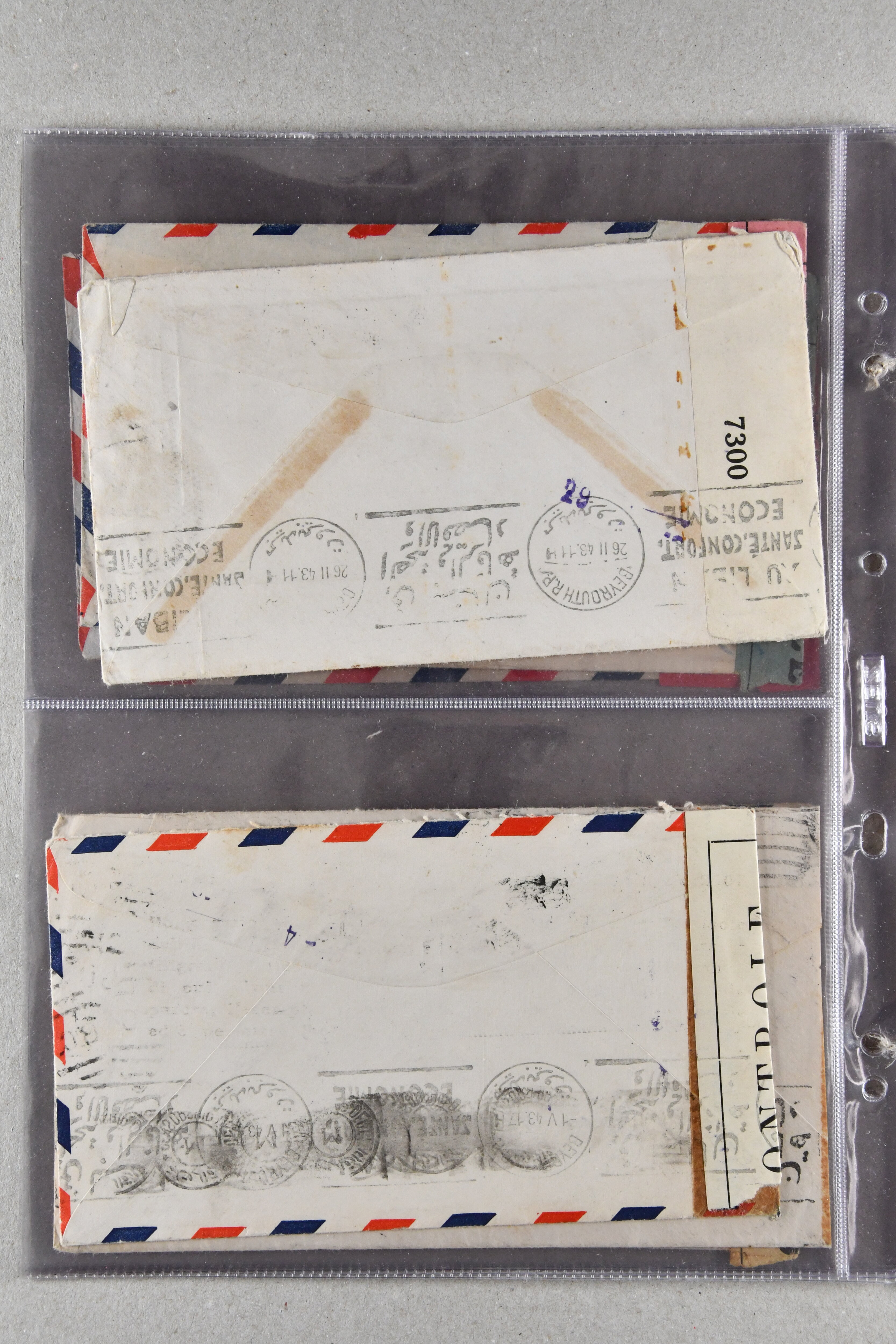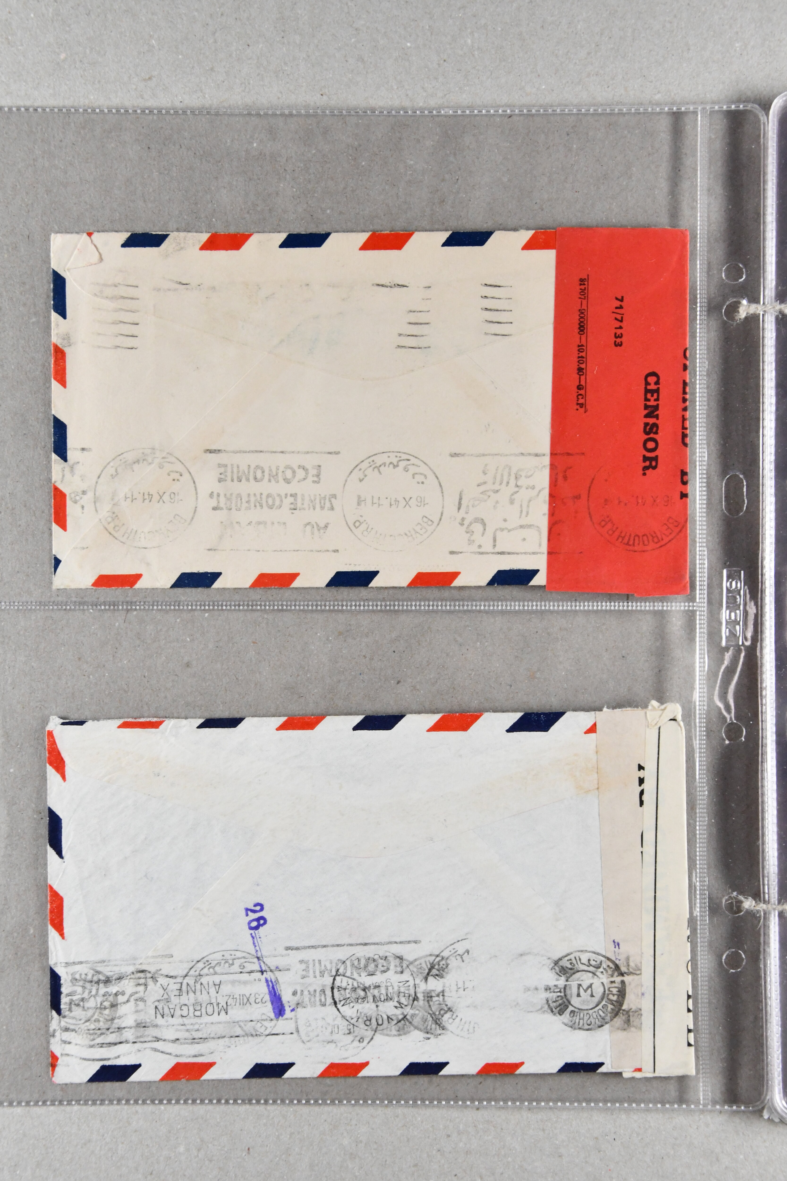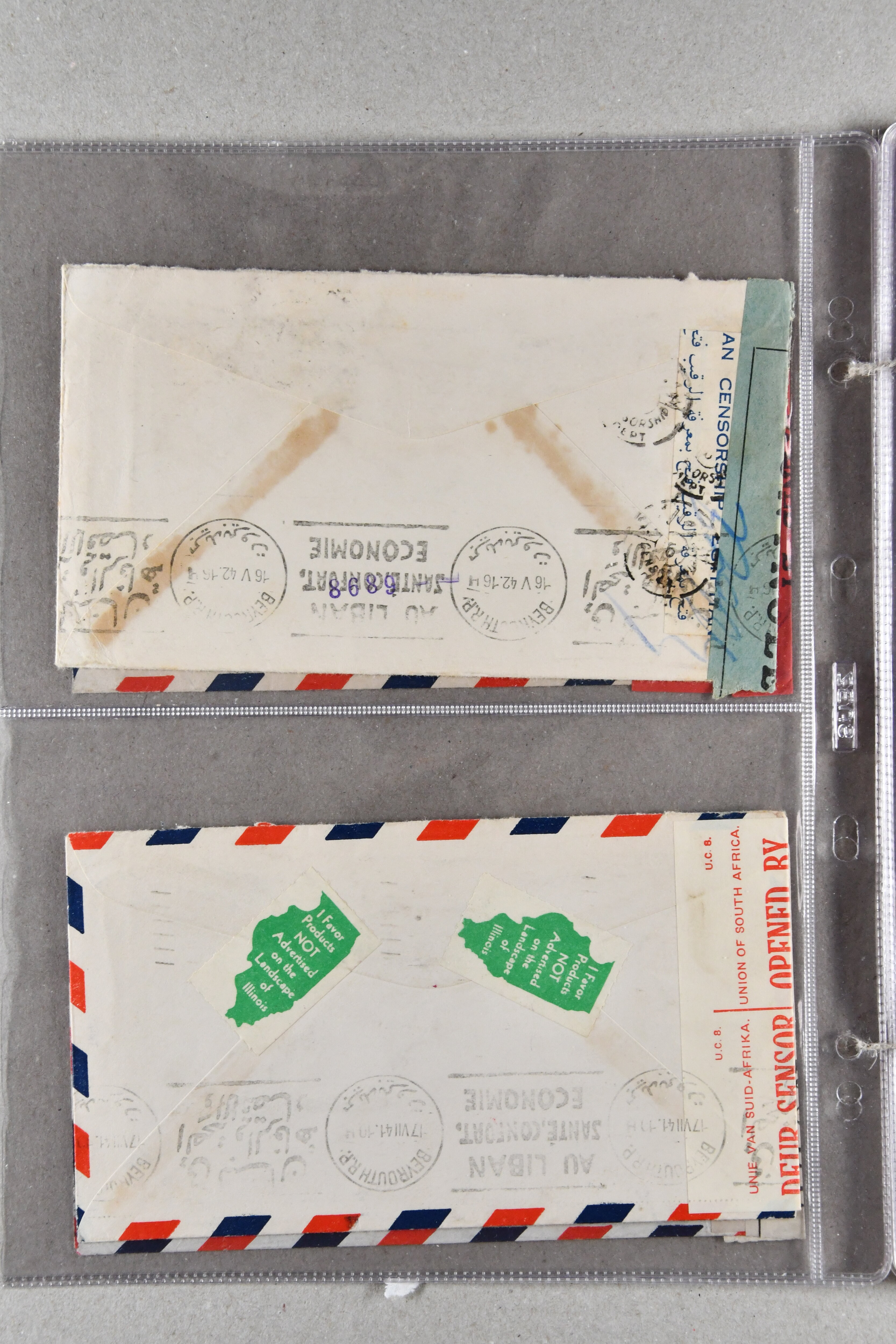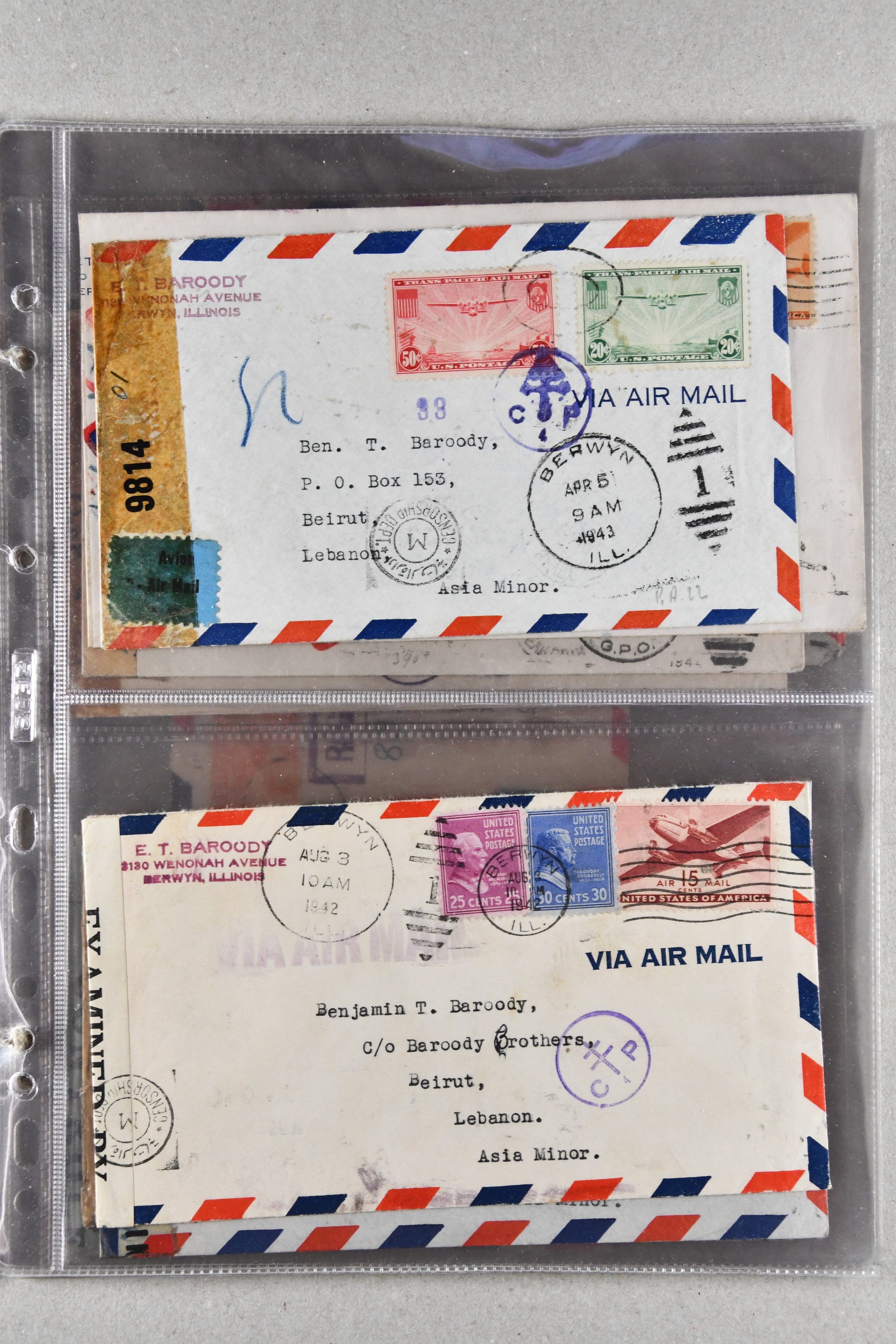 1156 cover image1938/44: United States WWII Airmail to Lebanon and Europe. Lot of 25 airmail covers, franked with a variety of US airmail and definitive issues of the period, showing a broad range of rates and combinations. 23 covers addressed to Beirut, Lebanon, plus 1 to Germany and 1 to Czechoslovakia. Nearly all covers show wartime censor markings or resealing labels, including US and foreign censor handstamps/tapes. Clear strikes of Boston, Chicago, Berwyn, New York and Jackson Hieghts and other US postmarks. Strong representation of the 1938 Transatlantic Clipper issue (10 ¢. & 25 ¢.). Several covers show mixed franking with definitives or commemoratives. Carried during the crucial WWII years when transatlantic and Middle East airmail routes were disrupted, rerouted, or censored. Covers to Lebanon reflect the shifting control of the French Mandate (Vichy / Free French), adding further postal-historical significance. Overall good to fine, typical flaws and opening wear. An appealing group for the collector of WWII postal history, US airmail usages, or Middle East destinations. The Lebanon correspondence, with varied censoring and frankings, provides excellent material for study or exhibit (Image 1) (Image 2) (Image 3) (Image 4) (Image 5) (Image 6) (Image 7) (Image 8) (Image 9) (Image 10) (Image 11) (Image 12) (Image 13) (Image 14) (Image 15) (Image 16) (Image 17) (Image 18) (Image 19) (Image 20) (Image 21) (Image 22) (Image 23) (Image 24) (Image 25)