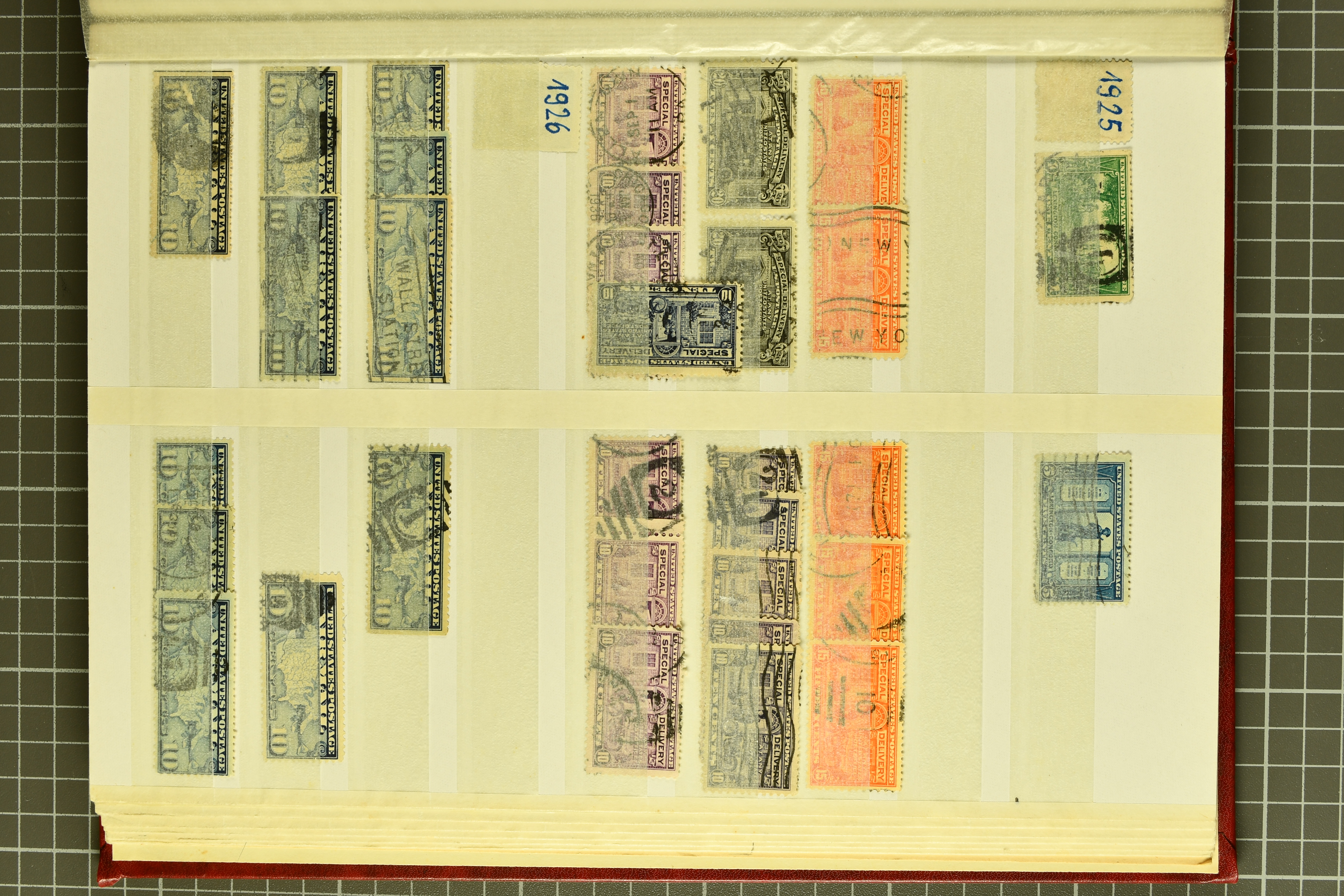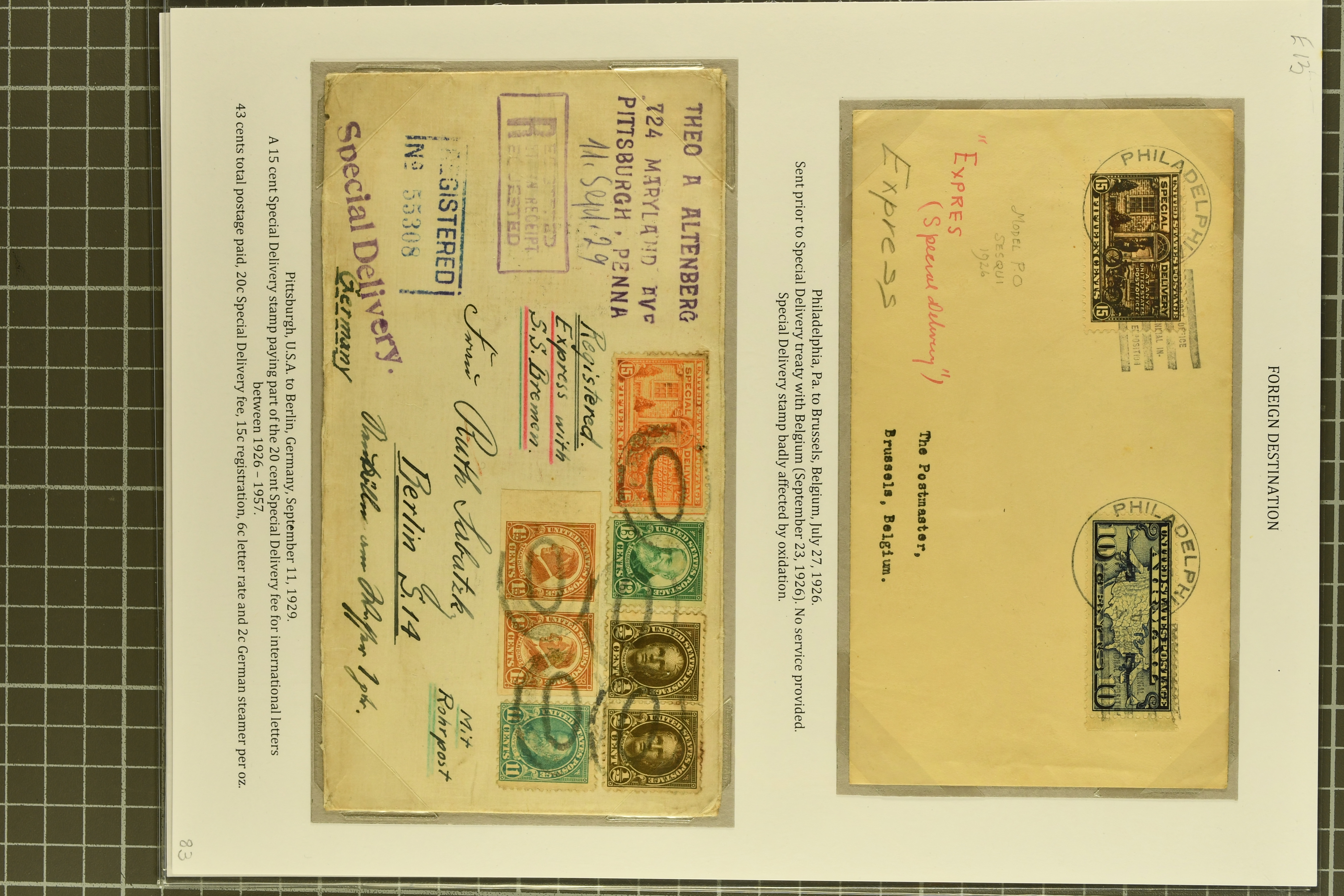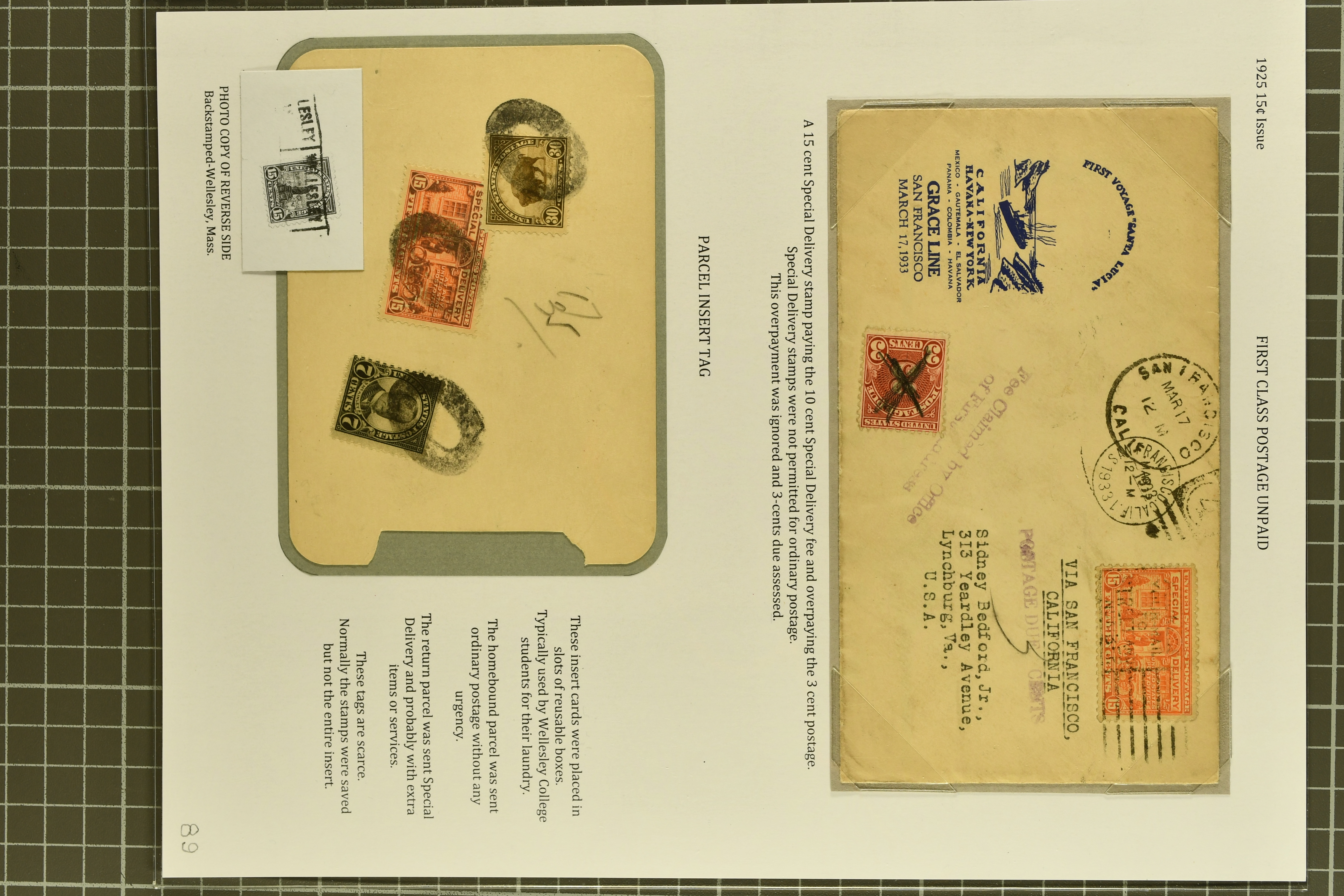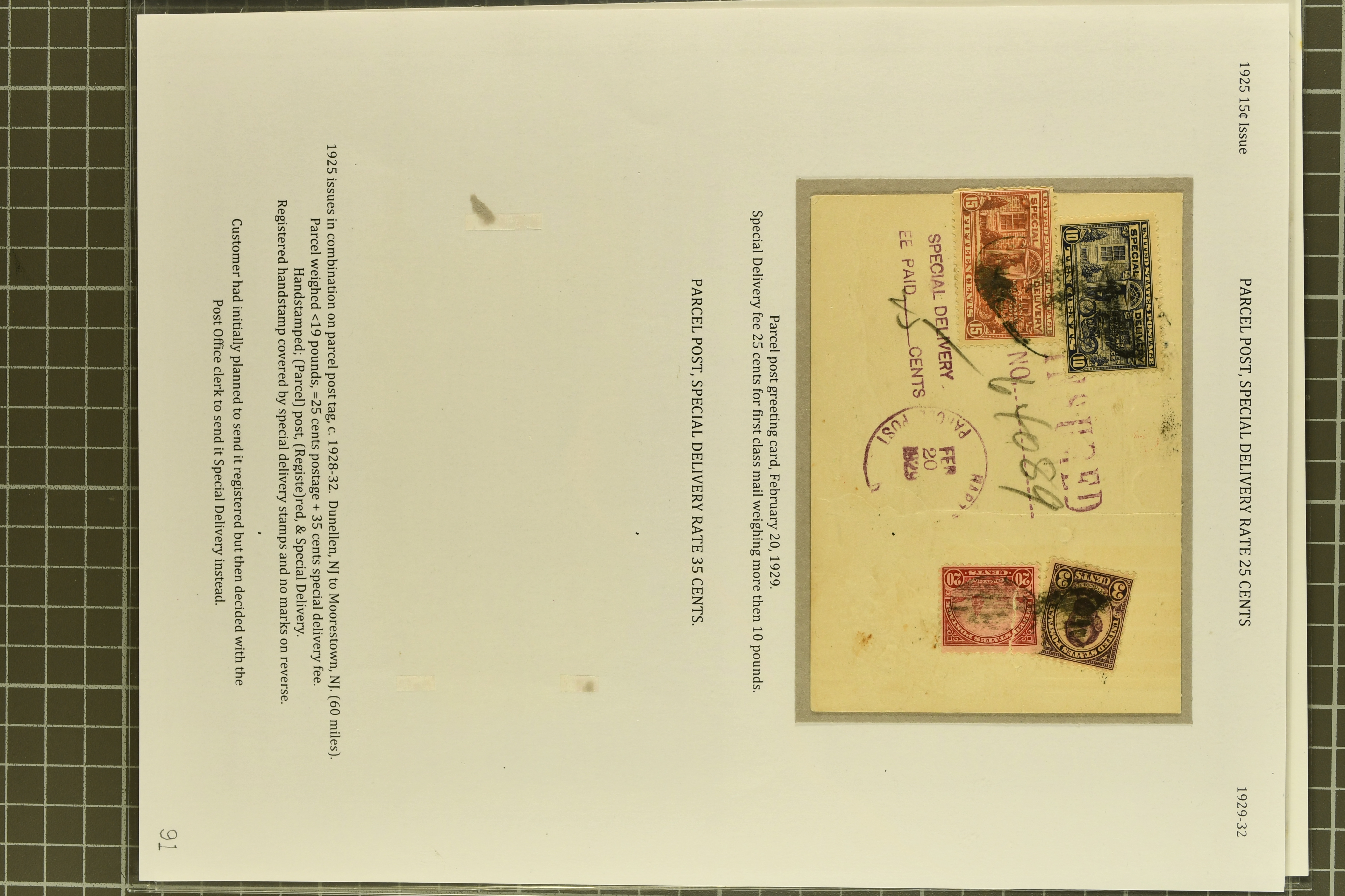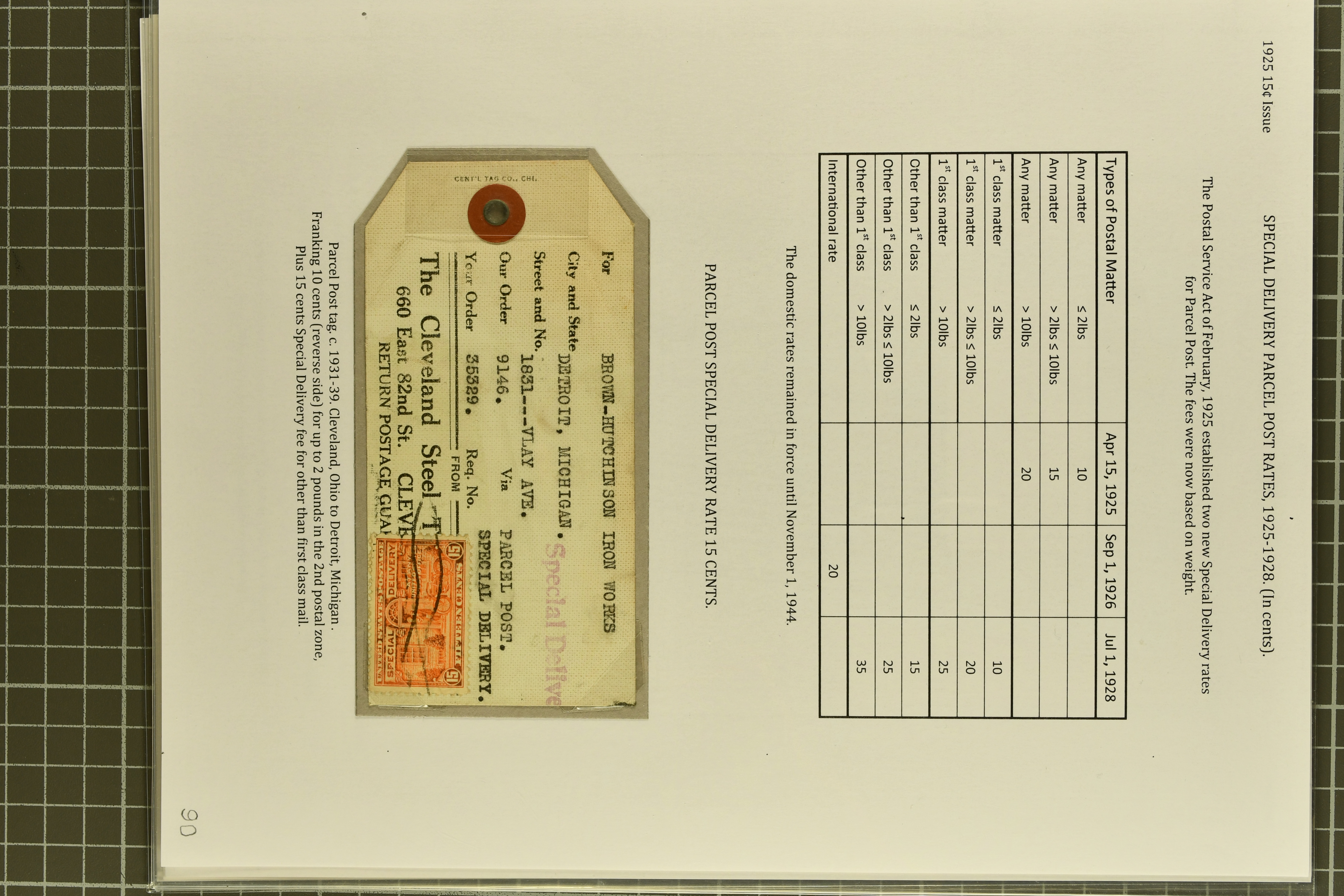 1144 cover image1925 15 c. Deep Orange Issue 1925, 15 c. deep orange, postal history study, with seven covers, mounted on exhibit pages, comprising one of seventy five recorded First Day Covers; first class postage unpaid Maiden Voyage of the Santa Lucia cover; several parcel post usages including a scarce usage of a parcel insert tag, 1929 parcel post card for first class mail weighing more than 10lbs, rare combination usage with 1925 20 c. black Special Delivery on parcel tag, and c. 1931-9 parcel post tag; and foreign destination covers to Belgium and Germany; some small faults, several of the stamps showing signs of oxidization as commonly found, else a fine group (Image 1) (Image 2) (Image 3) (Image 4)