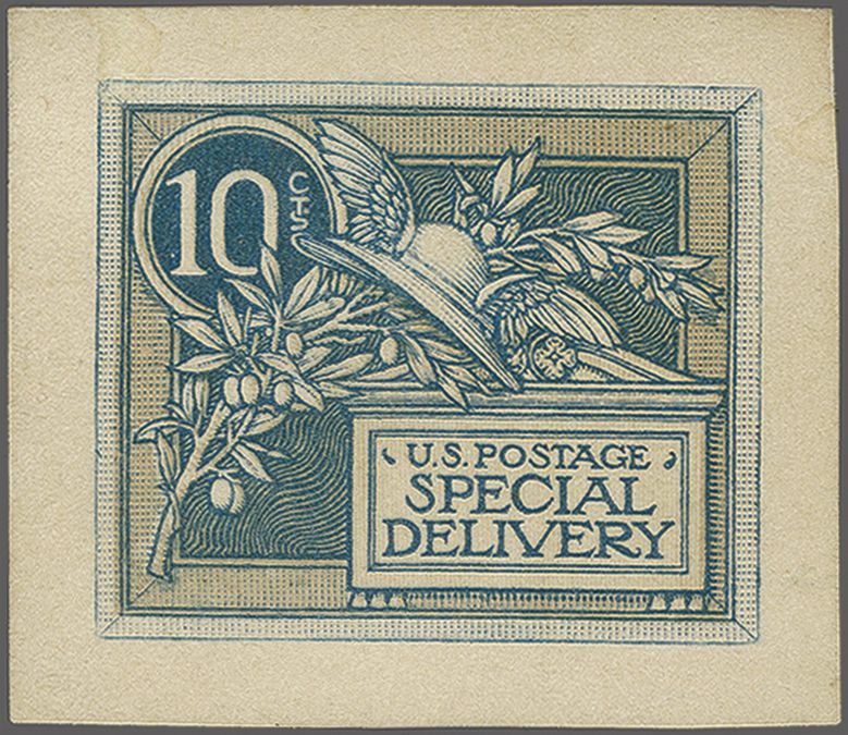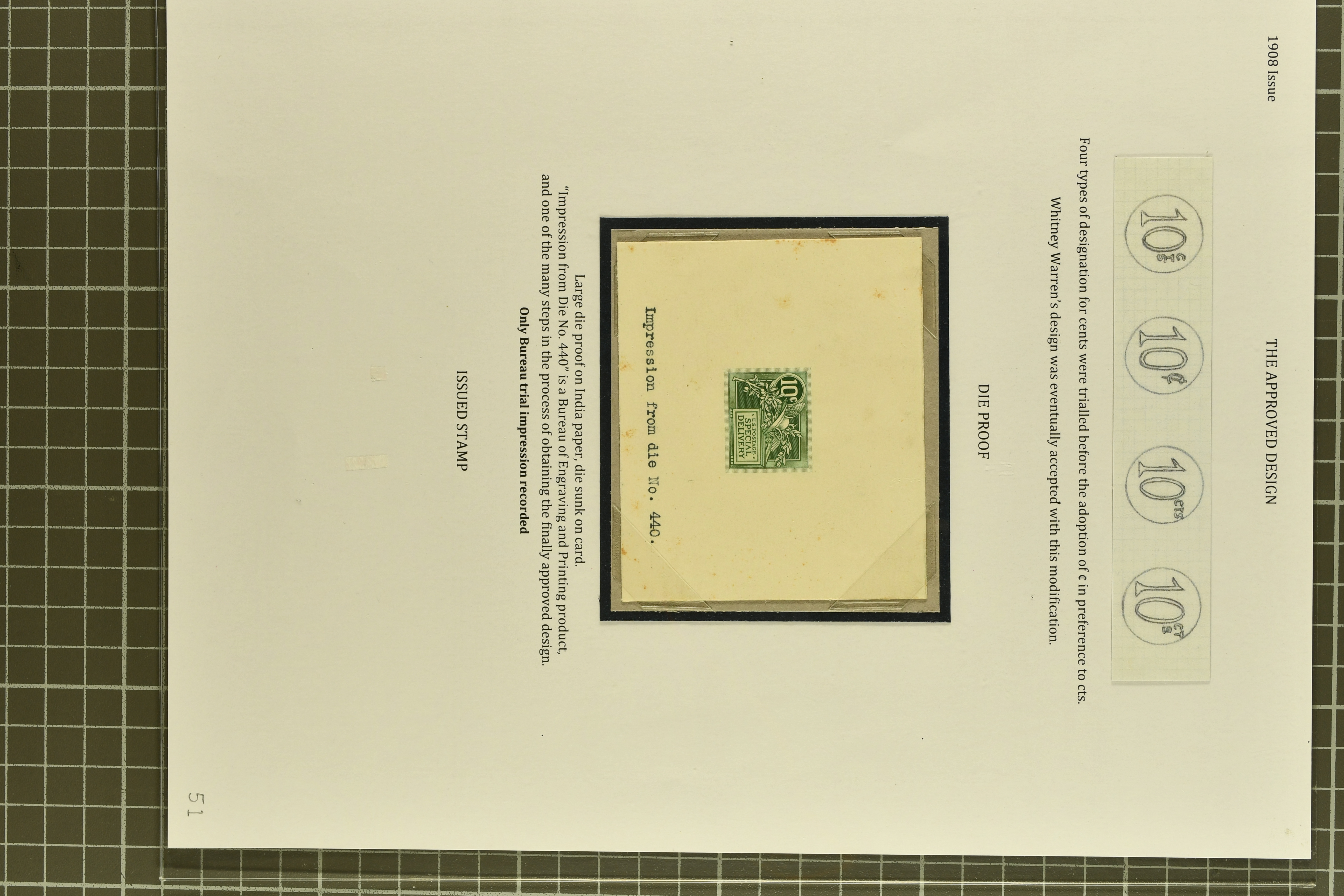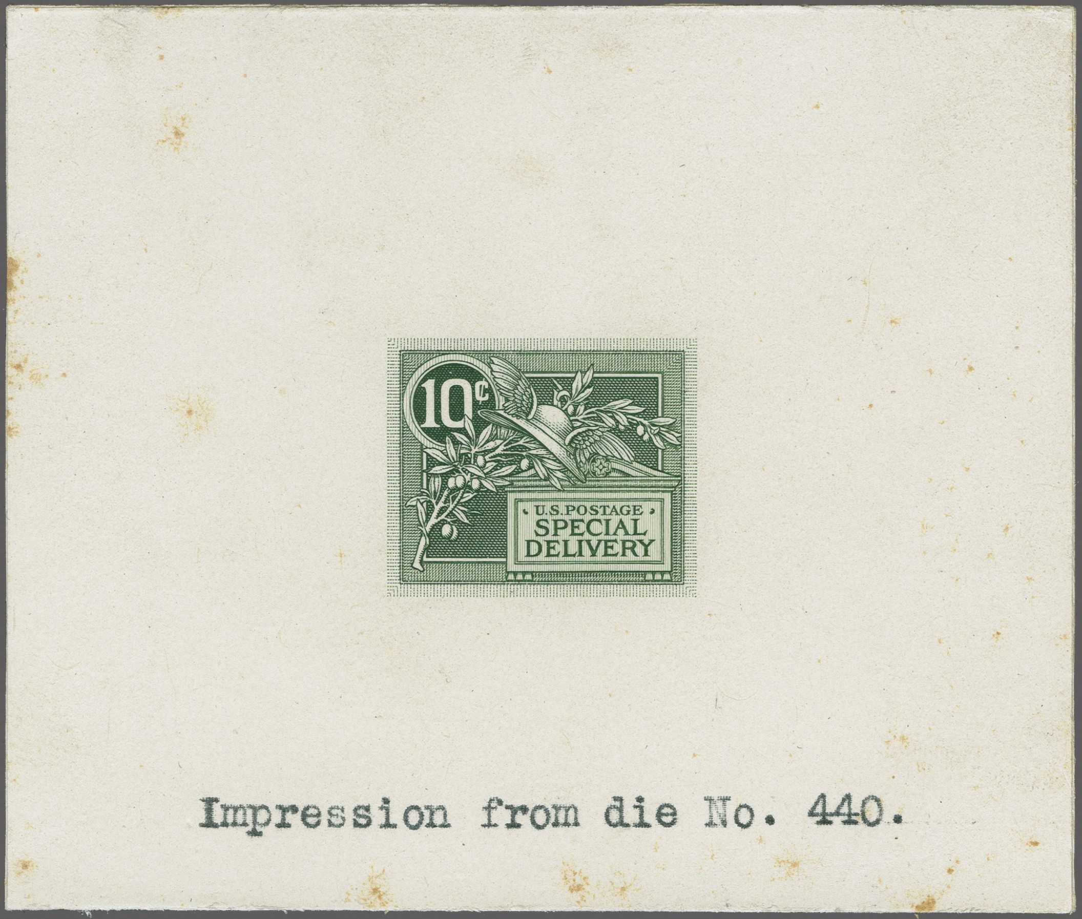 1140 (*) image1908: 10 c. Green - the "Merry Widow" Issue 1908: 10 c. green, large die proof of the approved design, on India, sunk on card, trimmed to die size, 89 x 75mm, typed "Impression from die No. 440." good colour and impression, scattered tone spots clear of impression, fine-very fine and scarce, the only Bureau trial impression large die proof recorded. Scott = $2'750. Provenance: Collection Markovits, Schuyler Rumsey Philatelic Auctions, June 1, 2016, lot 1120 (Image 1) (Image 2) (Image 3)