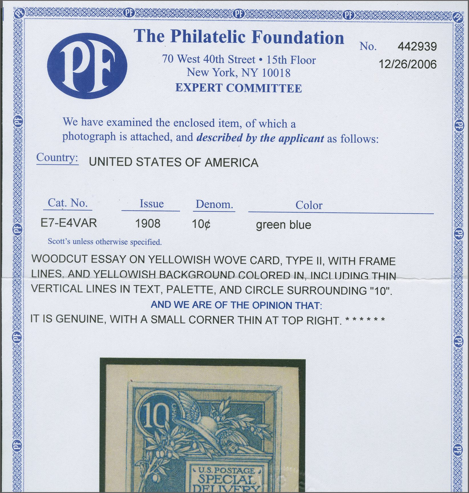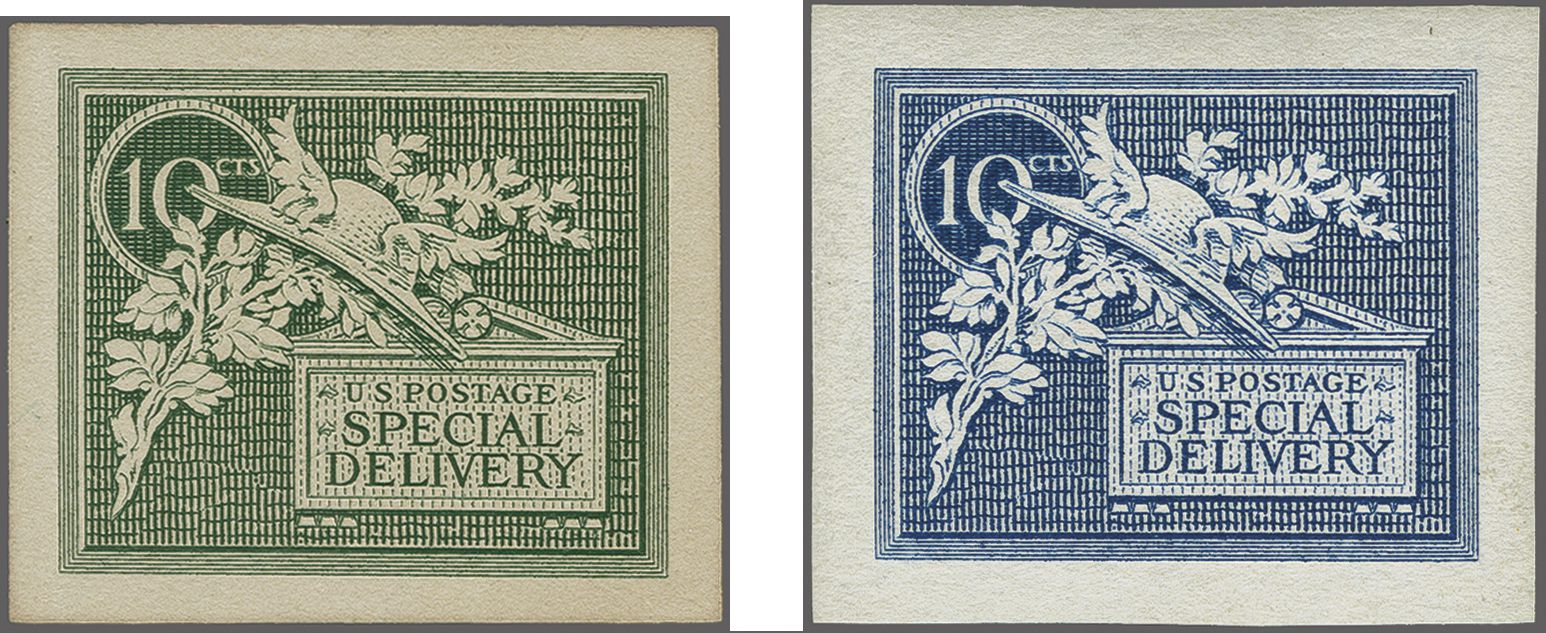 1141 (*) image1908: 10 c. Green - the "Merry Widow" Issue 1908: 10c. "Shaded Hat" Bureau essays, two colour trials, with deep geen on yellowish wove paper and deep ultramarine on white wove paper, each with large balanced margins all around, a few light thins, otherwise very fine and most attractive; a scarce duo (Image 1)