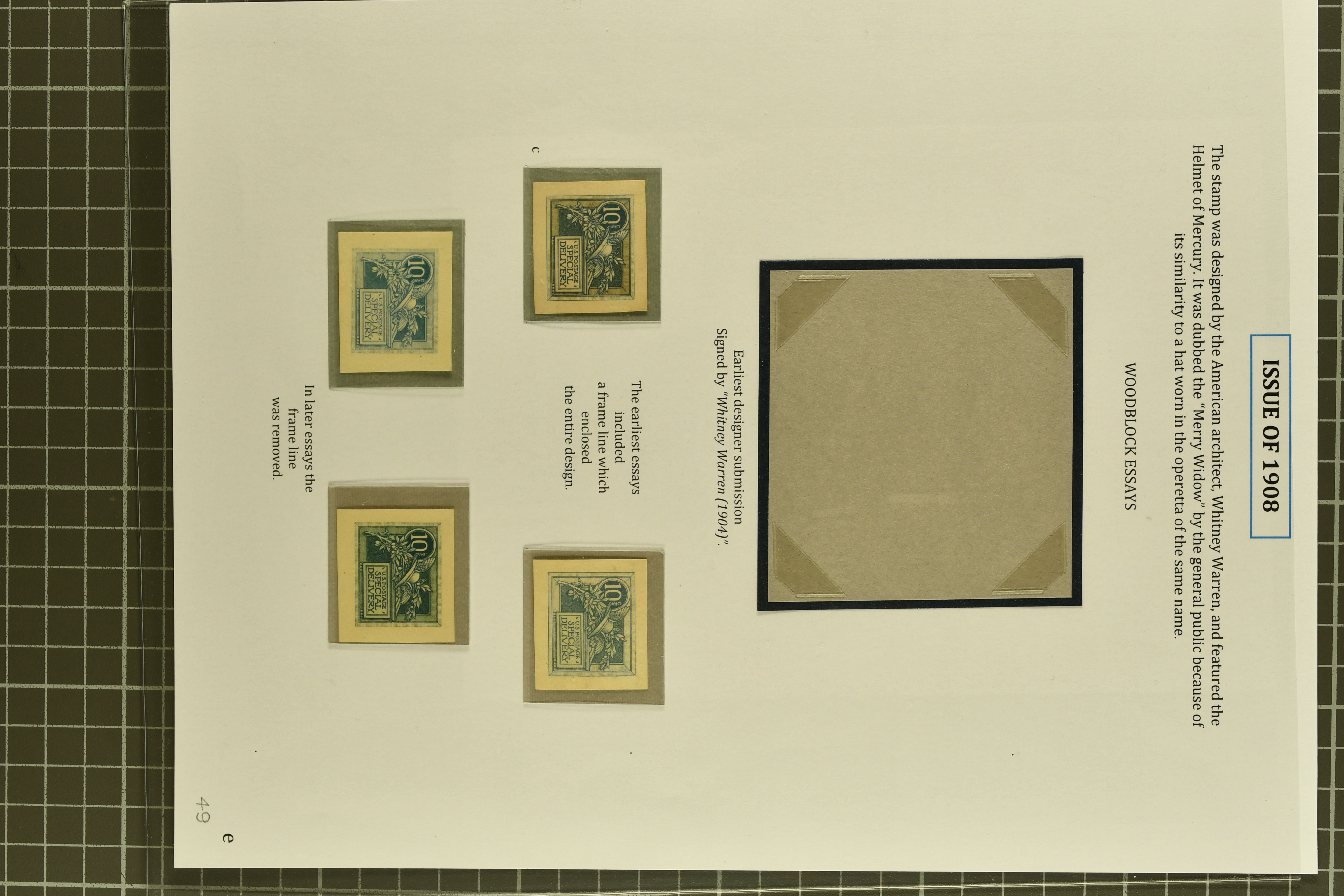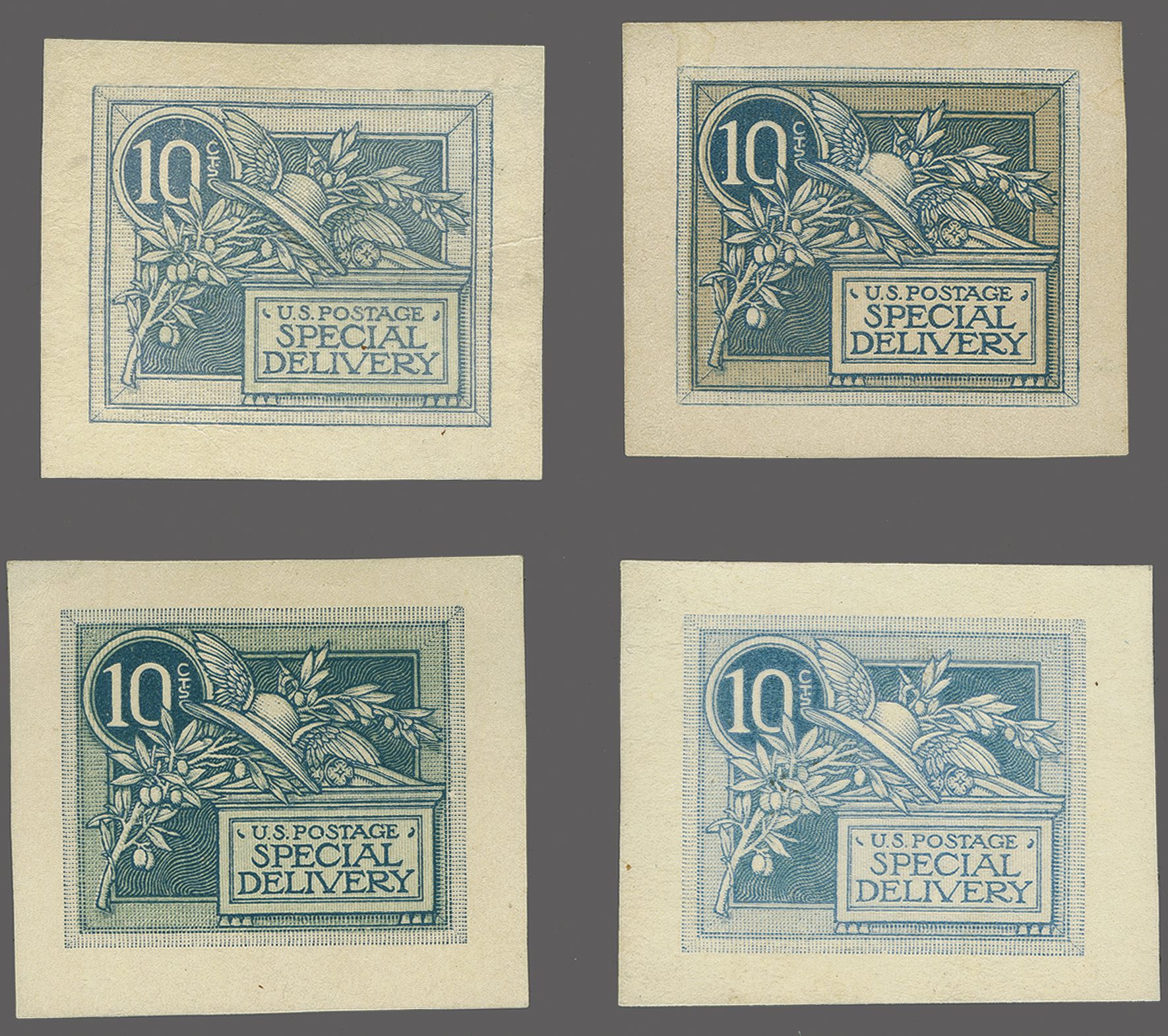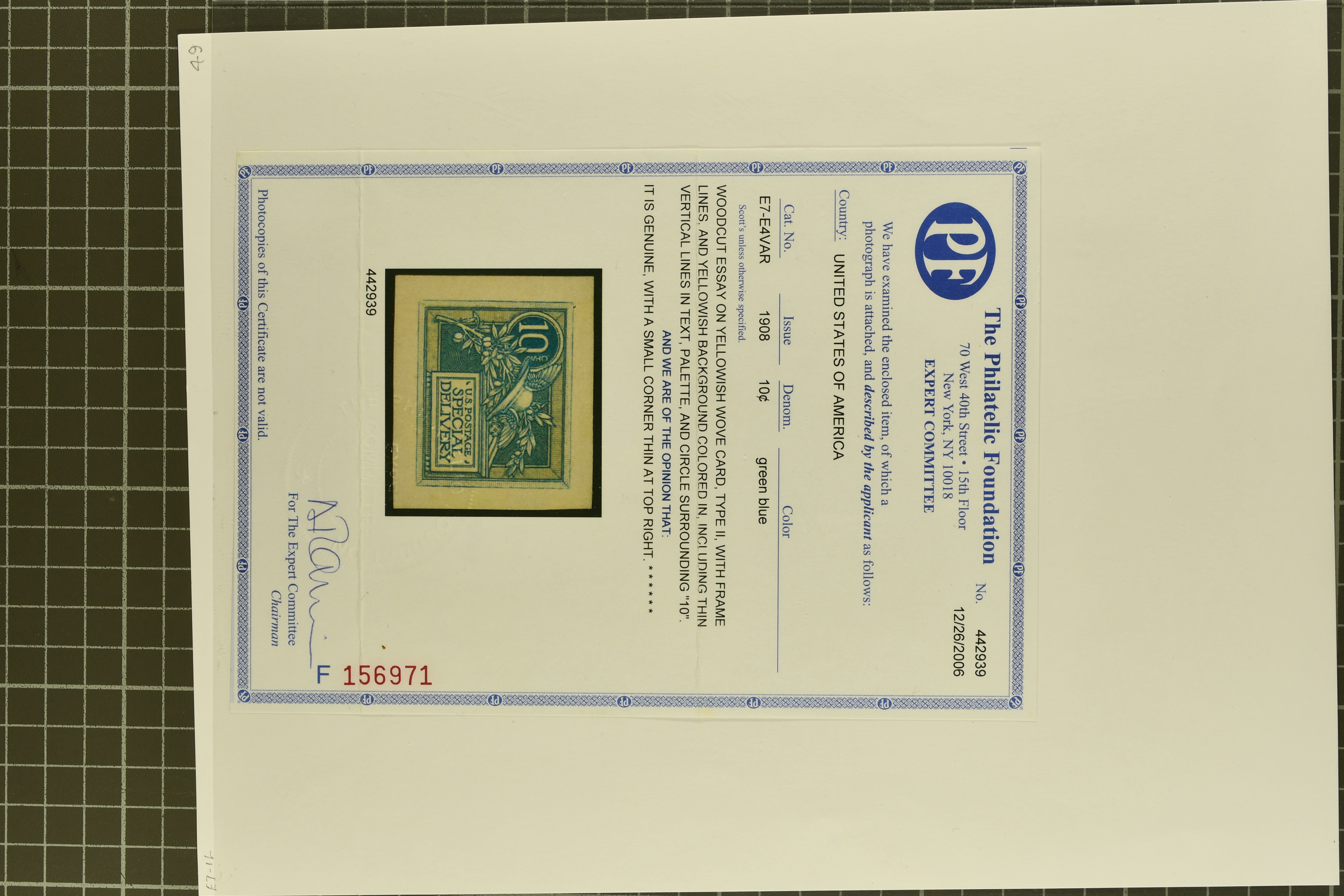 1142 (*) image1908: 10 c. Green - the "Merry Widow" Issue 1908: 10 c. woodcut essays, group of four, all on yellowish card, with two early examples displaying a frameline enclosing the entire design, and two later examples with the outer frameline removed, in dim dark green-blue and dim dusky blue-green, a few small imperfections, but an otherwise very fine and scarce group. Cert. Philatelic Foundation (2006, for Type II) (Image 1) (Image 2) (Image 3) (Image 4) (Image 5)
