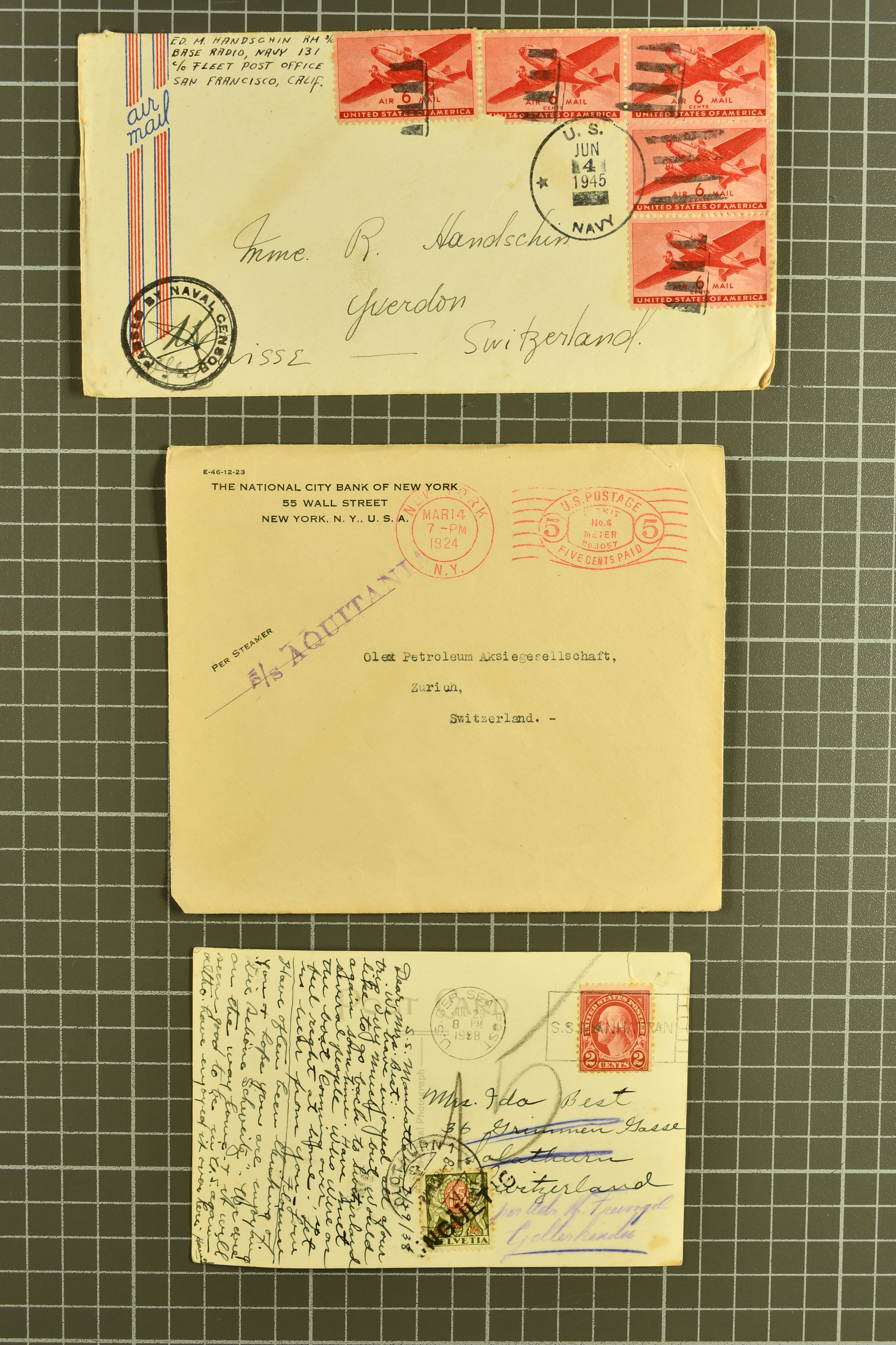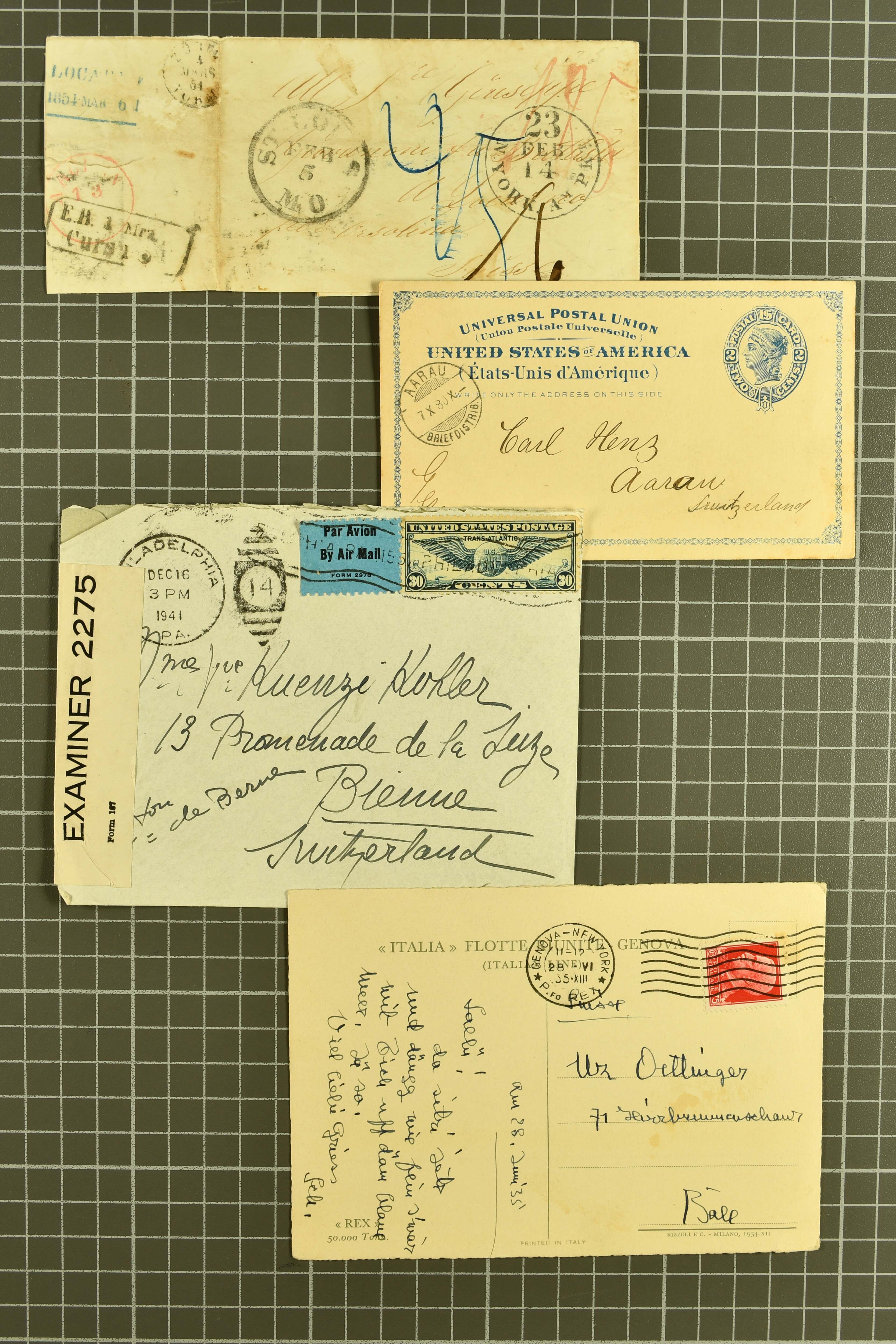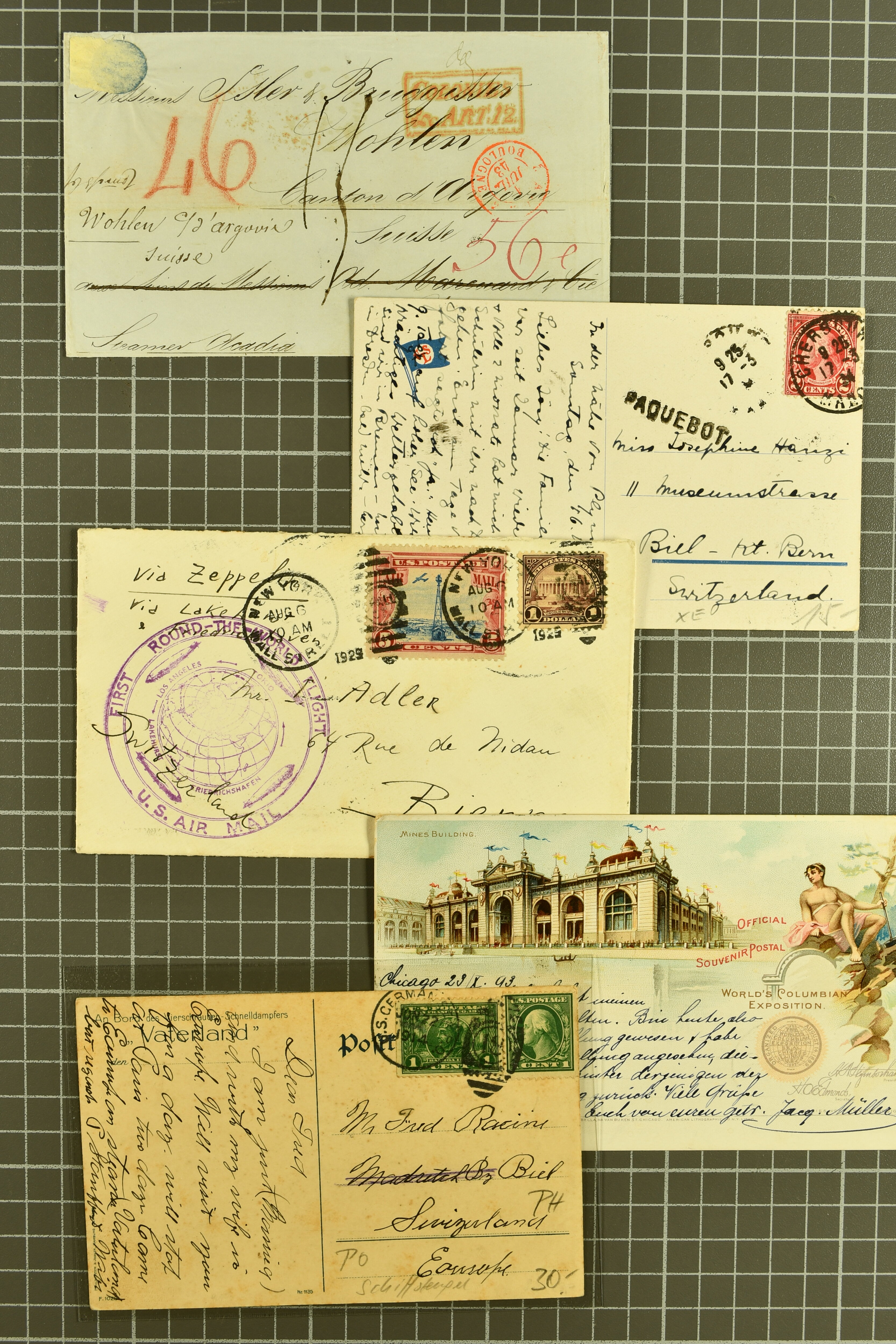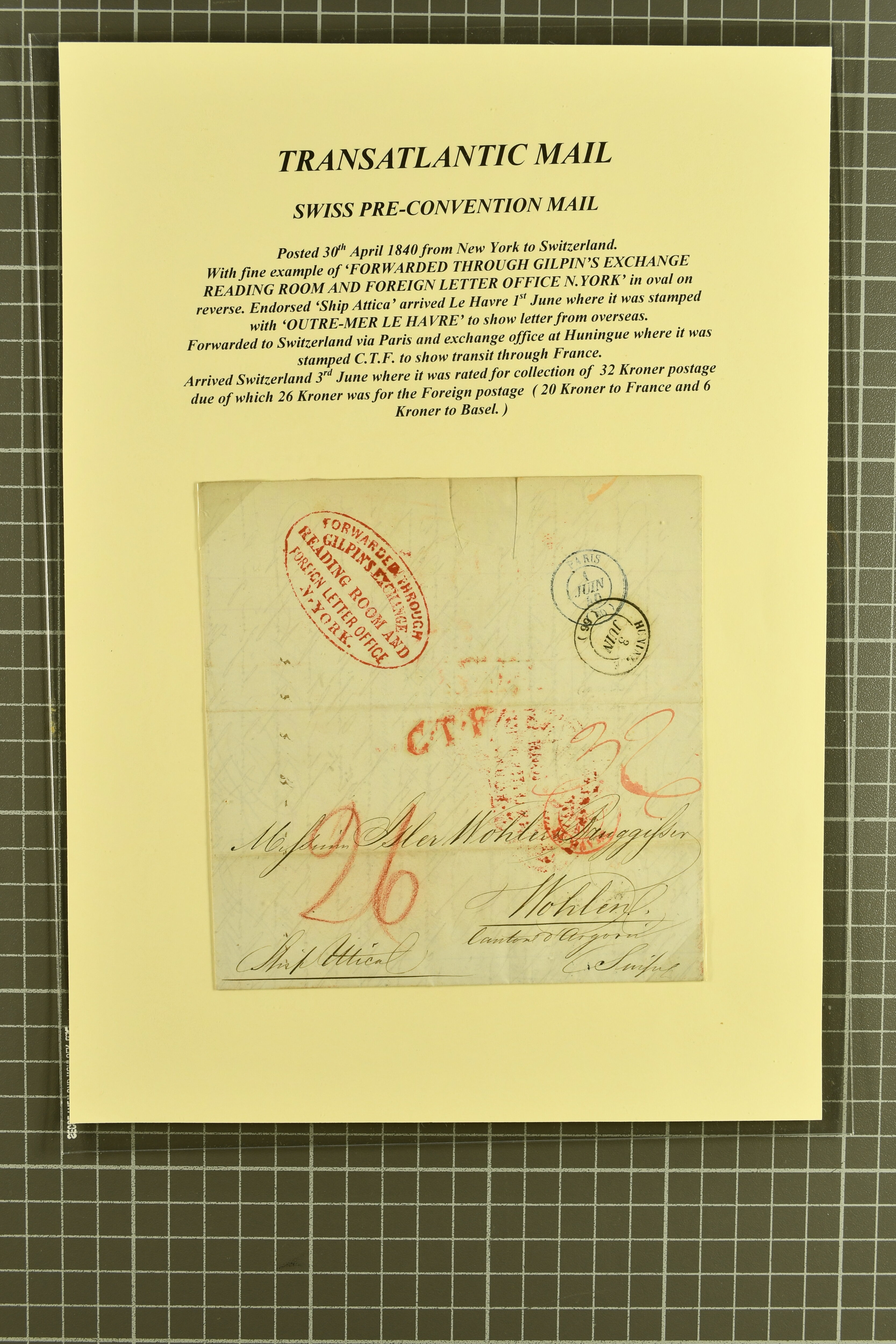 1152 cover image1840/1945C.: Covers / entire letters to Switzerland (39) from pre-stamp period with Transatlantic Mail incl. a fine 1840 entire letter to Wohlen forwarded through the Gilpin Exchange with superb strike of the Forwarding cachet in red, 1854 cover from St. Louis to Locarno via New York, Southampton and Aachen; also Zeppelin mail, Naval mail, Puerto Rico, covers from named Steamers etc (Image 1) (Image 2) (Image 3) (Image 4) (Image 5) (Image 6) (Image 7) (Image 8) (Image 9) (Image 10) (Image 11) (Image 12)