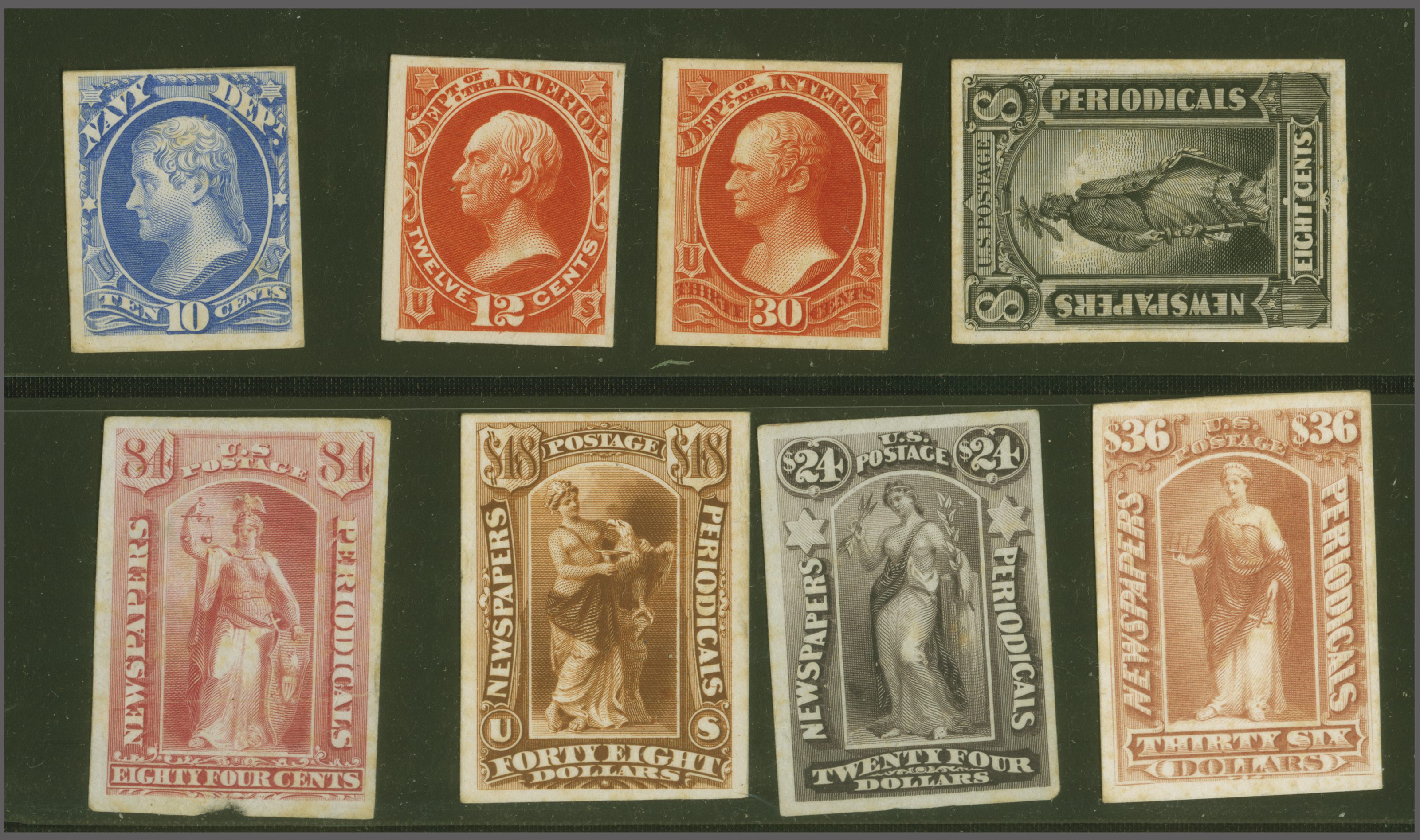 1148 (*) image1880c.: Imperforate Dept of Interior 12 c. and 30 c. vermilion Plate Proofs on card, Navy Dept. 10 c. ultramarine Plate Proof on card, Newspapers 8 c. blackish-purple, $ 18 red-brown, $ 24 purple and $ 36 rose Plate Proofs on card and a defective 84 c. rose on India paper (Image 1)