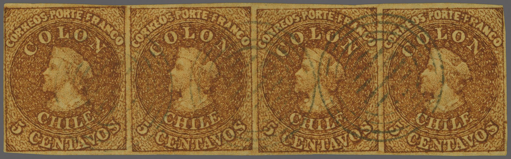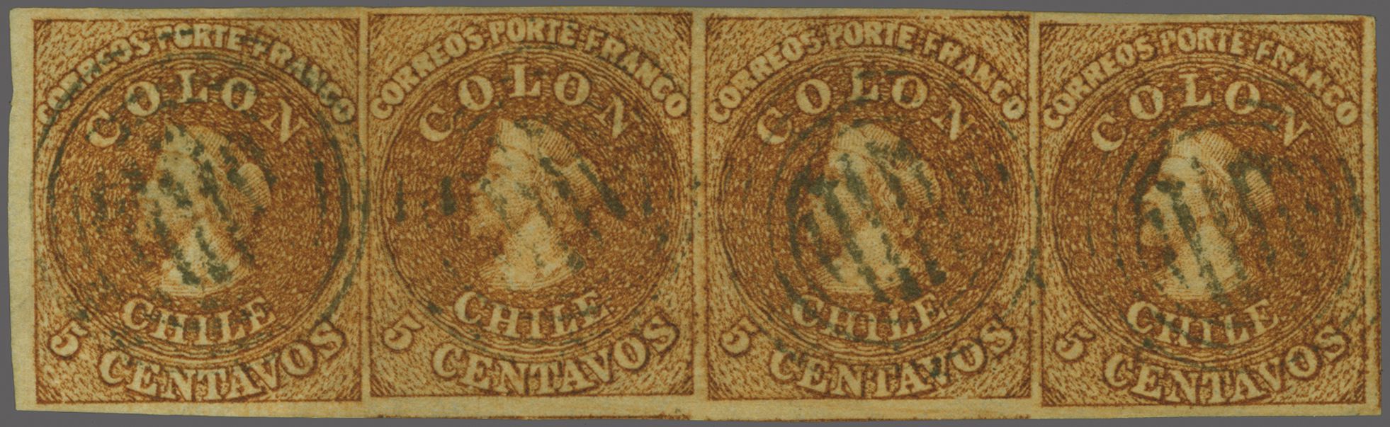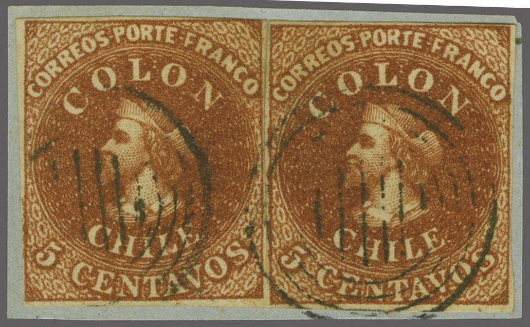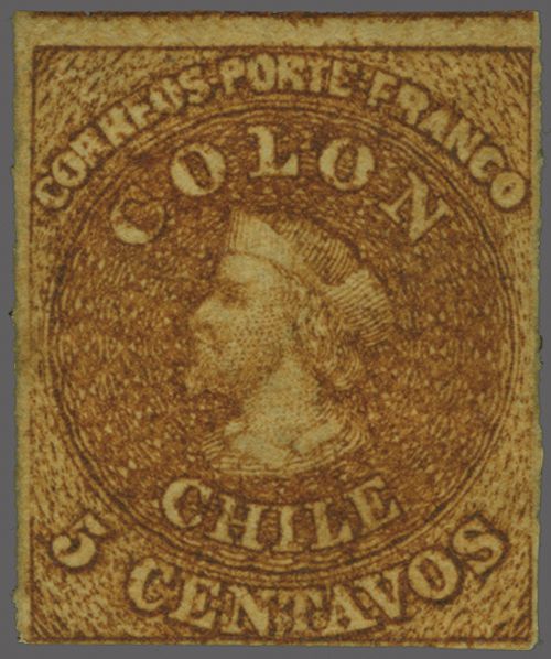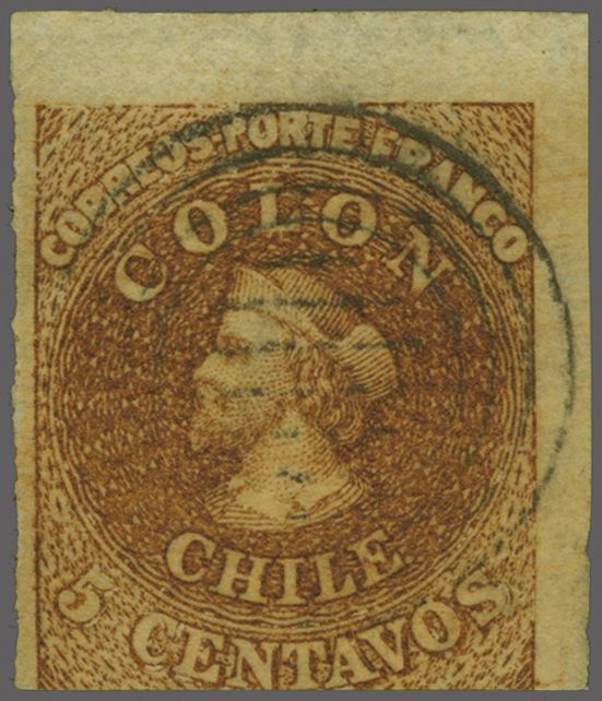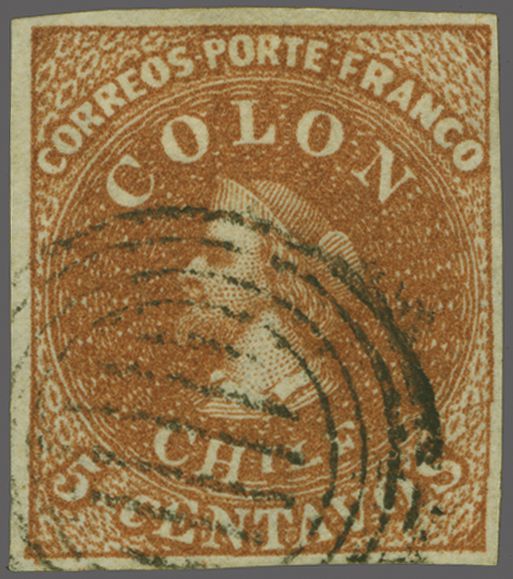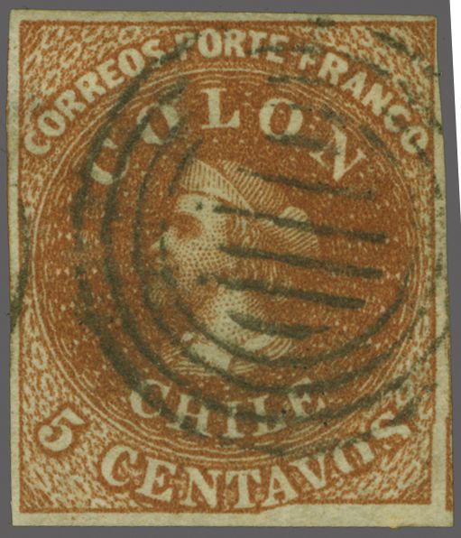 Lithographed by Gillet 1854 (April): Lithographed 5 c. red-brown, a used example with large margins all round, Lithographic Transfer Flaw with "C" of CENTAVOS and "ILE" of CHILE squeezed (Blank 5 Vt 2/2) lightly cancelled by