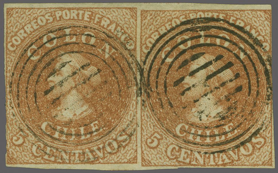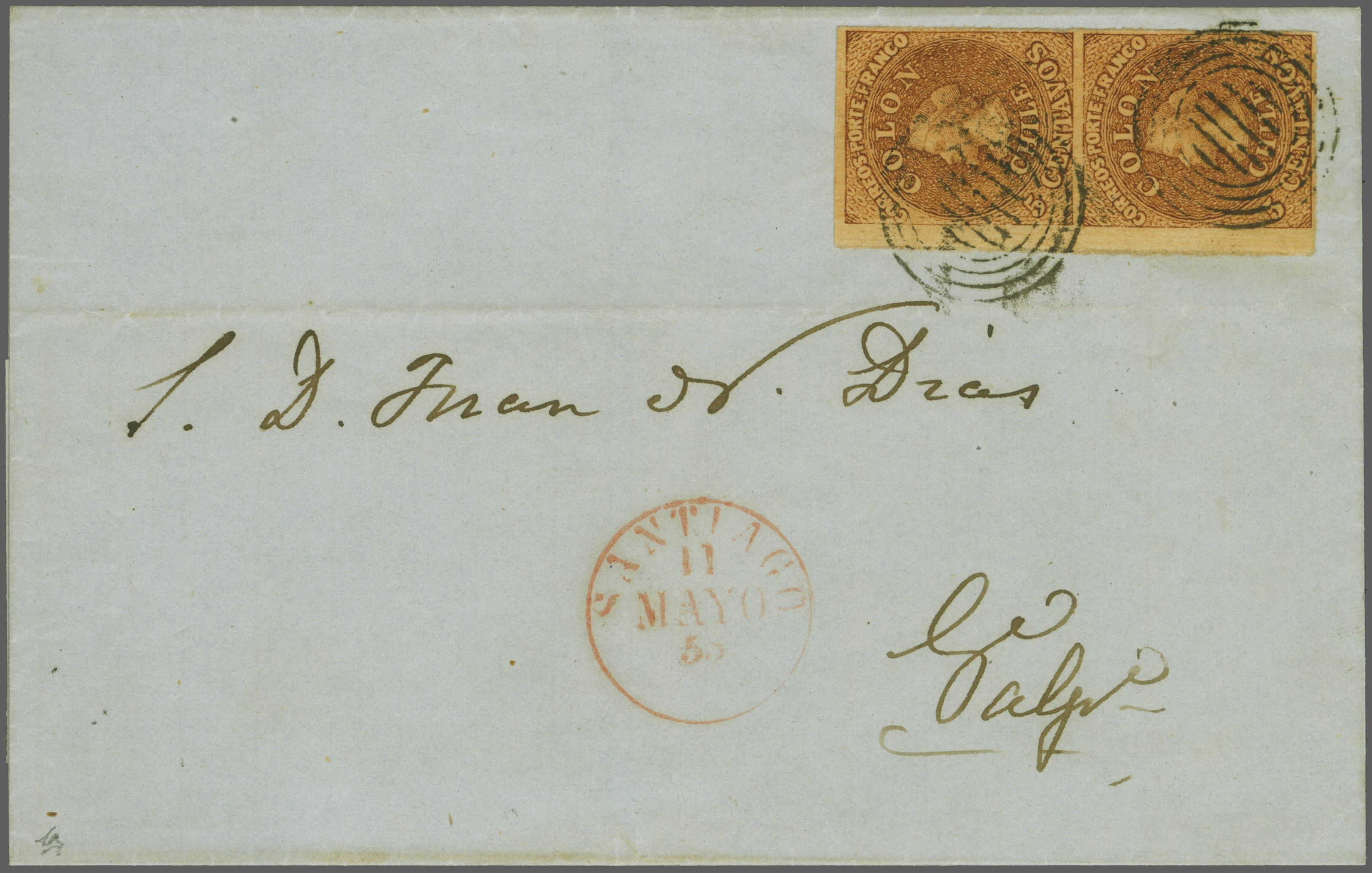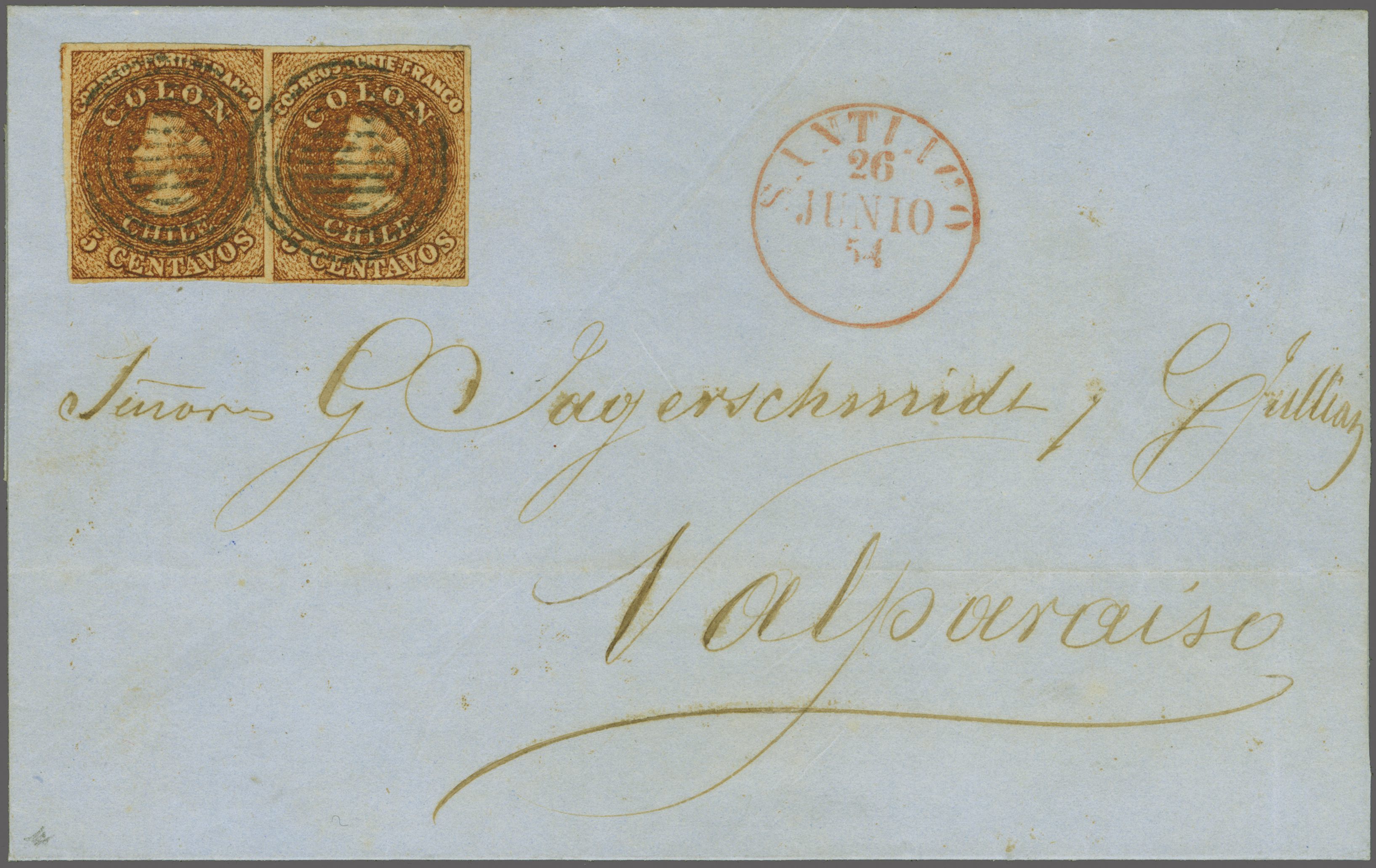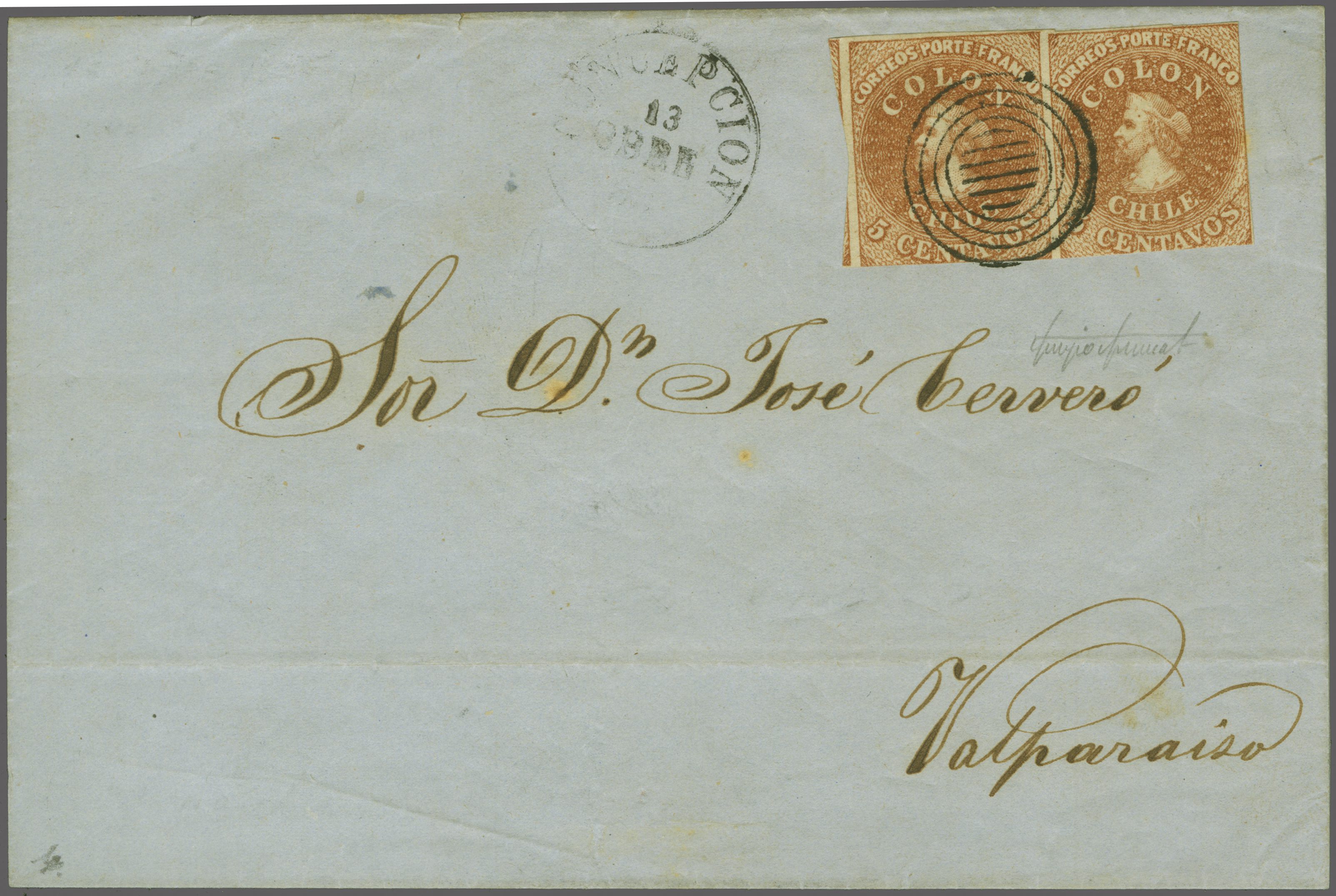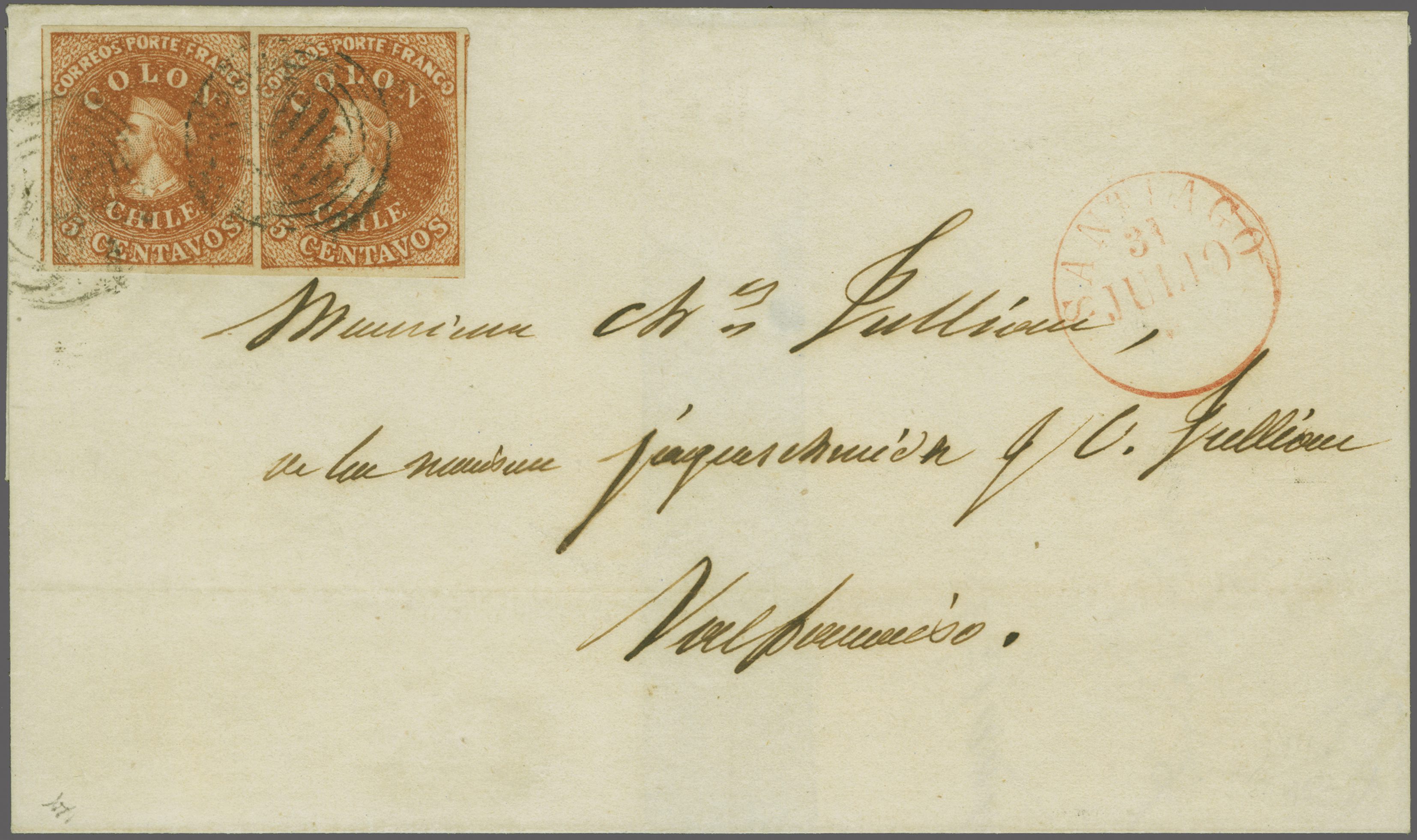 Gillet Recess Printing 1854 (April): 5 c. burnt sienna, a horizontal pair with large margins all round, used on 1854 cover from Santiago to Valparaiso at double rate, neatly cancelled by target handstamps in black with