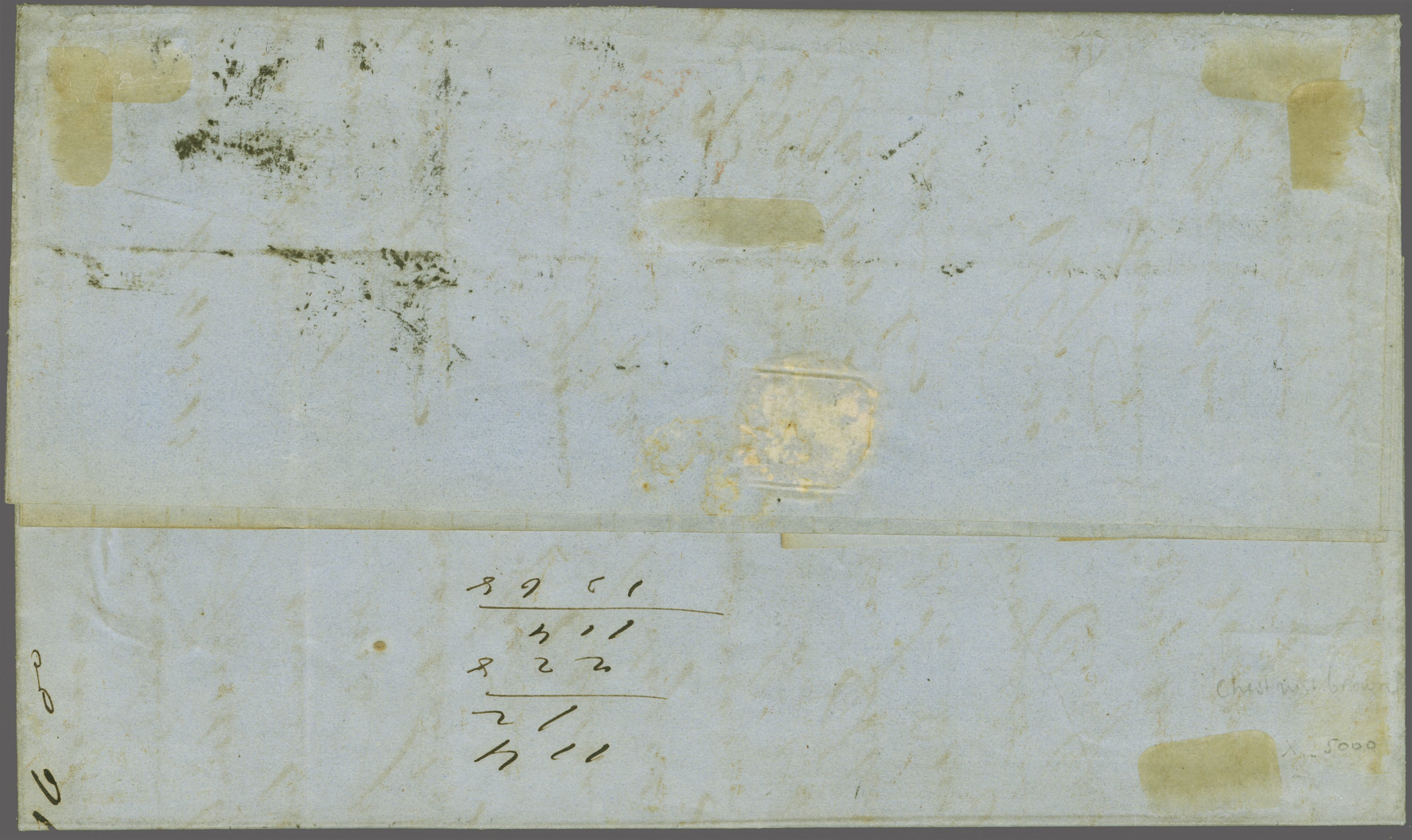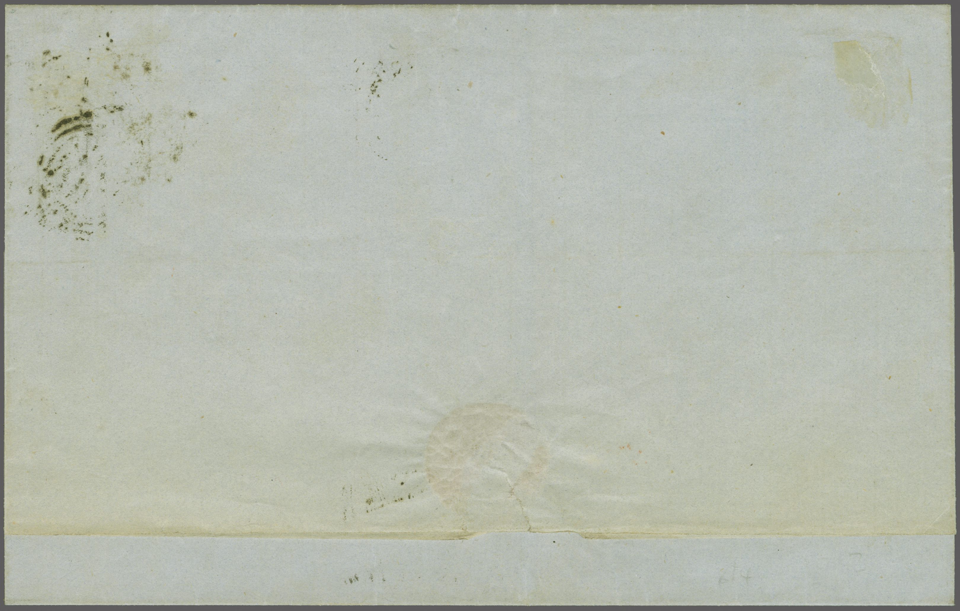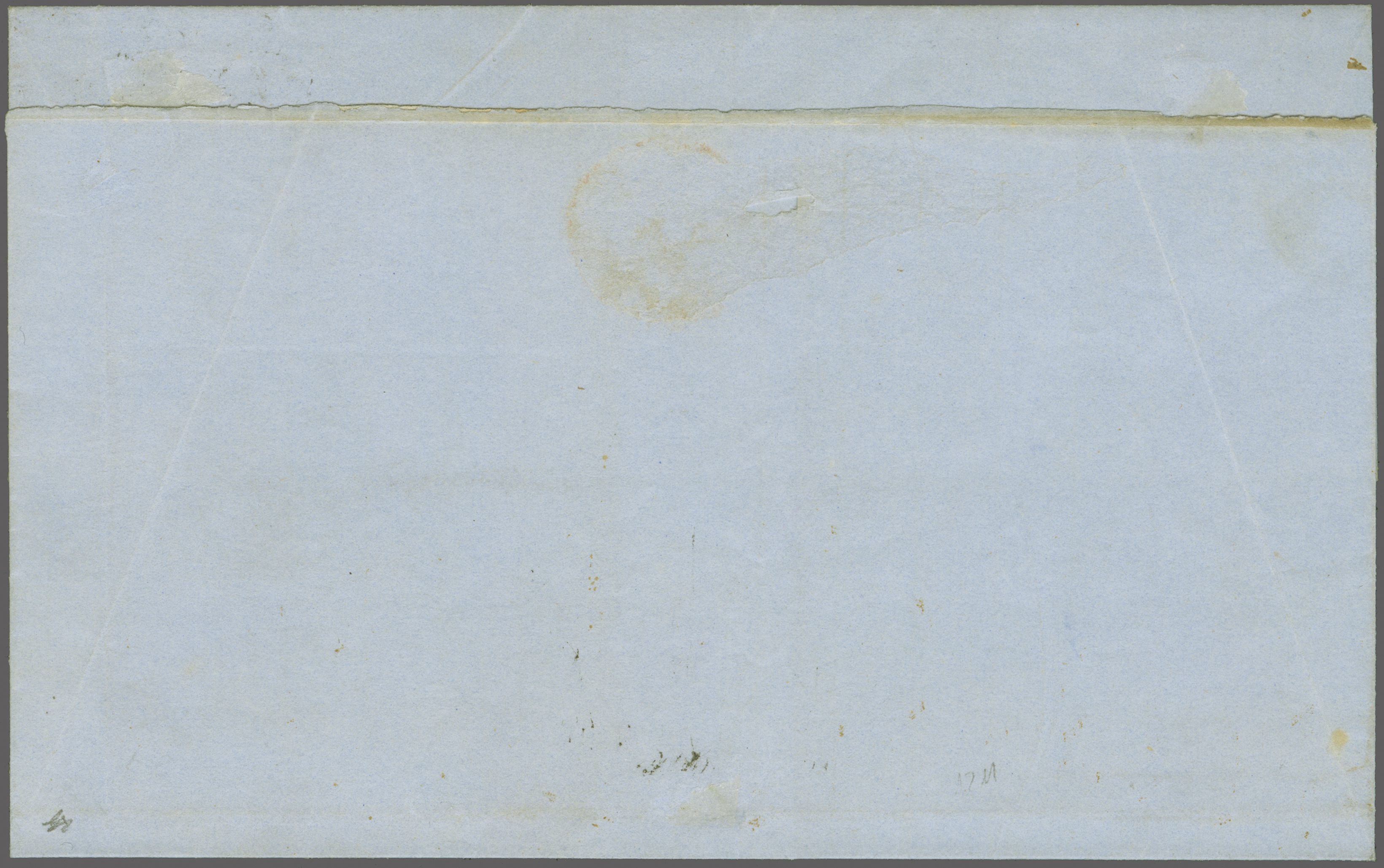 Lithographed by Gillet 1854 (April): Lithographed 5 c. pale red-brown, a horizontal pair with large margins all round and showing portions of adjoining stamps at left and at right, used on 1855 double rate cover to Valparaiso