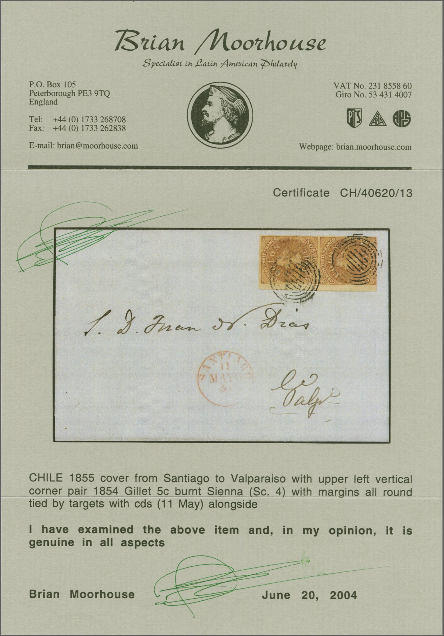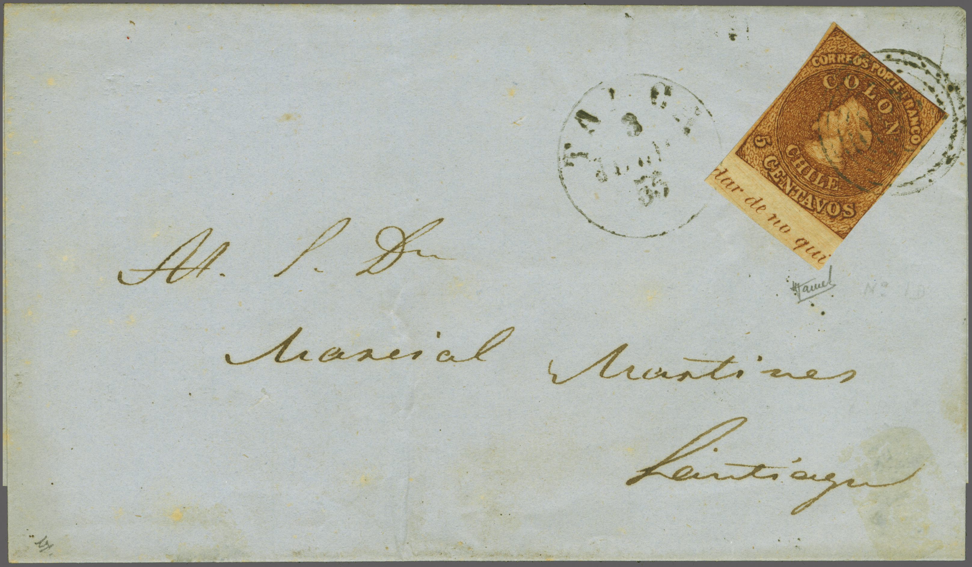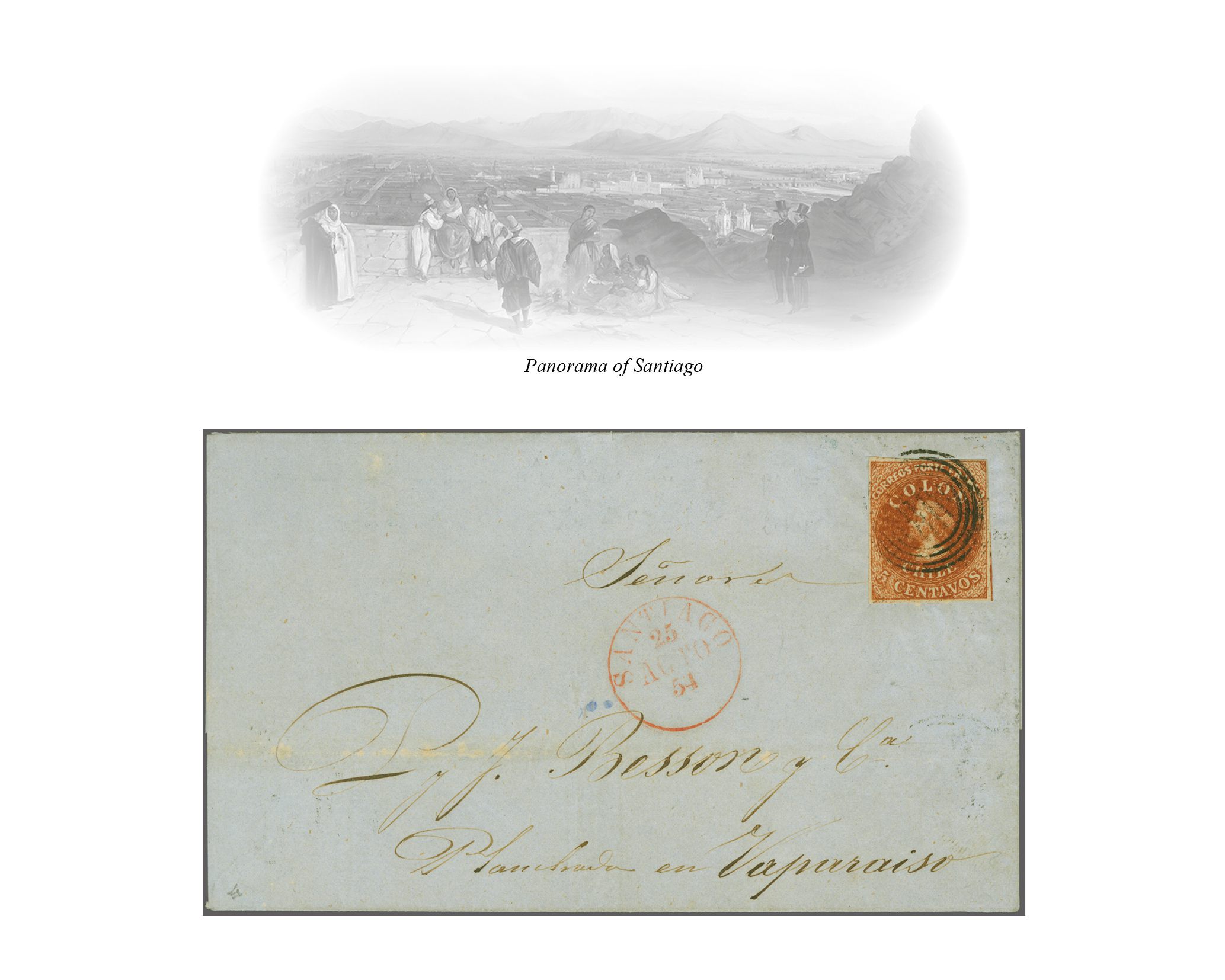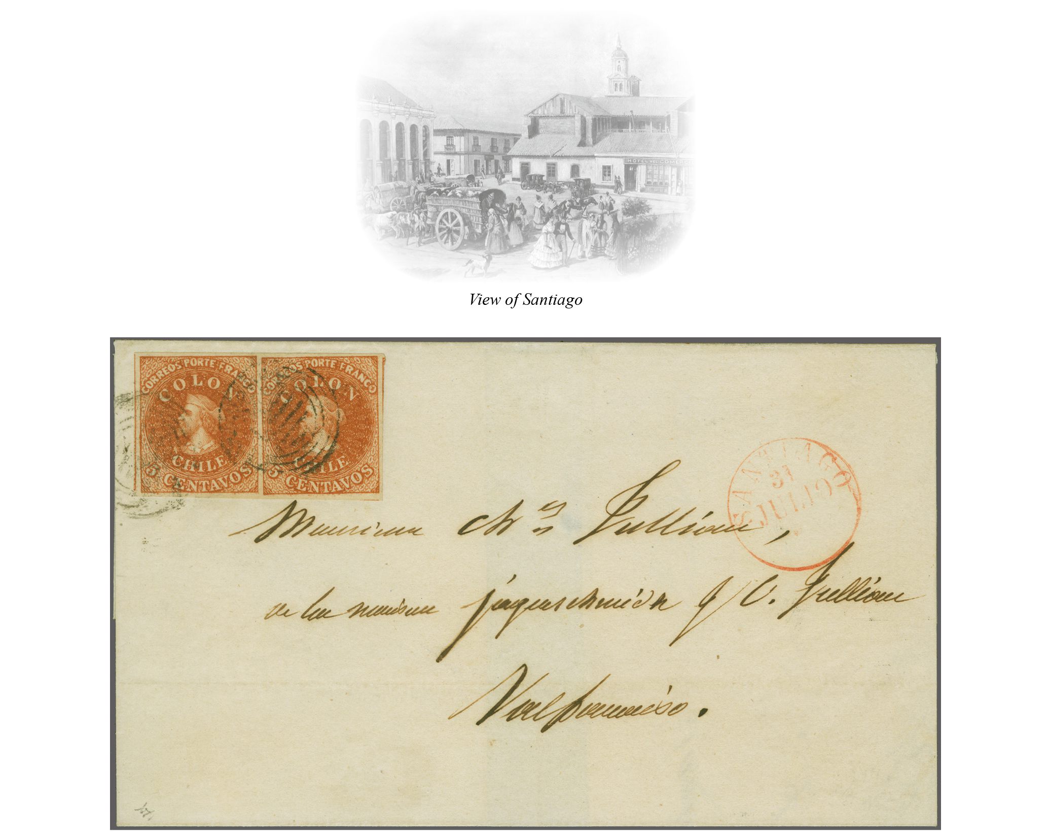 Cert. Sismondo (2004). Note: The adhesives on this cover are illustrated in "Chile - The First Issues of Postage Stamps" by Gerhard Blank on plate 29. Provenance: Collection P. Marticorena (Image 1)
