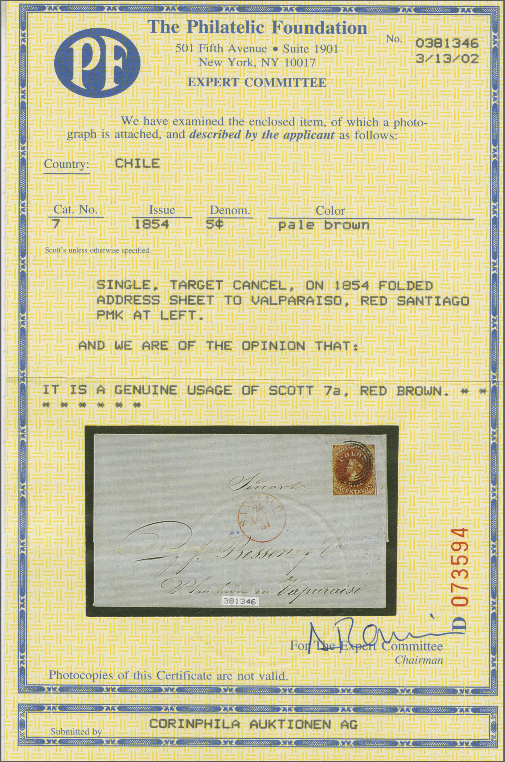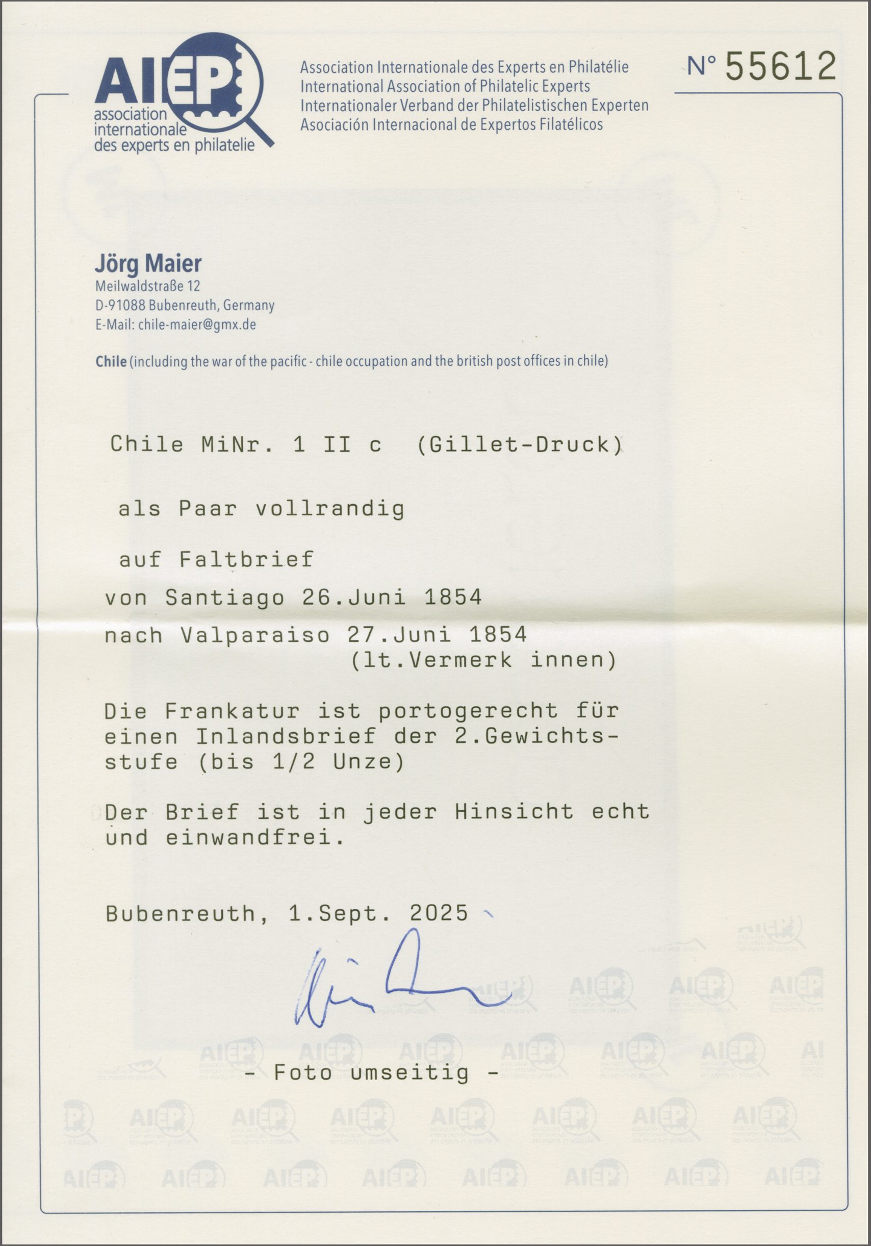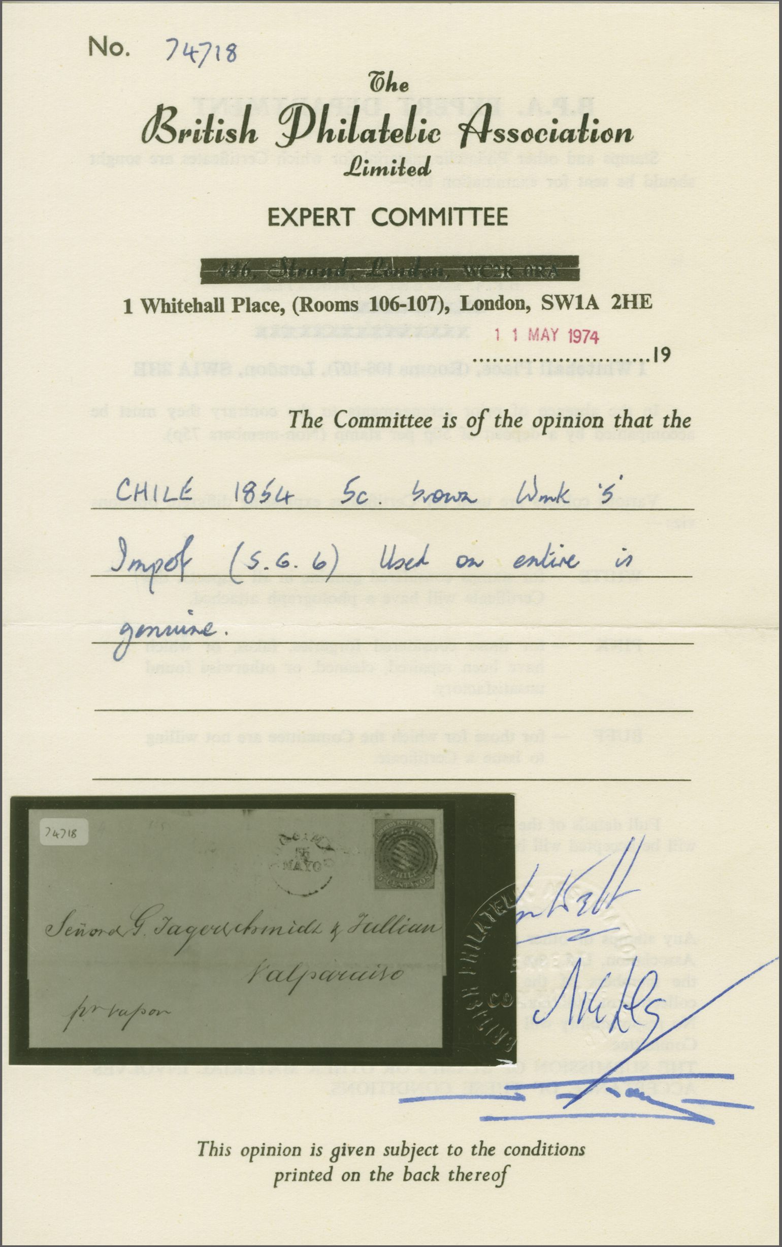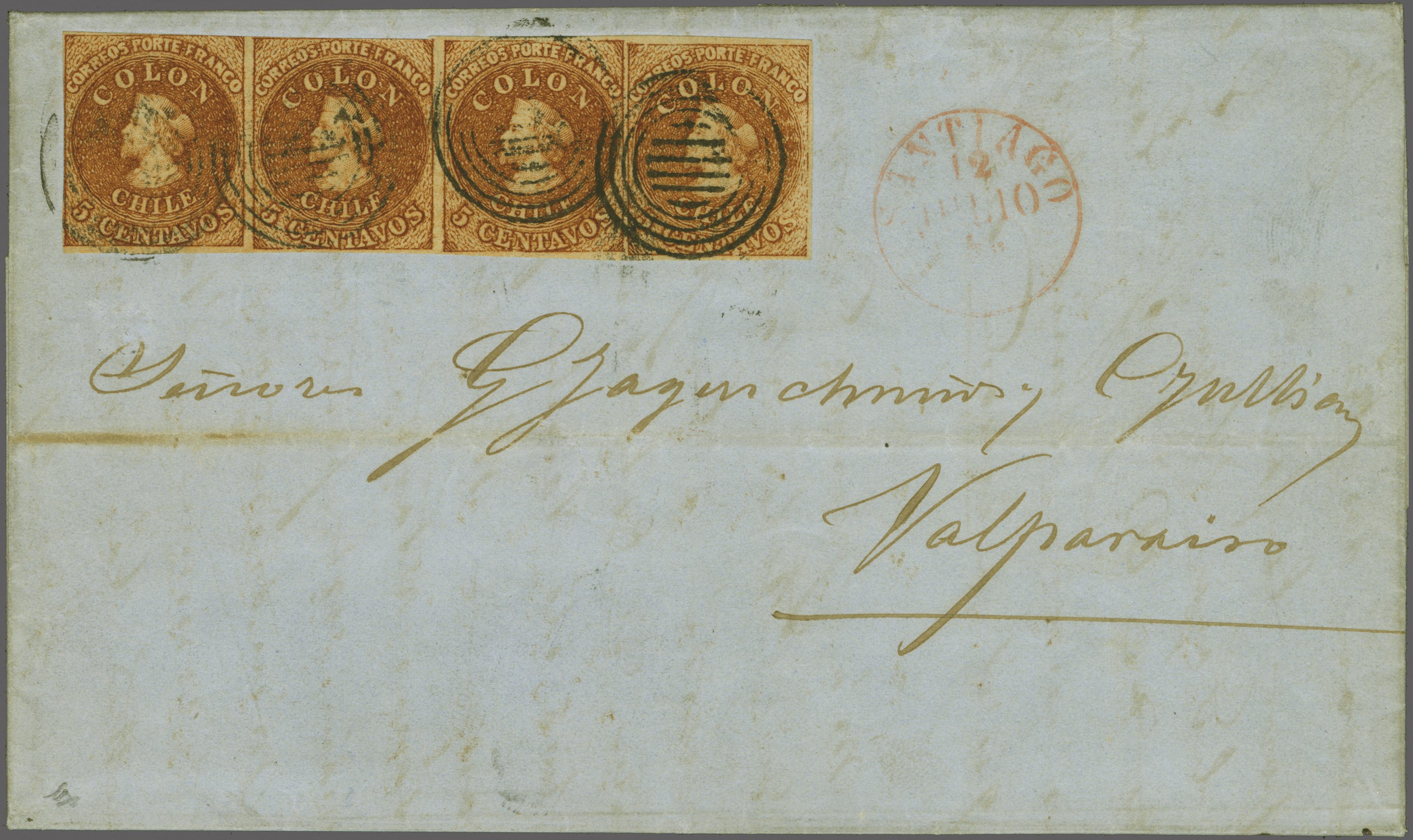 Cert. Sismondo (2004). Note: The adhesives on this cover are illustrated in "Chile - The First Issues of Postage Stamps" by Gerhard Blank on plate 29. Provenance: Collection P. Marticorena (Image 1)