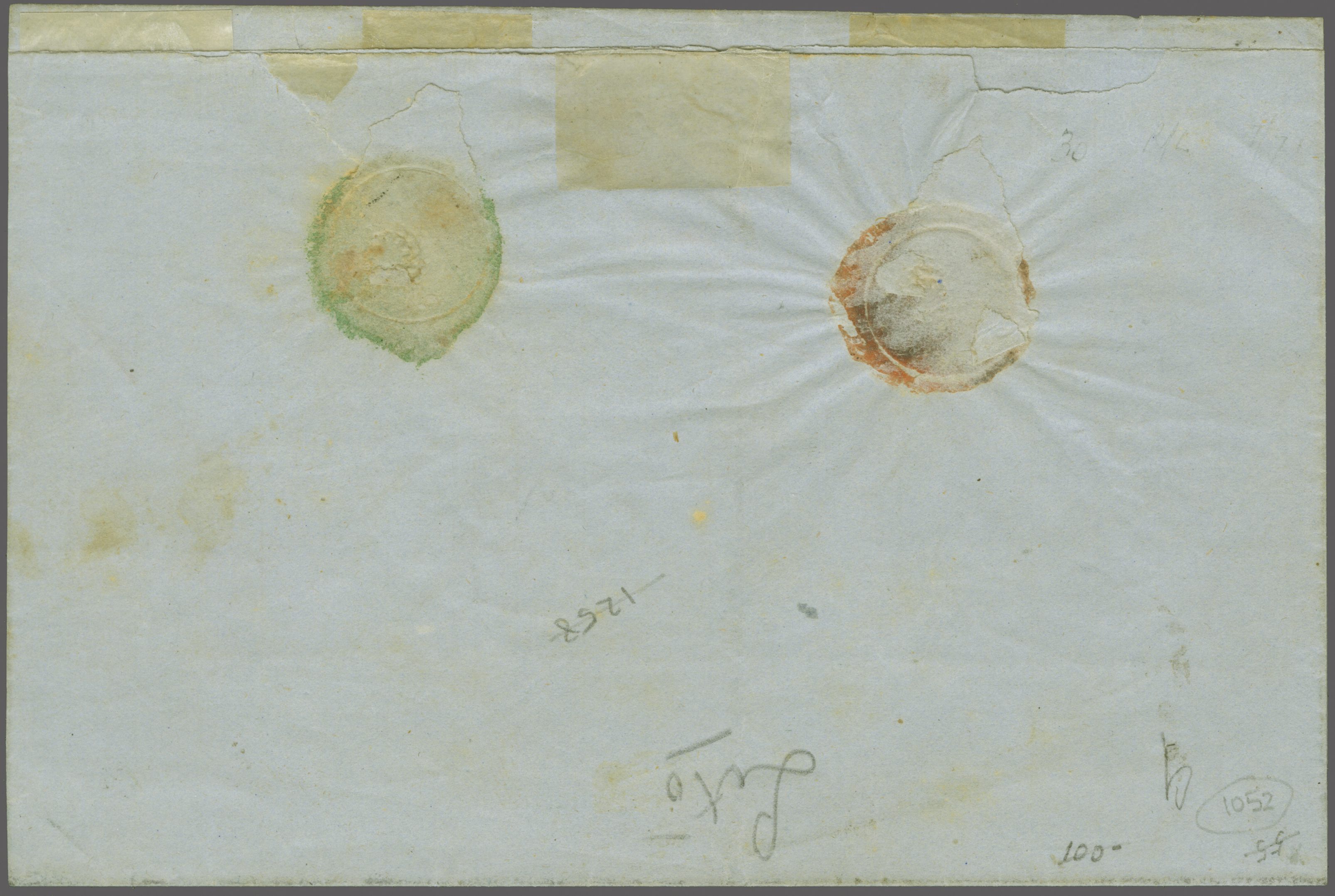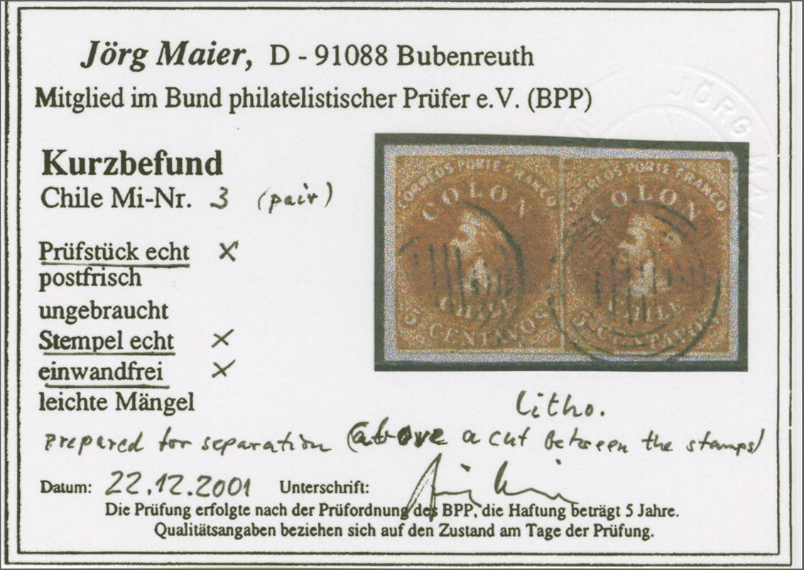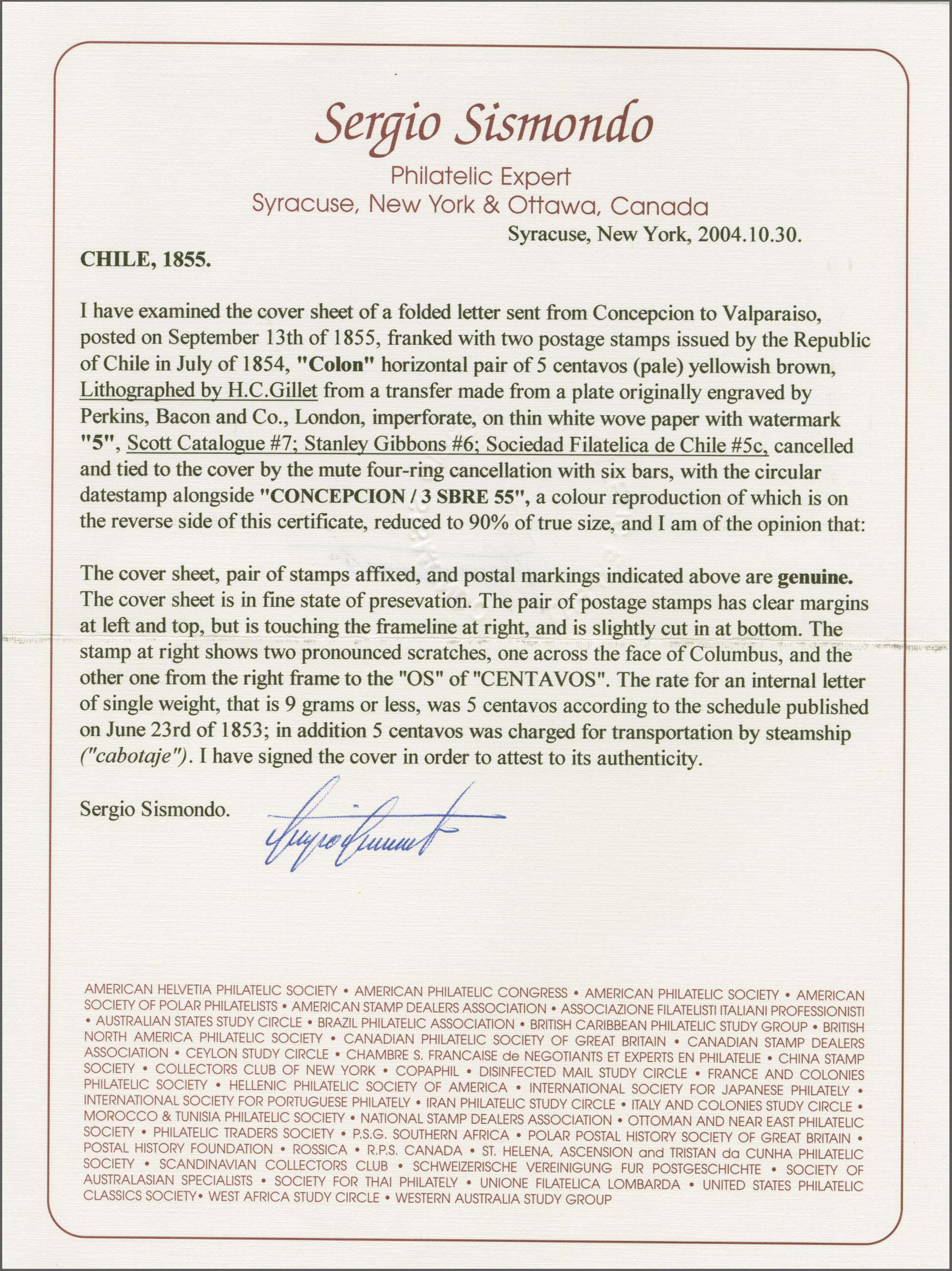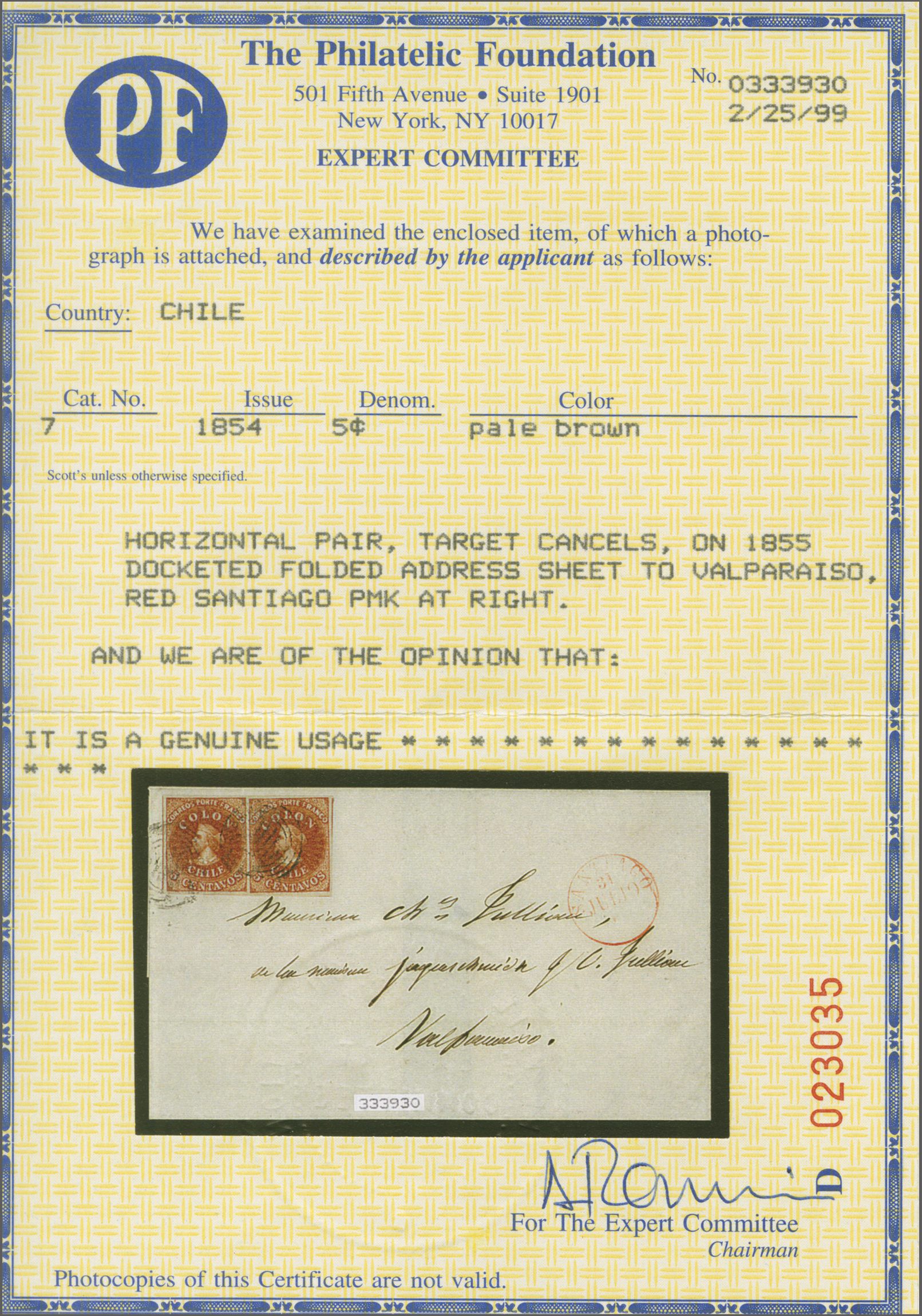 Cert. Sismondo (2004). Note: The adhesives on this cover are illustrated in "Chile - The First Issues of Postage Stamps" by Gerhard Blank on plate 29. Provenance: Collection P. Marticorena (Image 1)