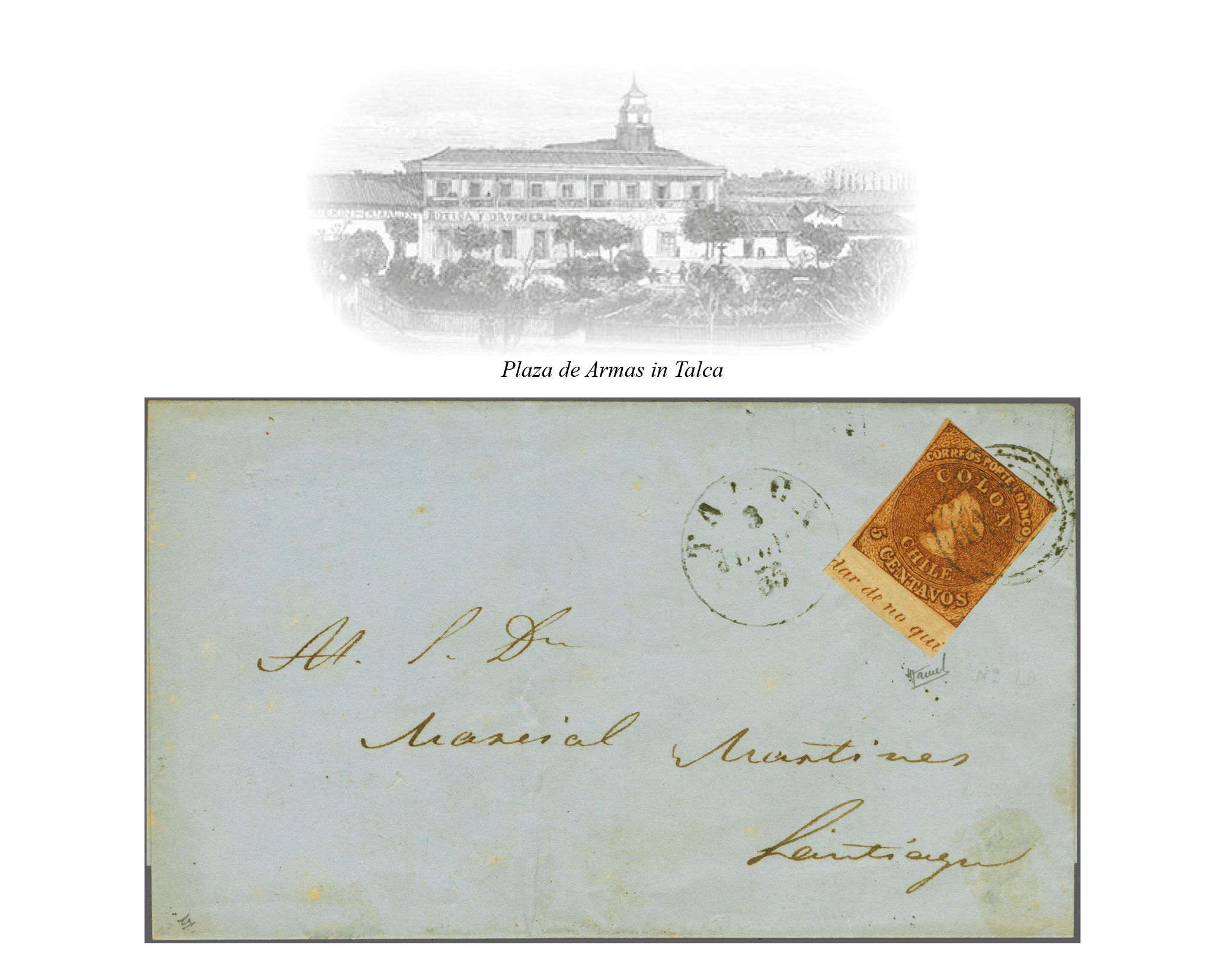cimiento)", used on 1855 cover to Santiago tied by target handstamp and by TALCA despatch cds (June 3) in black. Some minor cover imperfections but an extraordinary and extremely rare cover. Signed Jamet Scott = $ 900+. Provenance: Corinphila sale