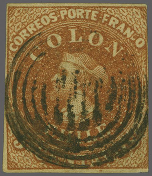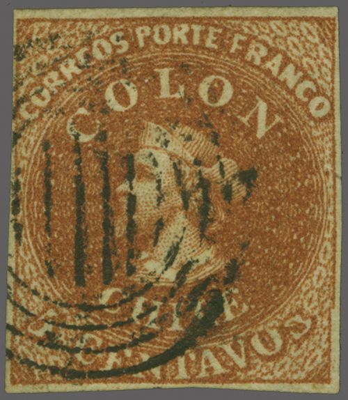 Lithographed by Gillet 1854 (April): Lithographed 5 c. red-brown, a used example with large margins all round and portion of adjoining stamp at right, with Lithographic Transfer Flaw with "VOS" of CENTAVOS squeezed and lower