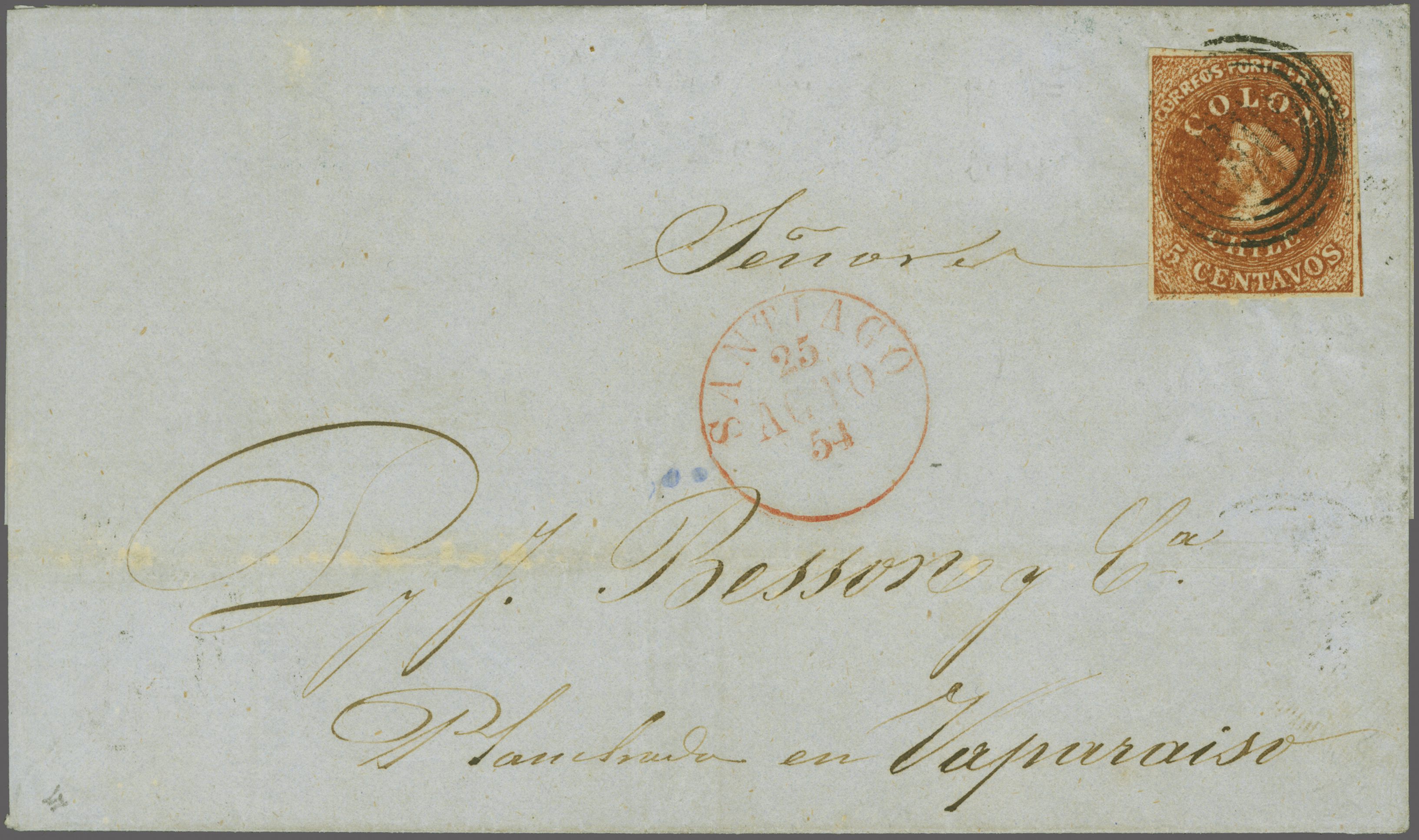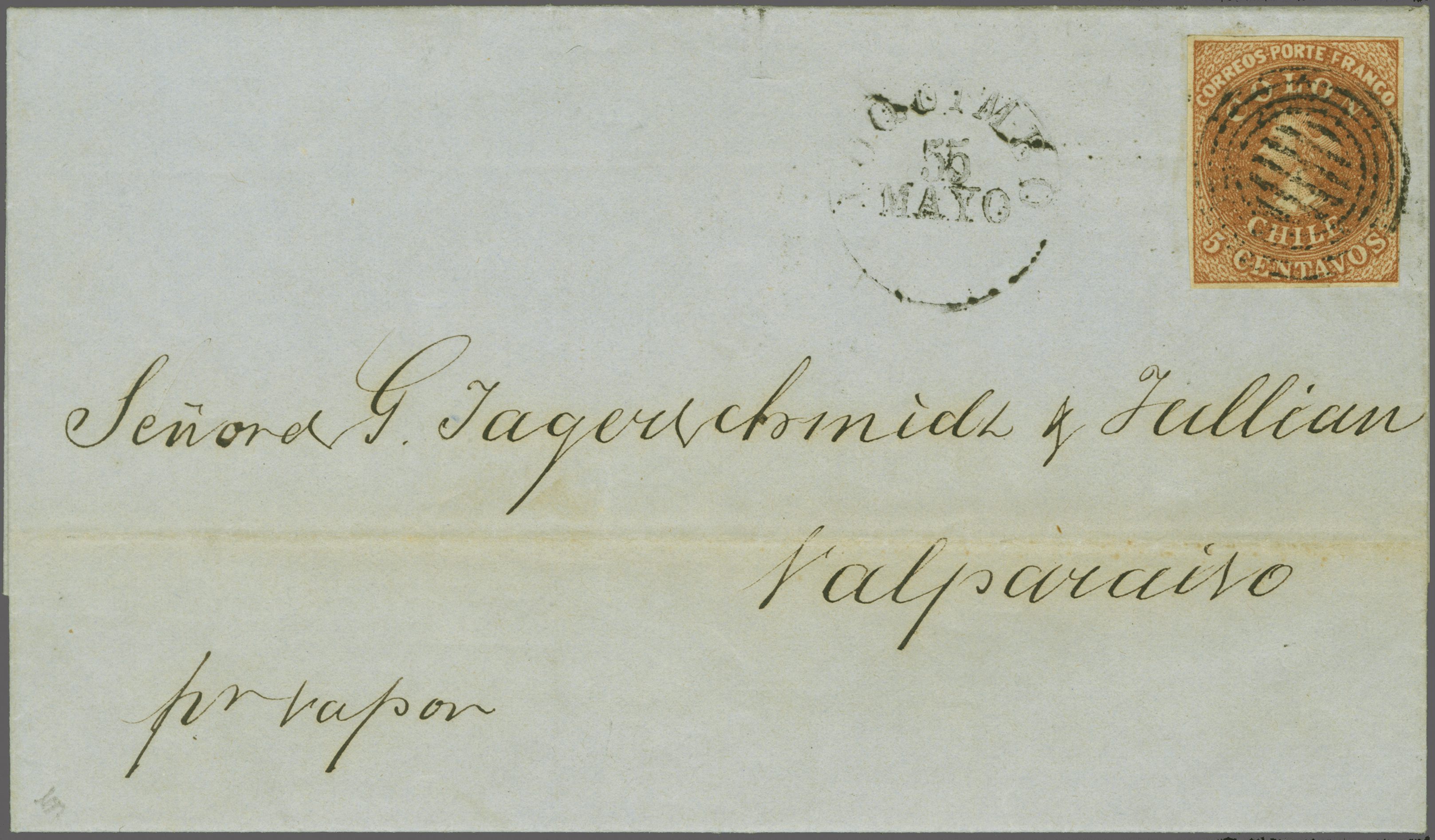 Lithographed by Gillet 1854 (April): Lithographed 5 c. pale reddish-brown (salmon shade), a used example with ample to large margins all round, on 4 May 1855 entire letter from Serena to Valparaiso endorsed "pr. Vapor", tied