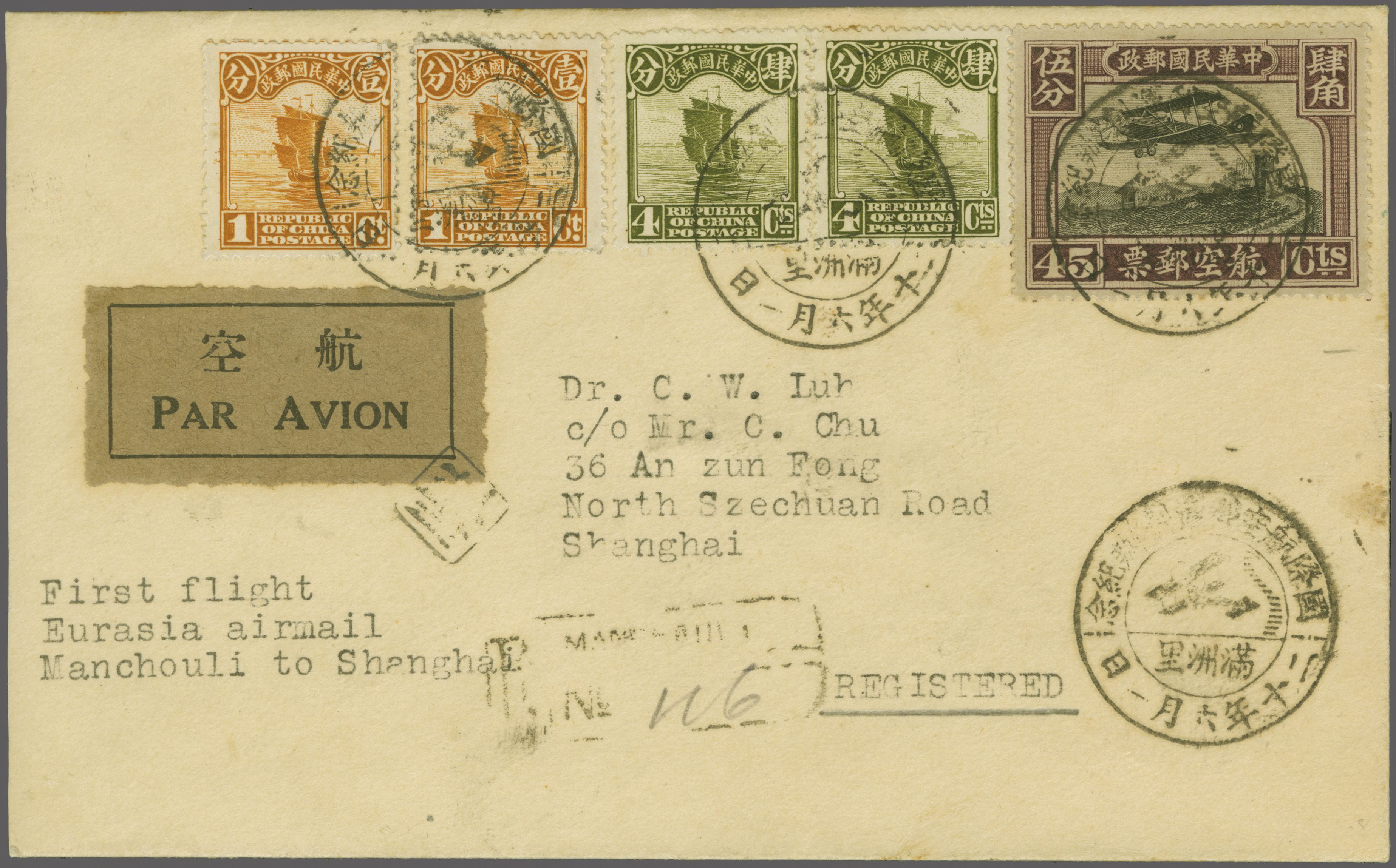 First Eurasia Flight Manzhouli - Schanghai 1931 (June 1): Registered envelope franked with China 1921 airpost 45 c. toghether additional Junk 1c. (2) and 4 c. (2) tied by special flight cachet to envelope, backstamped on