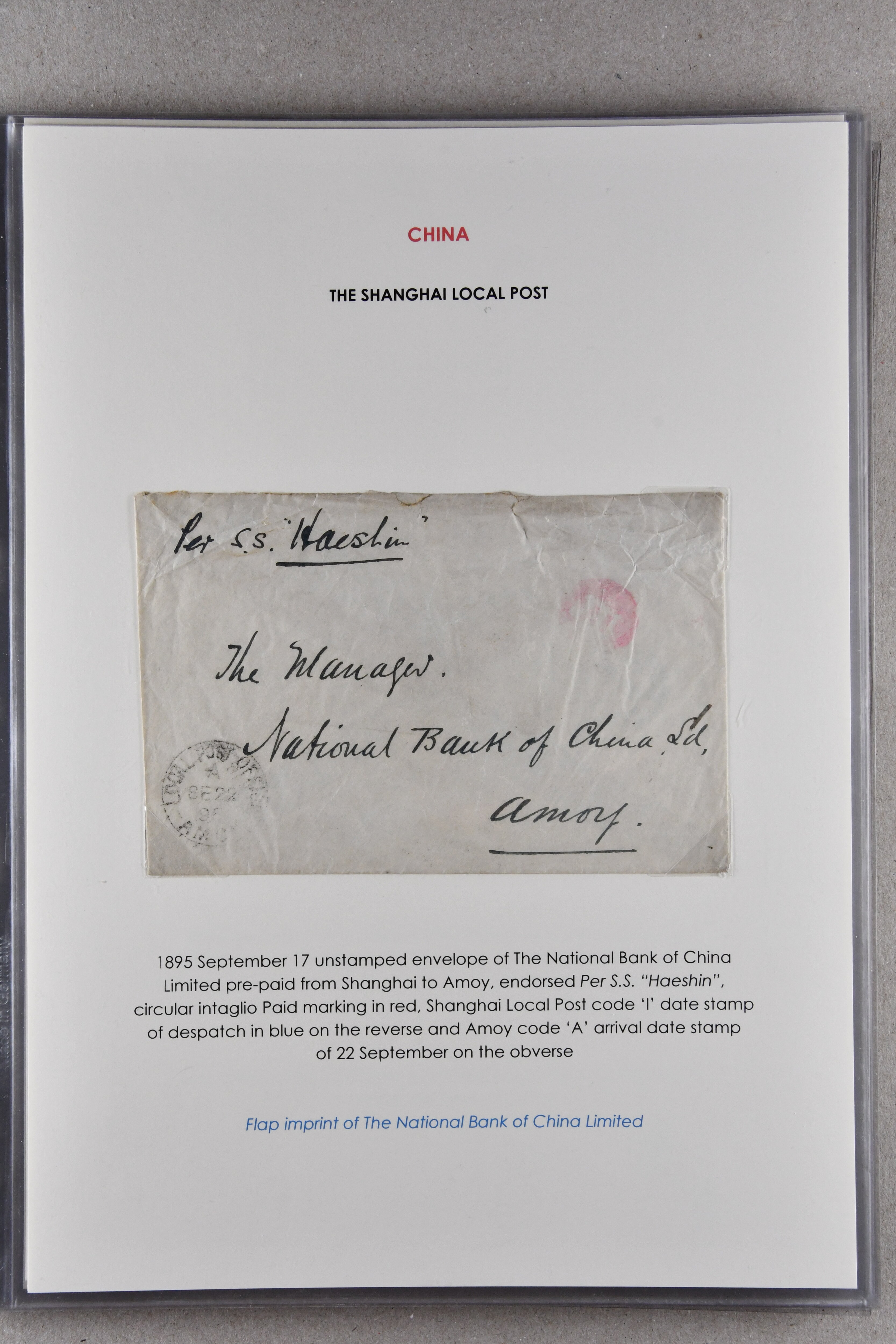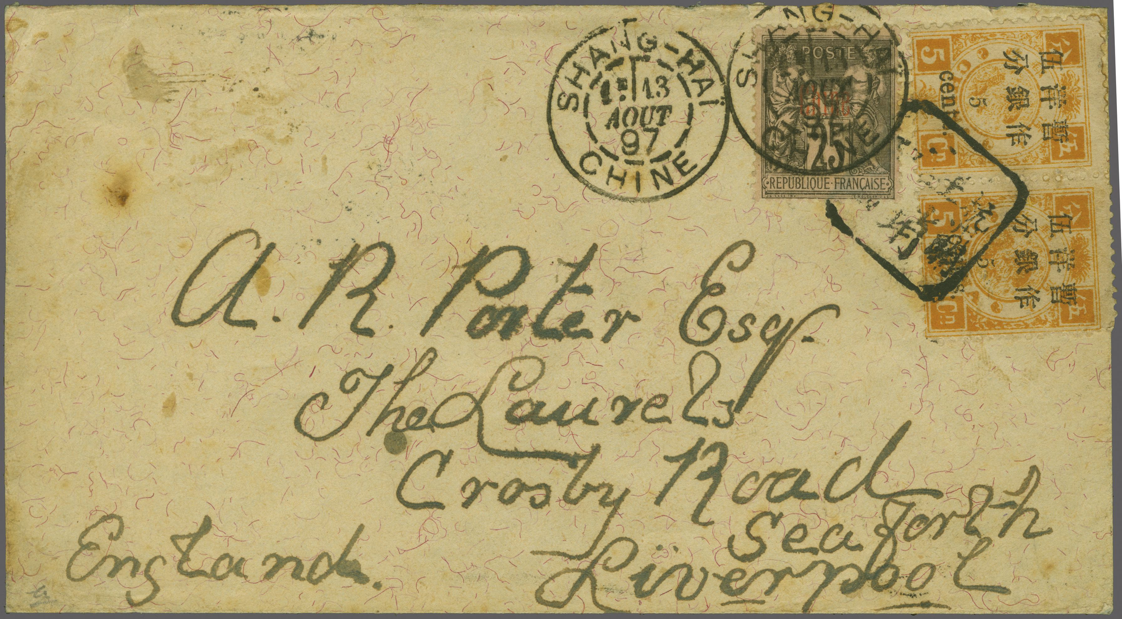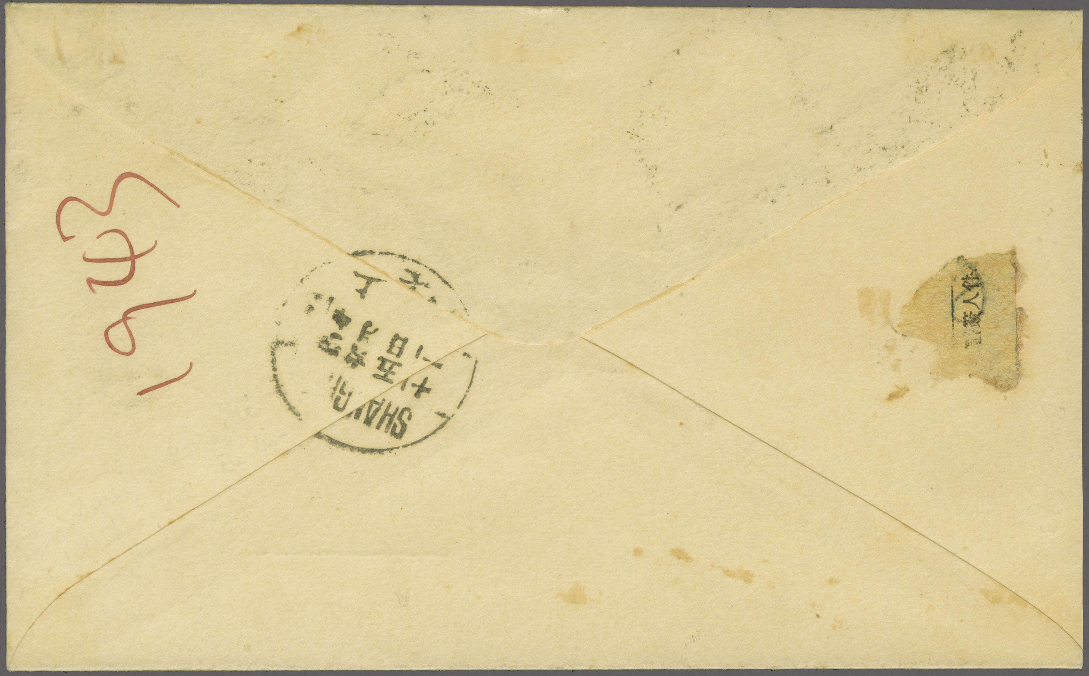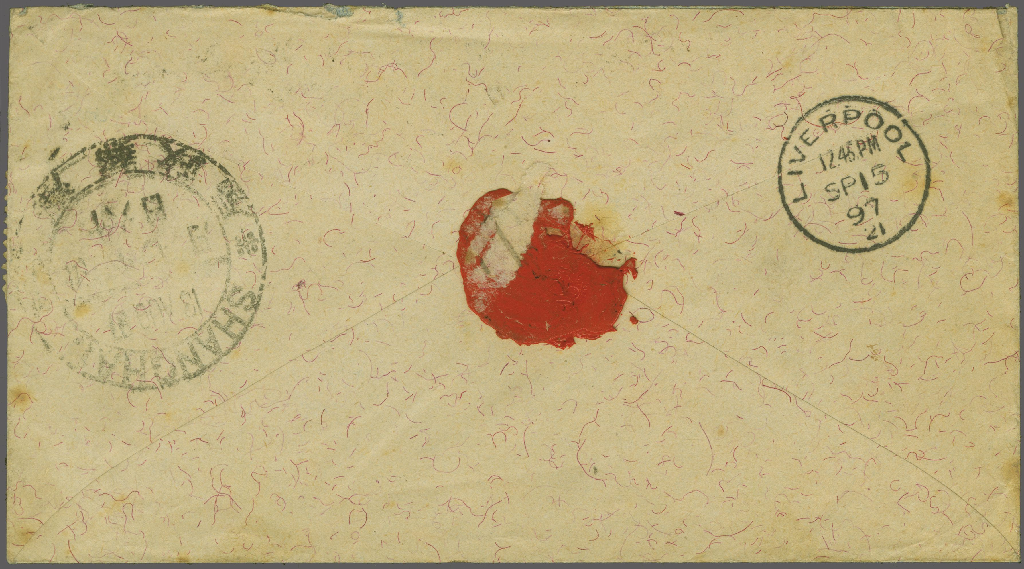applied for onward transmission and tied by "SHANG-HAI / CHINE" cds (Aug 13). Reverse with SHANGHAI Dollar Chop in black (Aug 13) and Liverpool arrival cds (Sept 15). A rare and very fine combination cover (Image 1)