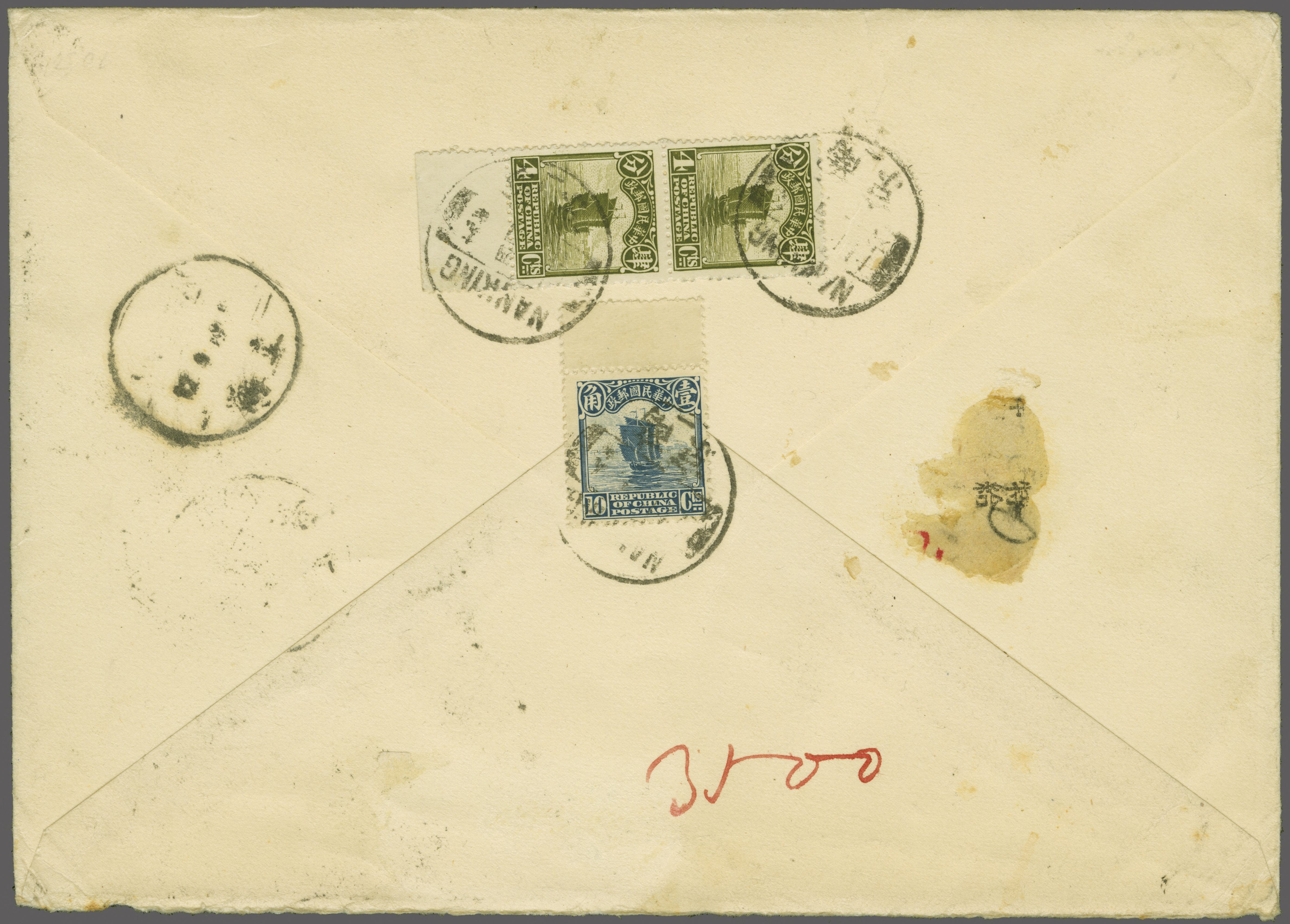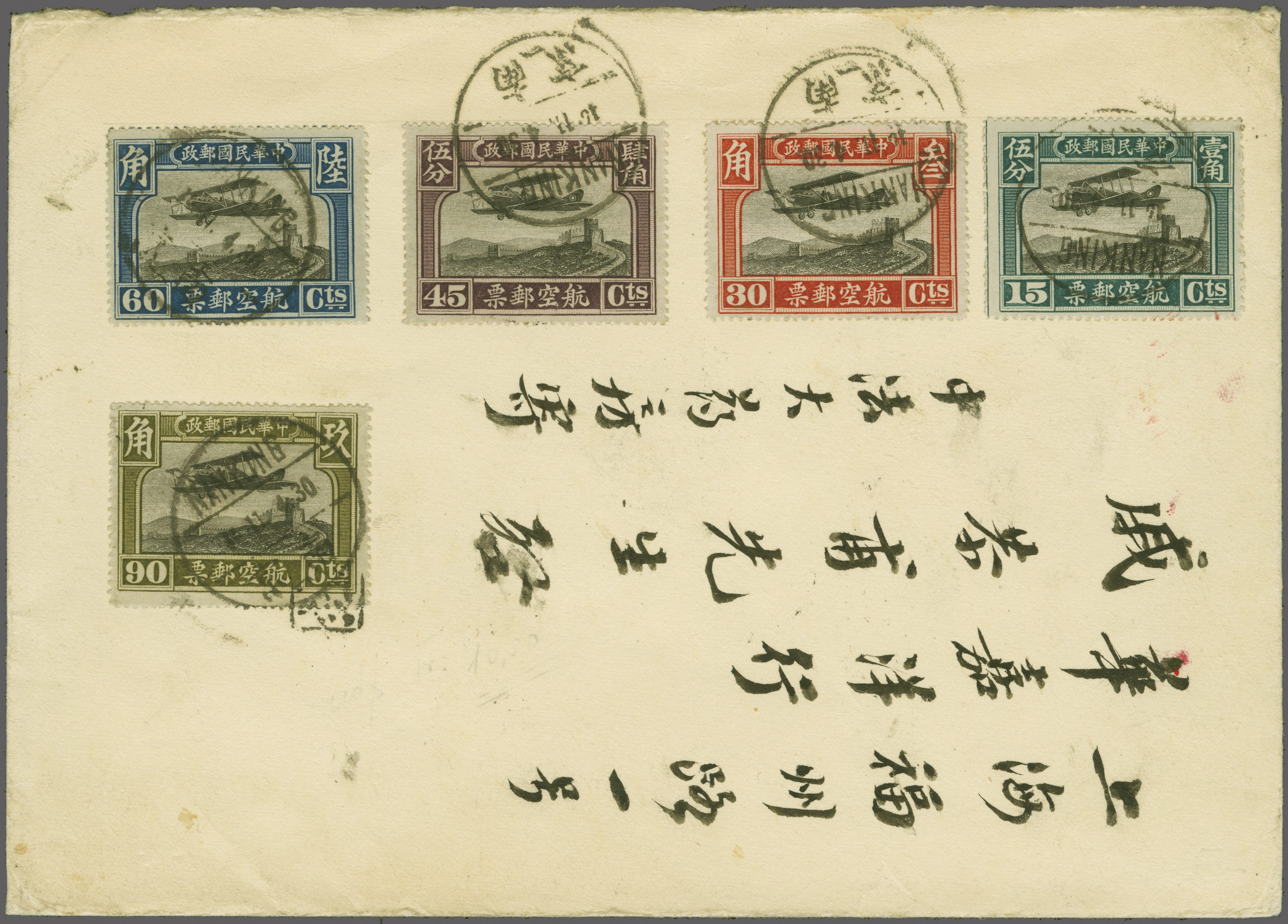 1930 (16. Nov.): Airmail envelope from Nanking to Shanghai, franked with 1921 Second Peking Print, complete set of five values 15 c. to 90 c. with additional Junk franking 4 cts. vertical pair and 10 c. blue on reverse, all