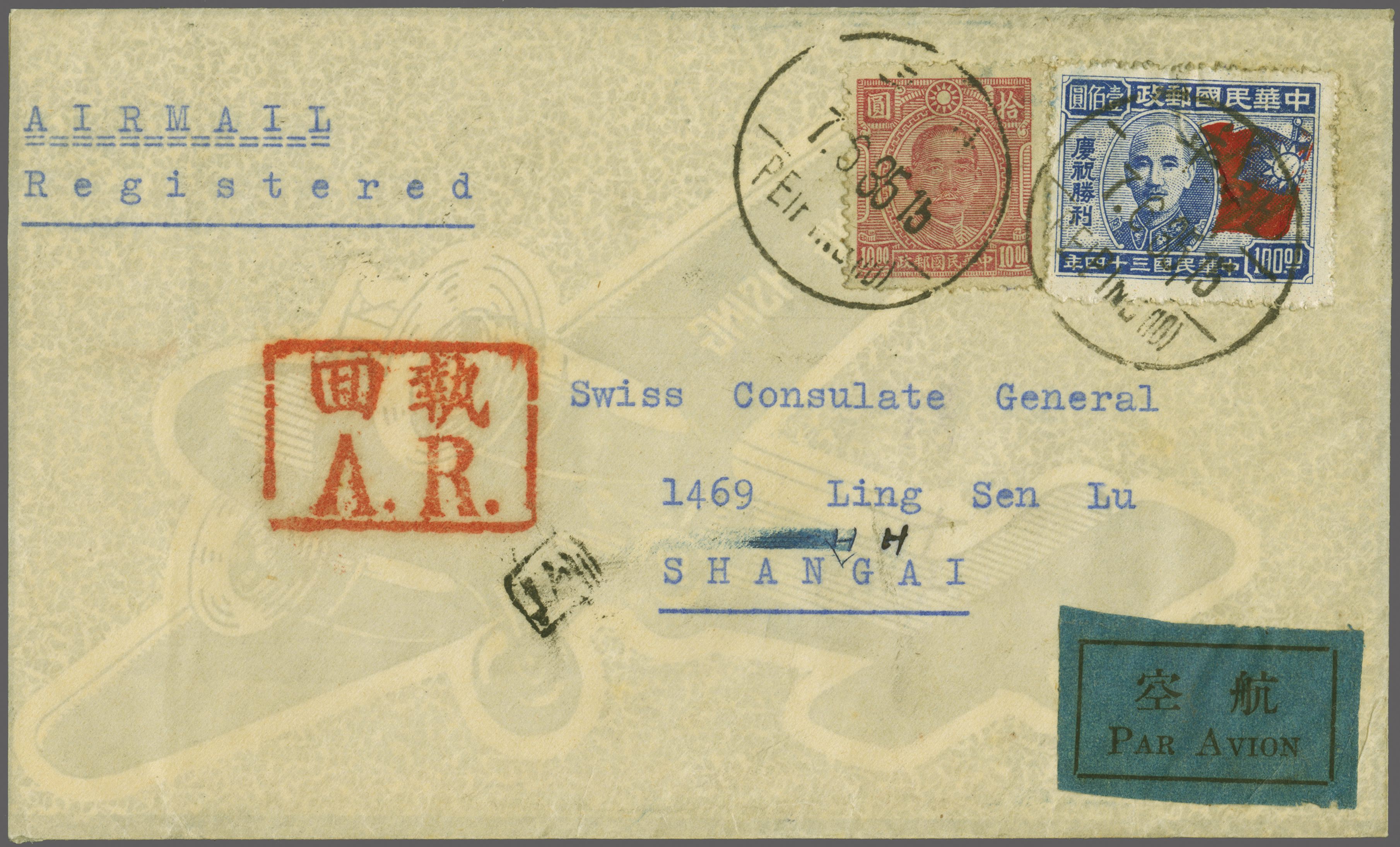1946 (June 7): Registered airmail cover from Peiping addressed to Swiss General Consulate in Shanghai, franked with Sun Yat-sen 1944 $10 claret and 1945 Chiang Kai-shek Victory Flag $100 blue tied by Peiping cds.'s to