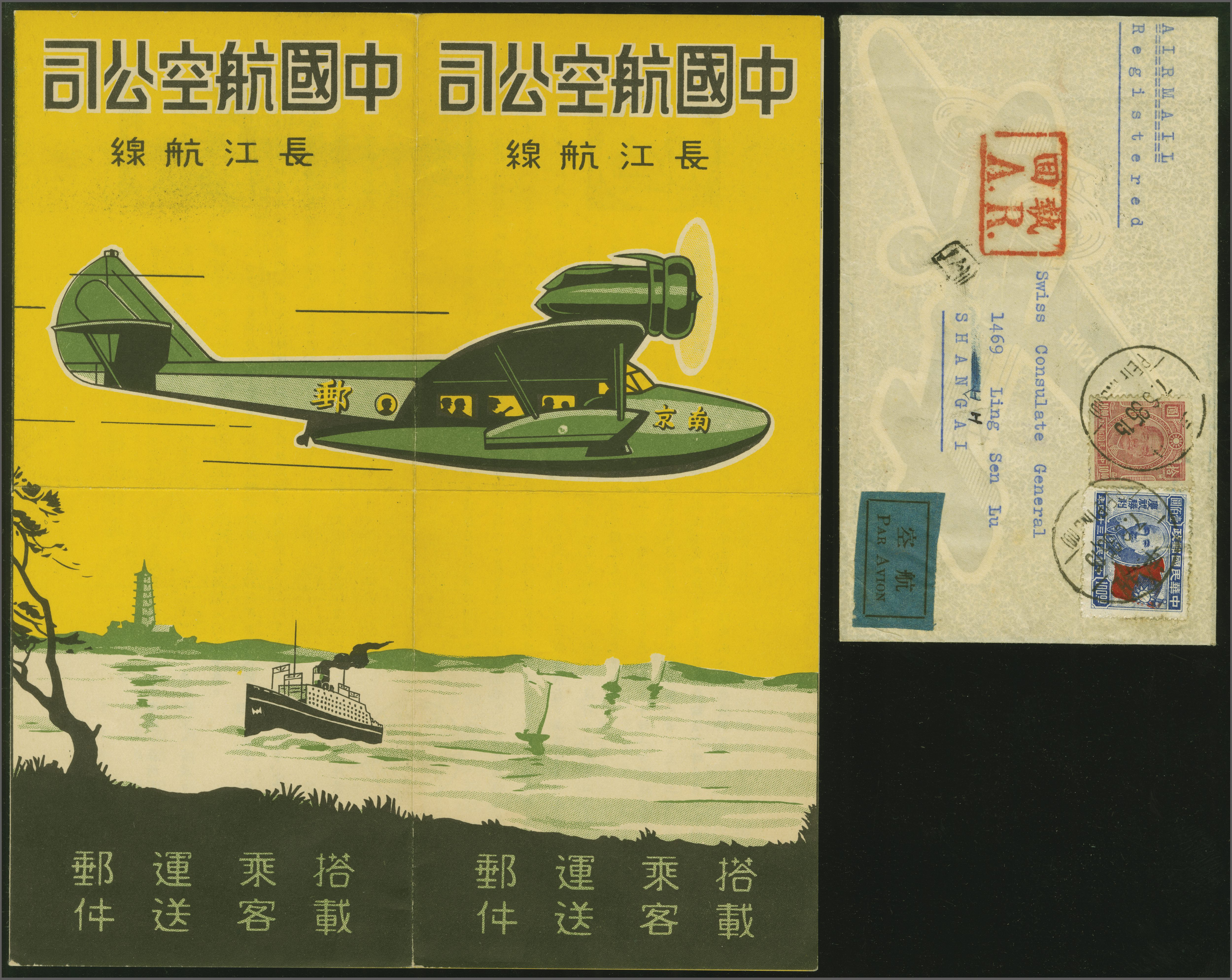 envelope, handstamped with boxed 'A.R.' in red on front, with Shanghai arrival cachet (9.6.46) on reverse. In addition an original CNAC (China National Aviation Corporation) Flight schedule (1930's), all printed in Chinese script, showing