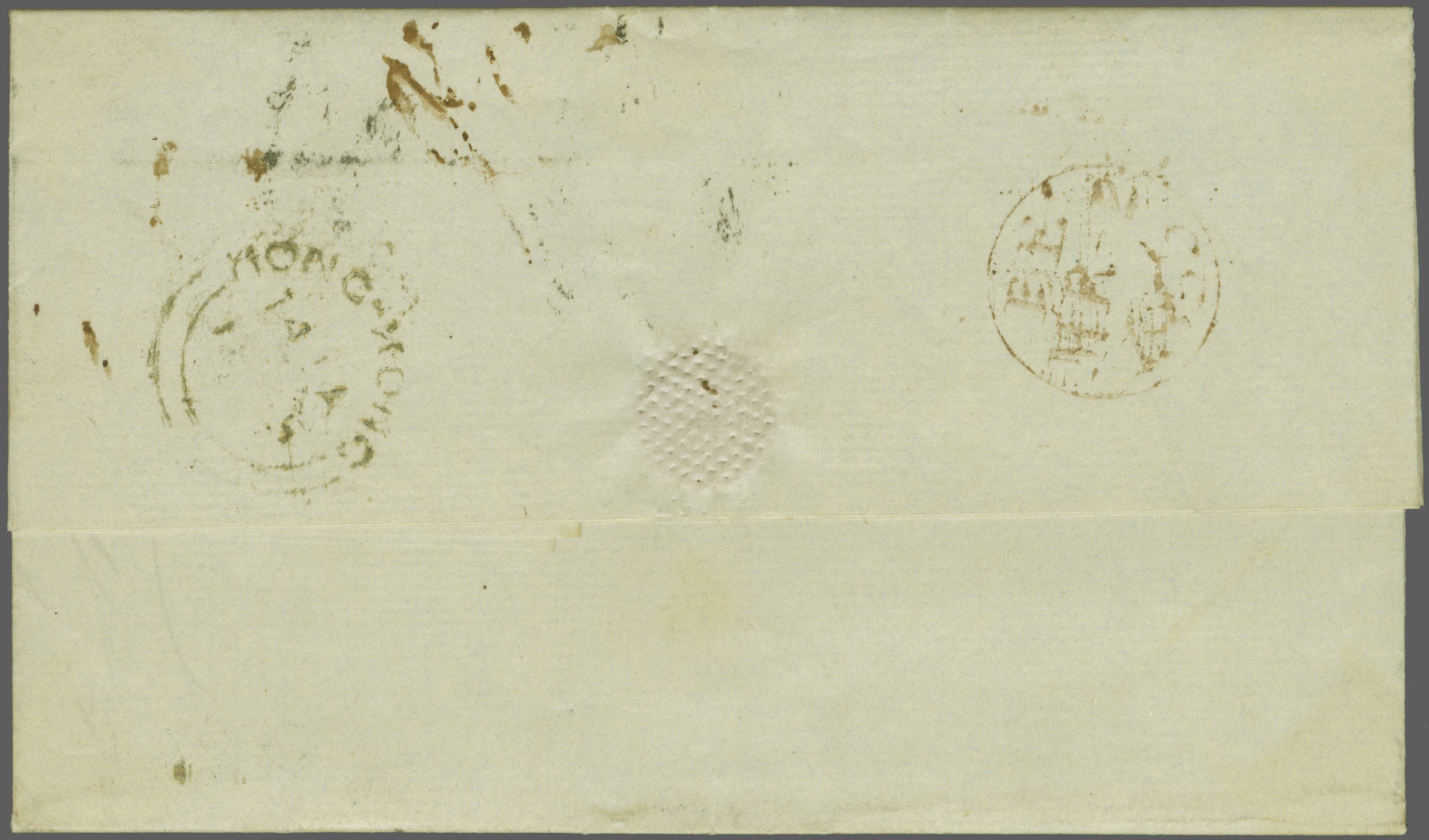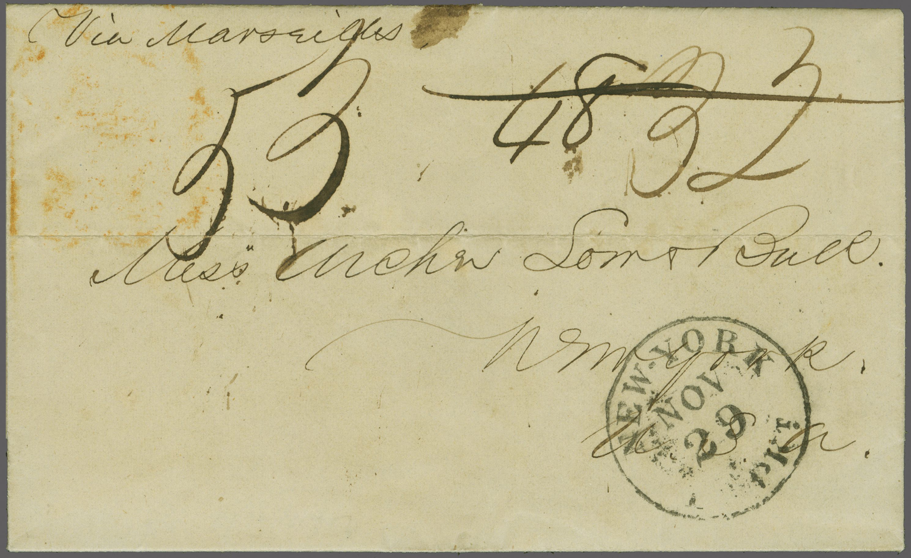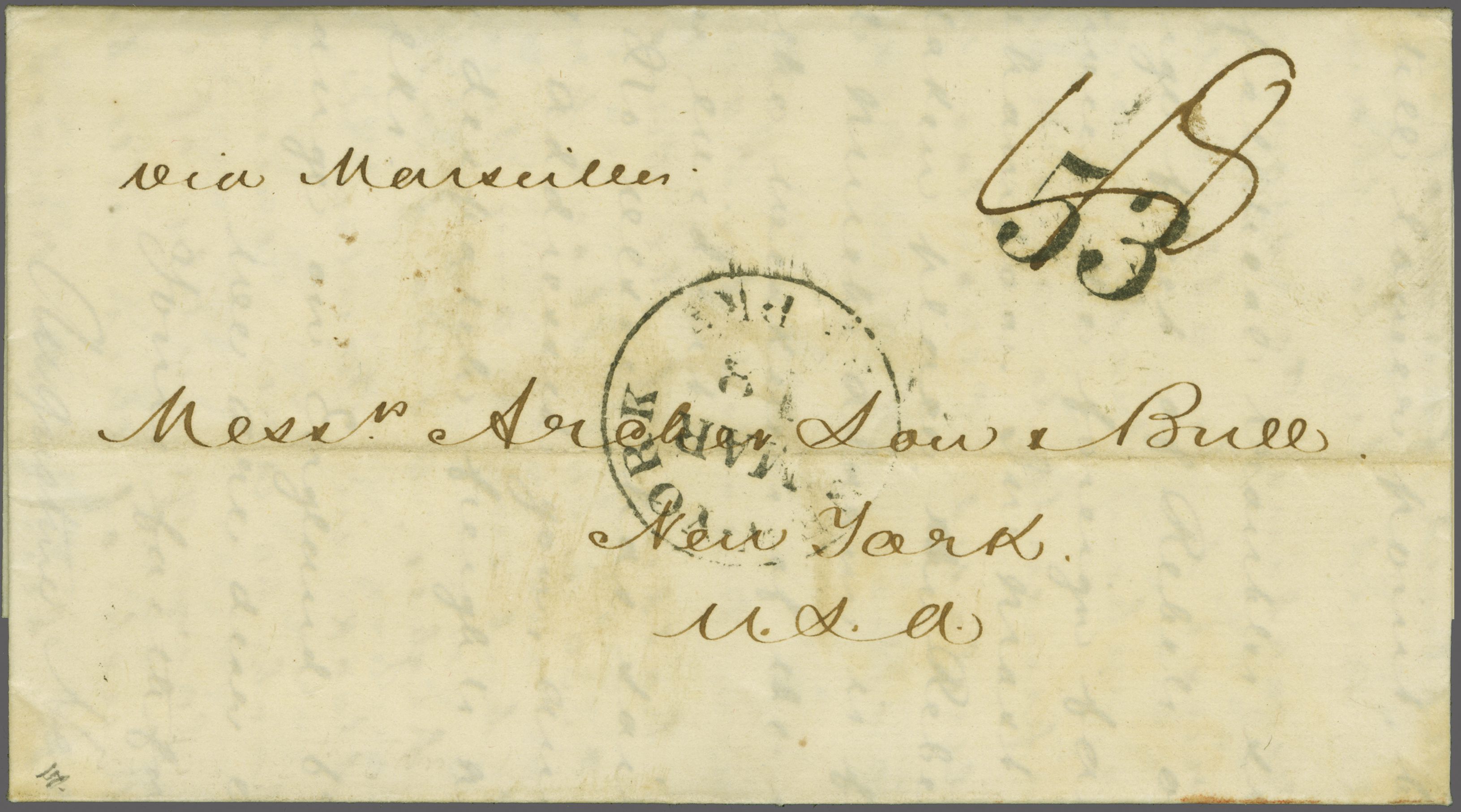 1854 (Sept 23): Entire letter from Russell & Co. in Canton to New York endorsed "via Marseilles", reverse with faint Hong Kong cds in black, struck on arrival of the Cunard steamer "Africa" with "NEW YORK / BR. PKT." cds