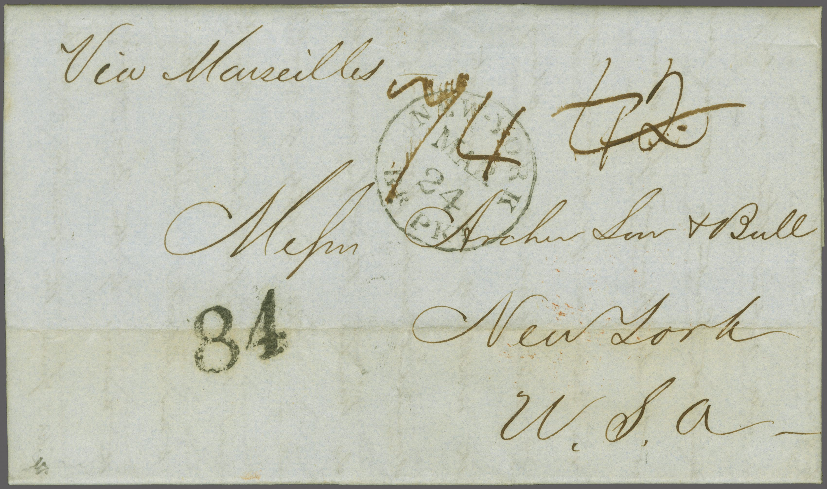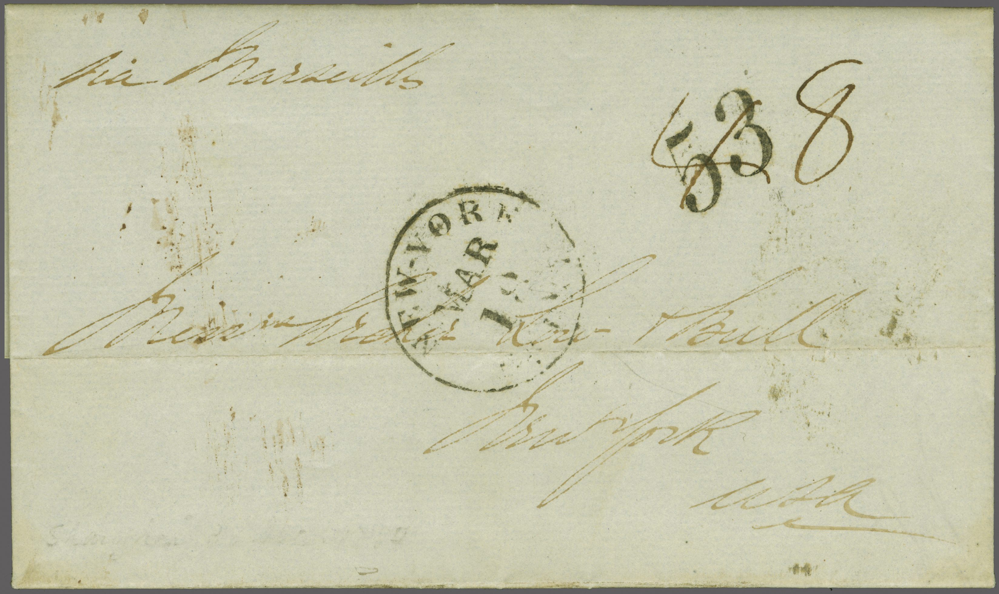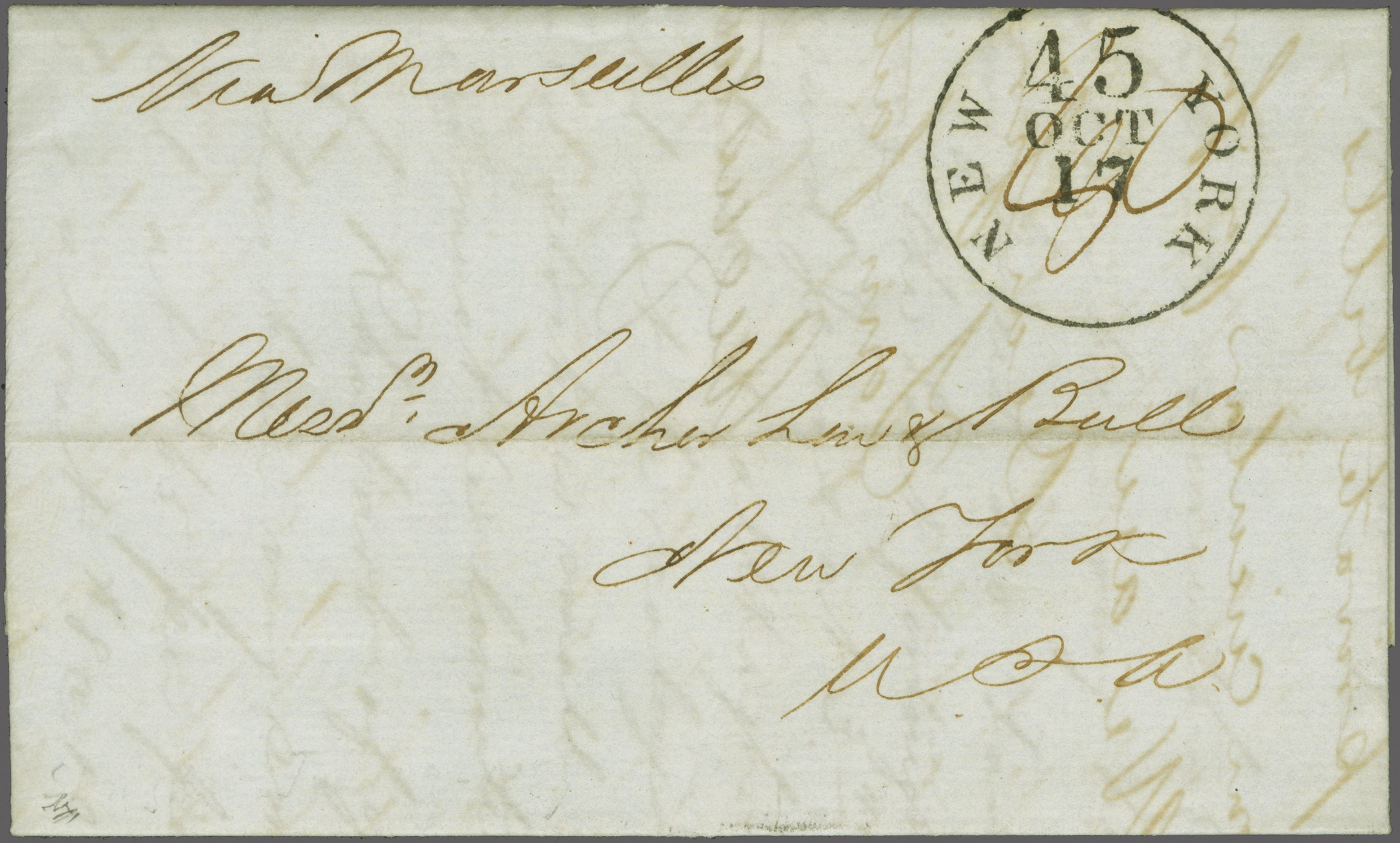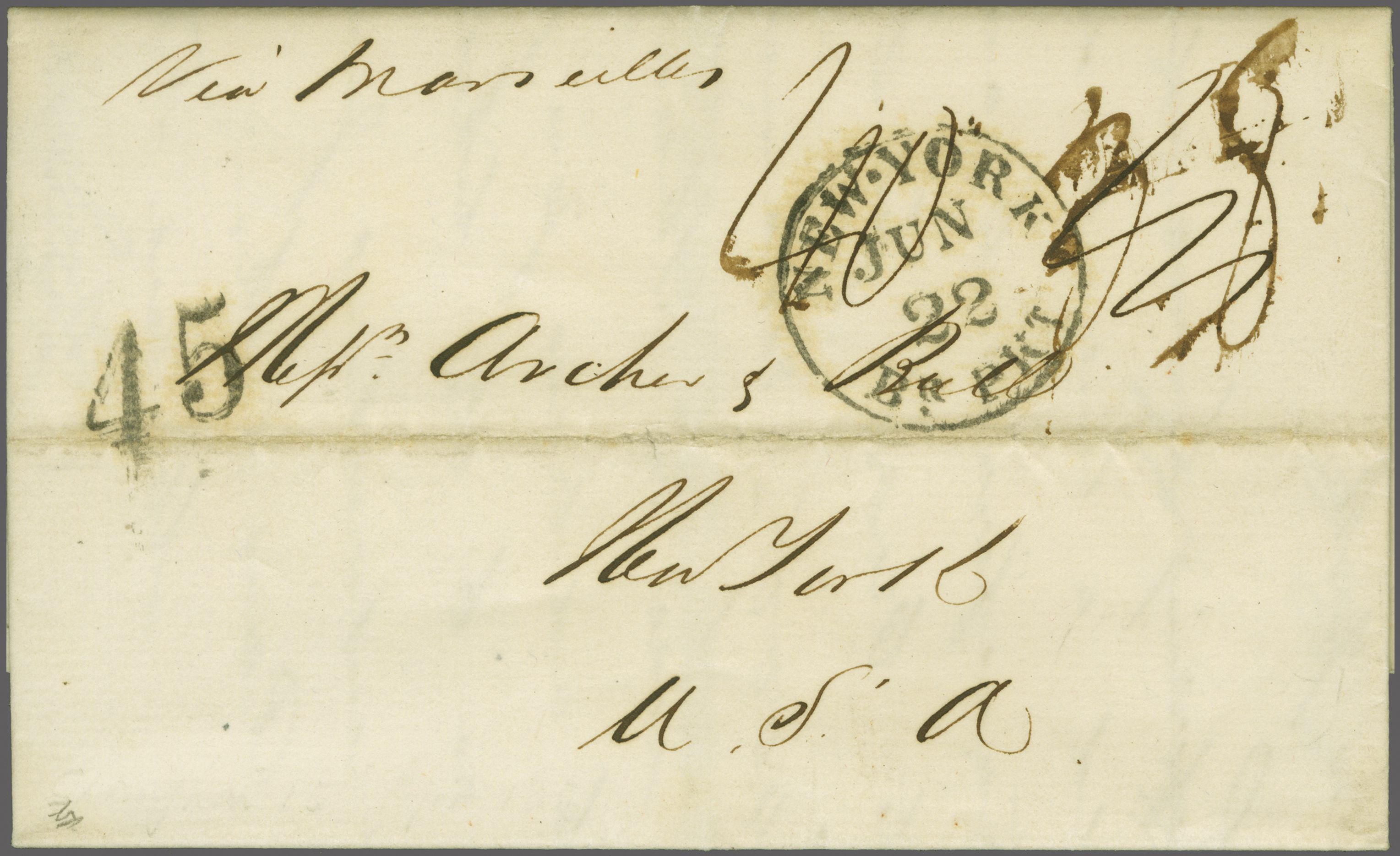 1854 (Sept 23): Entire letter from Russell & Co. in Canton to New York endorsed "via Marseilles", reverse with faint Hong Kong cds in black, struck on arrival of the Cunard steamer "Africa" with "NEW YORK / BR. PKT." cds