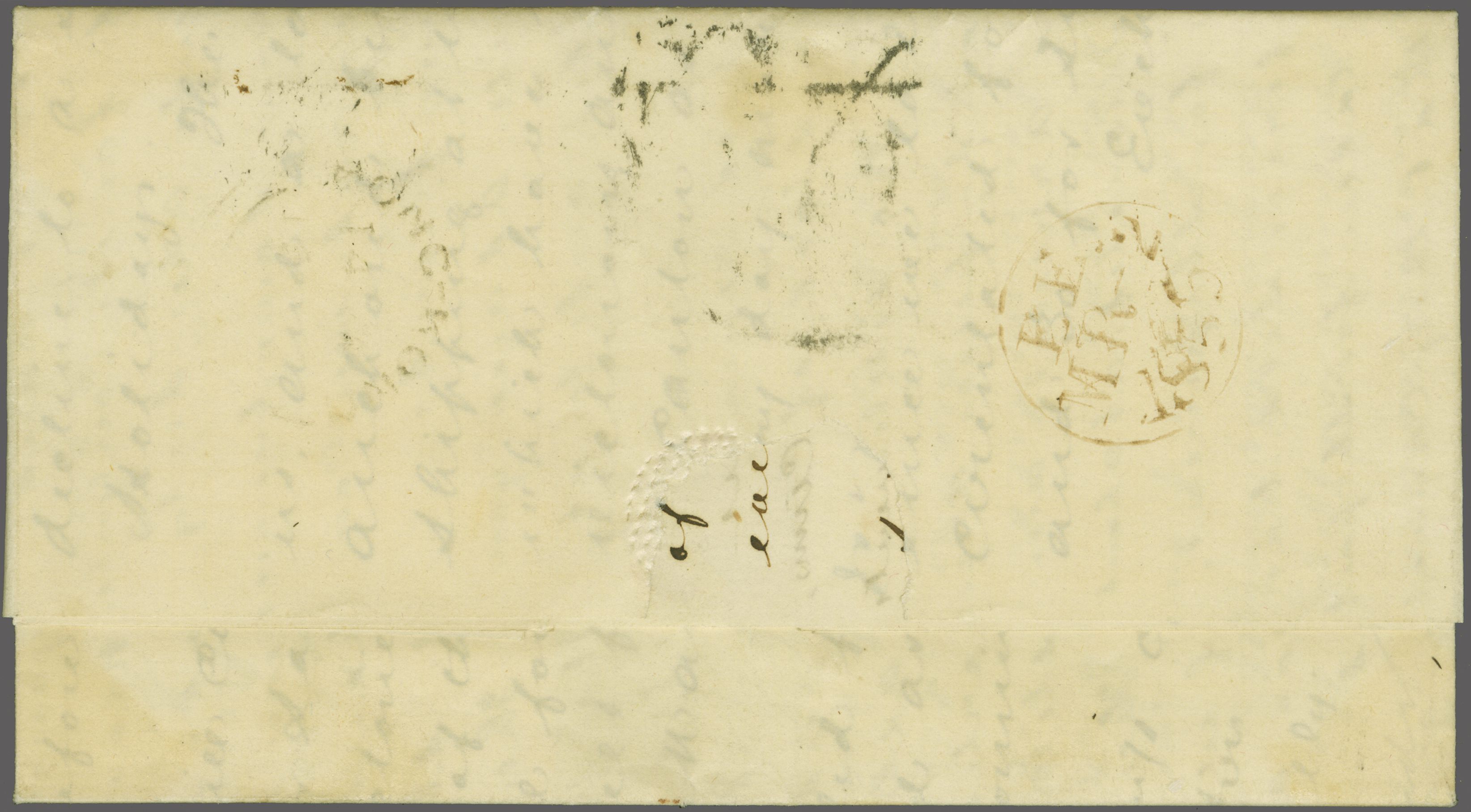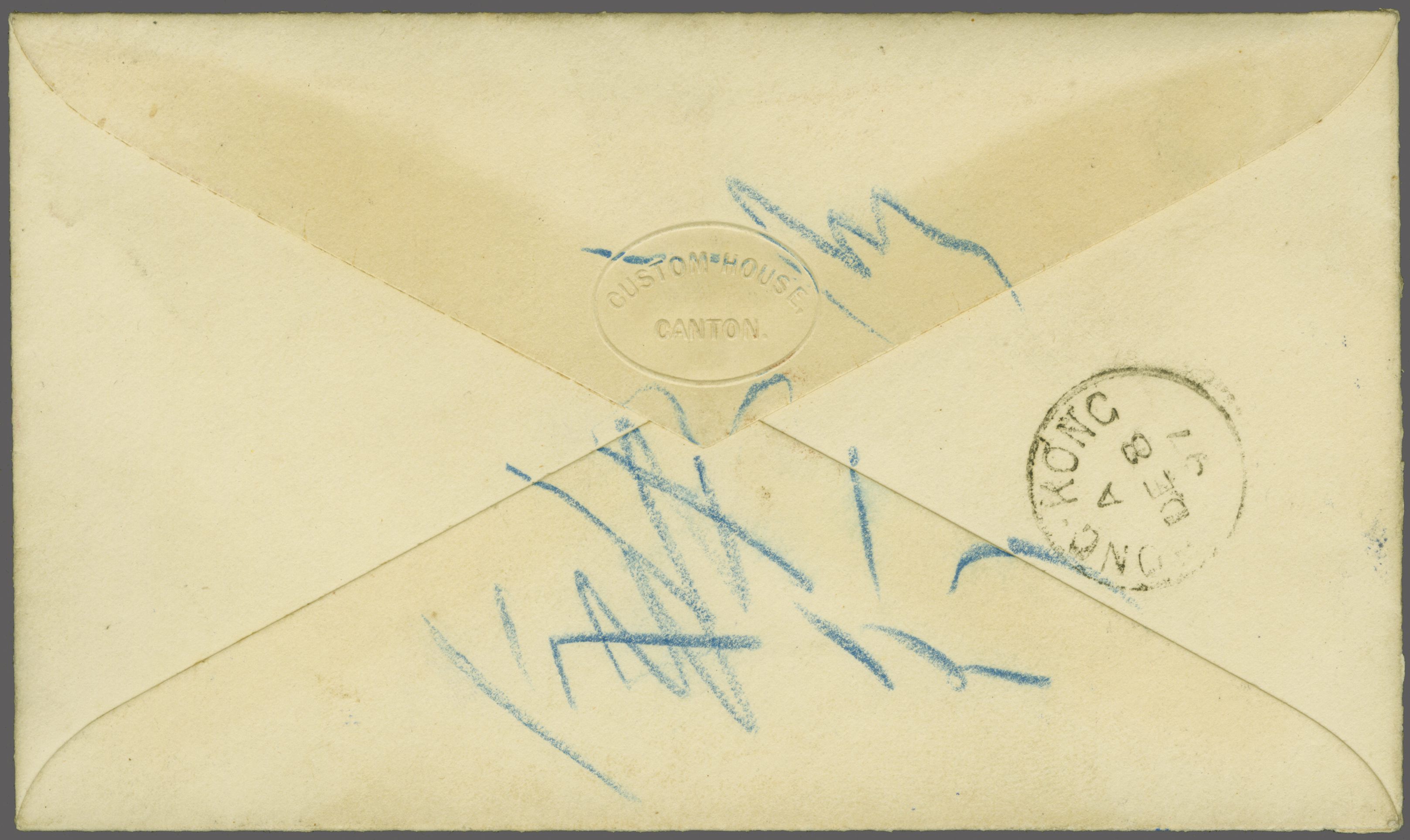 1855 (Jan 12): Entire letter from Augustine Heard & Co. in Canton to New York endorsed "via Marseilles", reverse with faint Hong Kong cds in black, struck on arrival of the Cunard steamer "Canada" with "NEW YORK / BR.