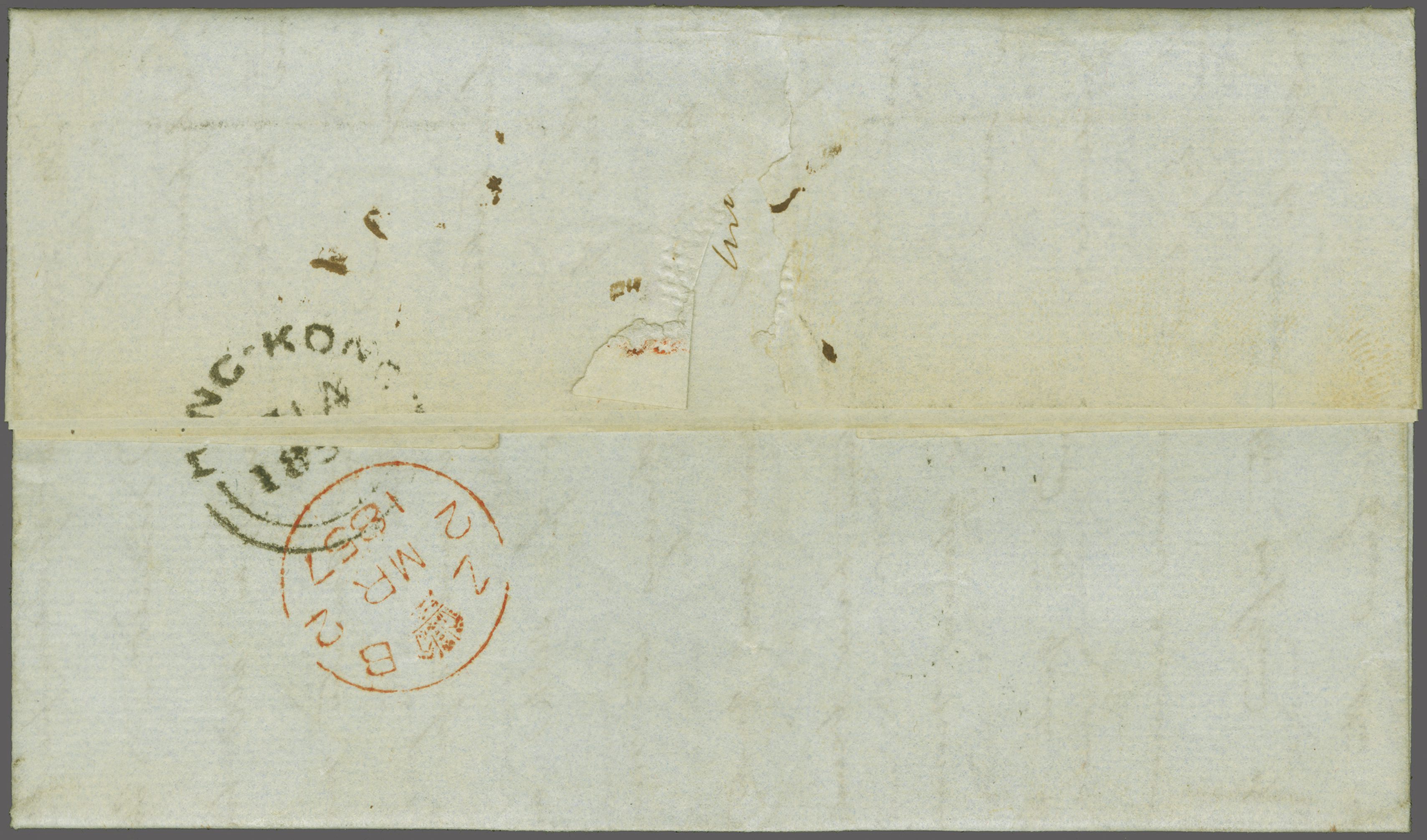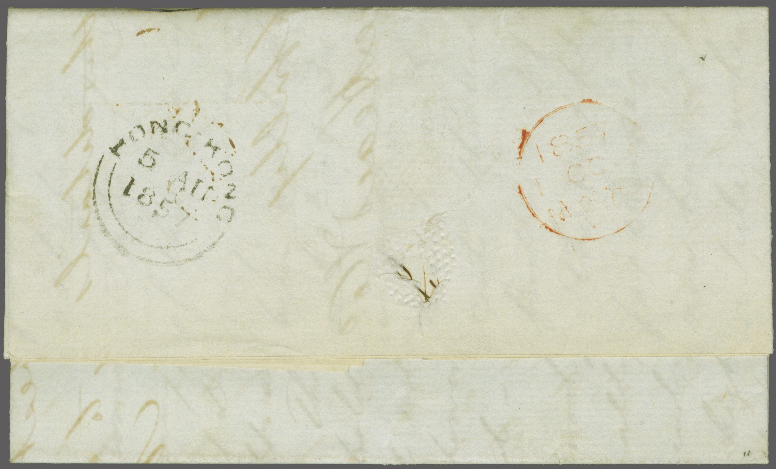 1857 (Jan 6): Entire letter from Augustine Heard & Co. in Shanghai to New York endorsed "via Marseilles", reverse with Hong Kong cds in black (Jan 12), struck on arrival of the Cunard steamer "Africa" with "NEW YORK / BR.