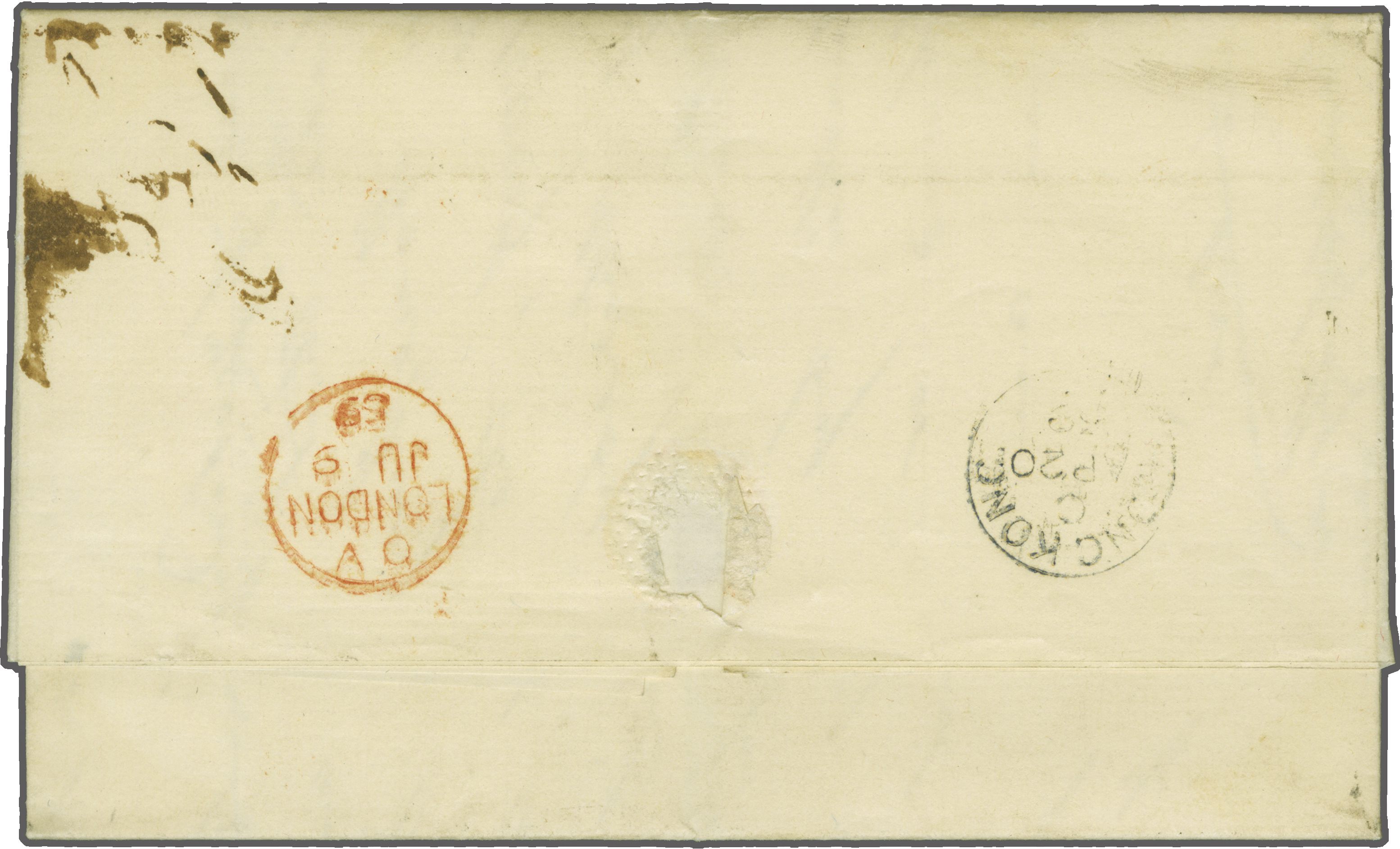 1859 (Dec 30): Entire letter from Augustine Heard & Co. in Shanghai to New York endorsed "via Marseilles", reverse with Hong Kong code C cds in black (April 20), struck on arrival of the Cunard steamer "Persia" with "NEW