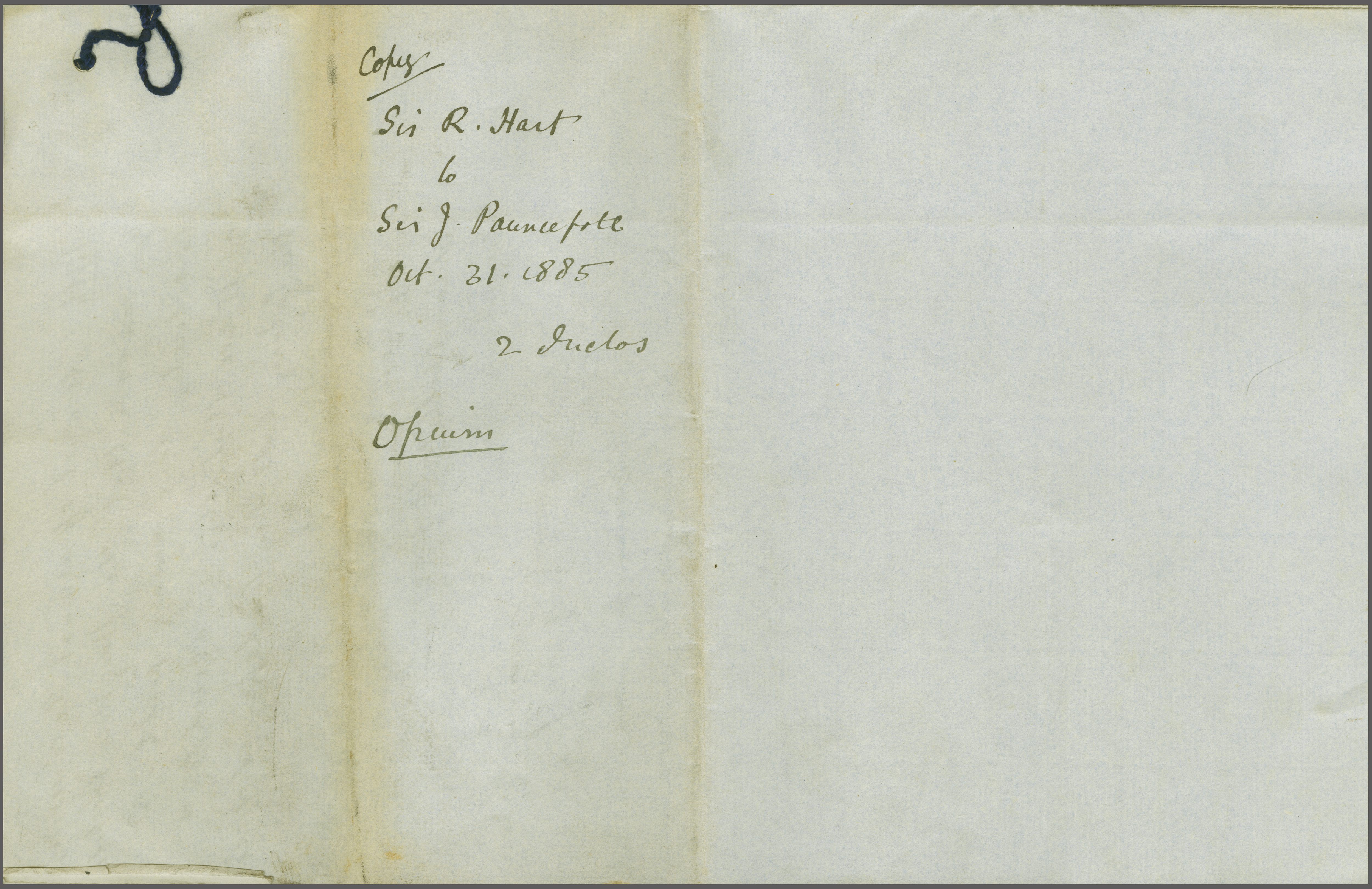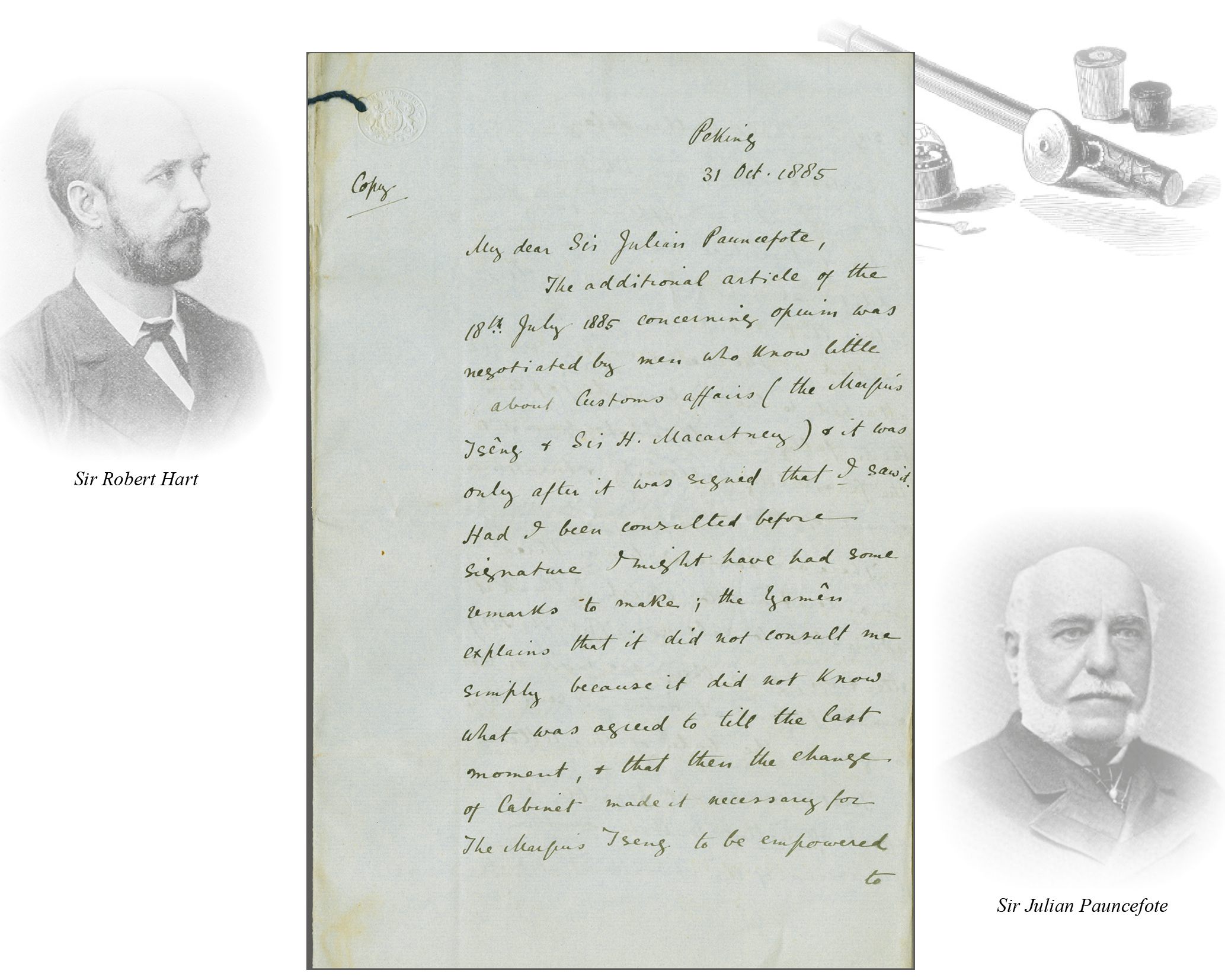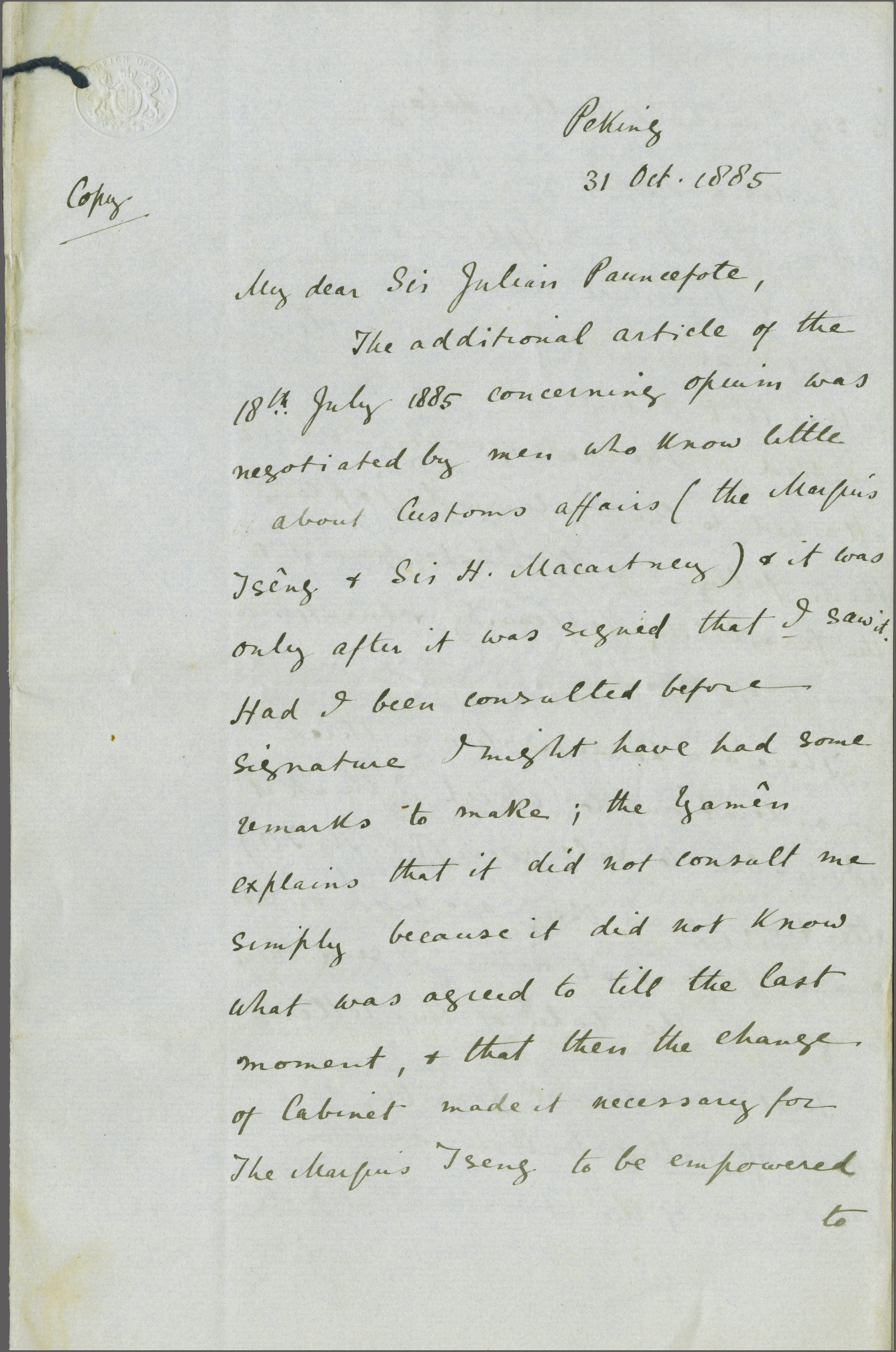 The Opium Trade 1885 (Oct 31): Eight page document in an Official Foreign Office copy of the letter from Sir Robert Hart to Sir Julian Pauncefote written and dated at Peking. In this letter Hart expresses his reservations and