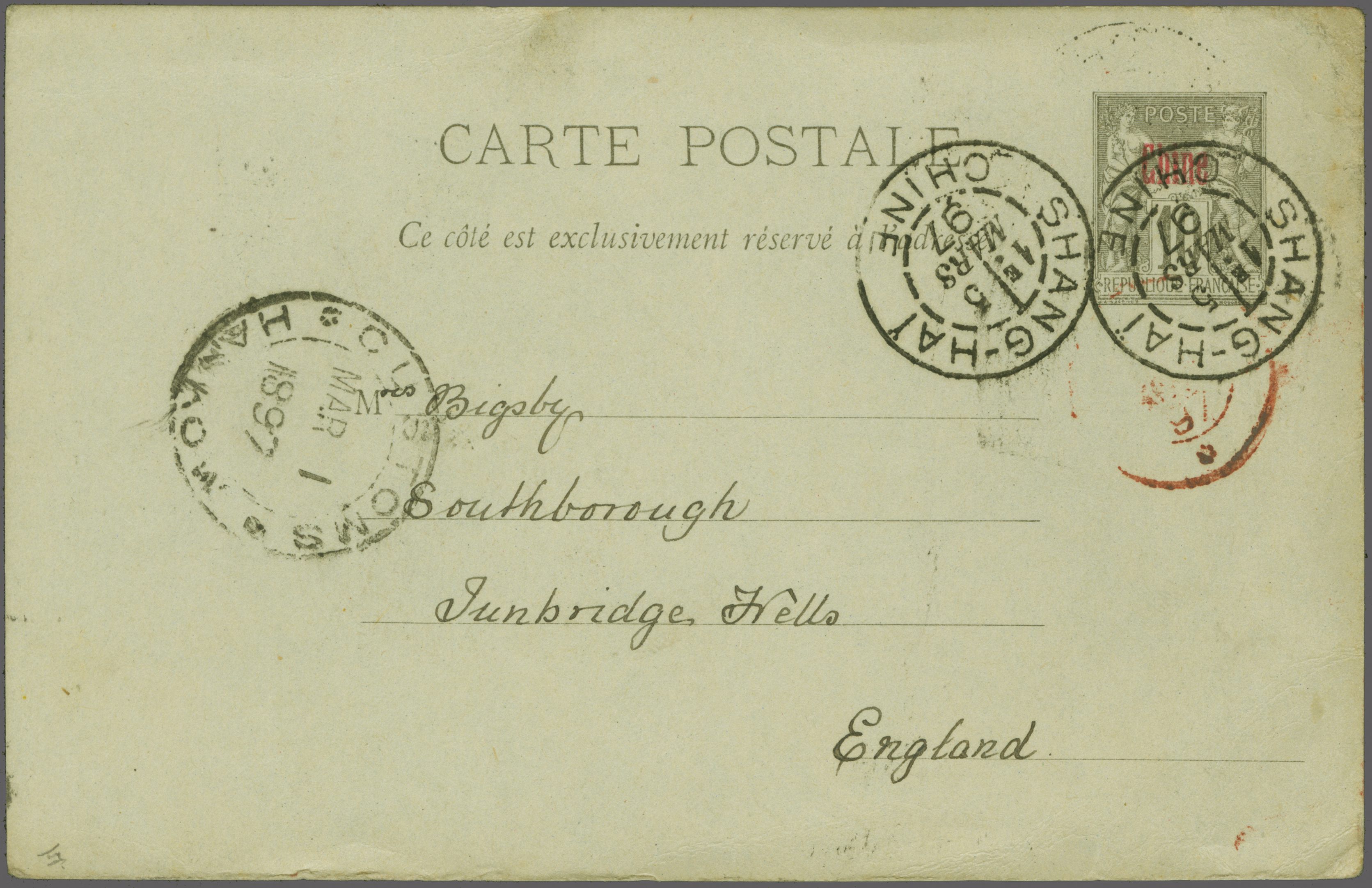 transit cds "CUSTOMS / SHANGHAI" in red-brown (March 4) and the card cancelled with "Shanghai / Chine" cds of the French P.O. on March 5th. Scarce and fine strikes of the Customs datestamps. Note: Text states "...Raped by a gang of 20 robbers and had