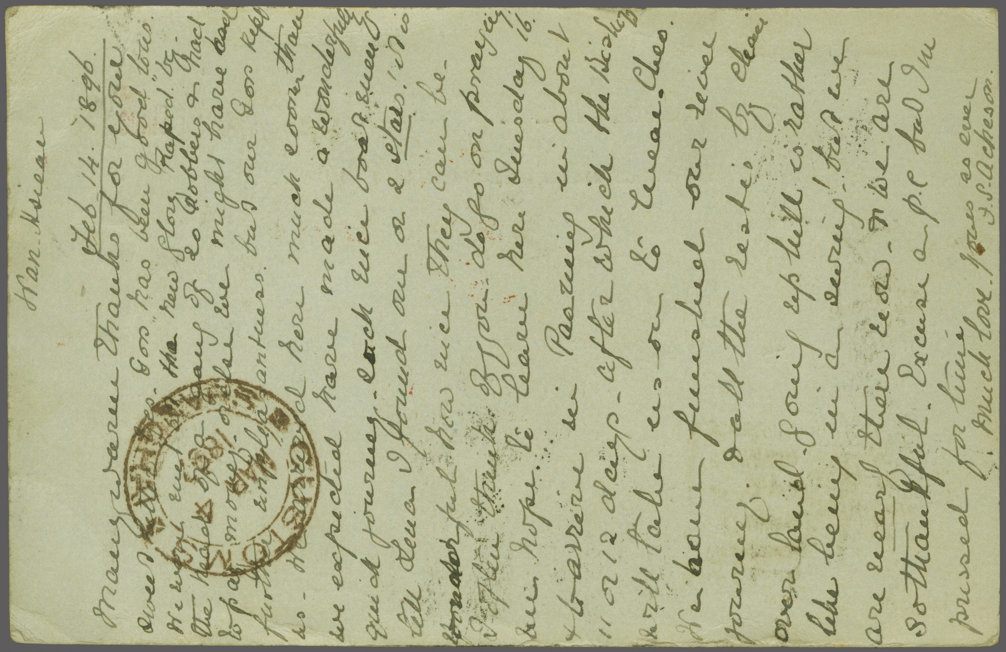 1897 (Feb 14): France 'Chine' 10 c. grey postal stationery card written by a Missionary from "Wan Hsiean" to Tunbridge, England and struck with fine strikes of "CUSTOMS / HANKOW" cds (March 1, 1897) in black, reverse with