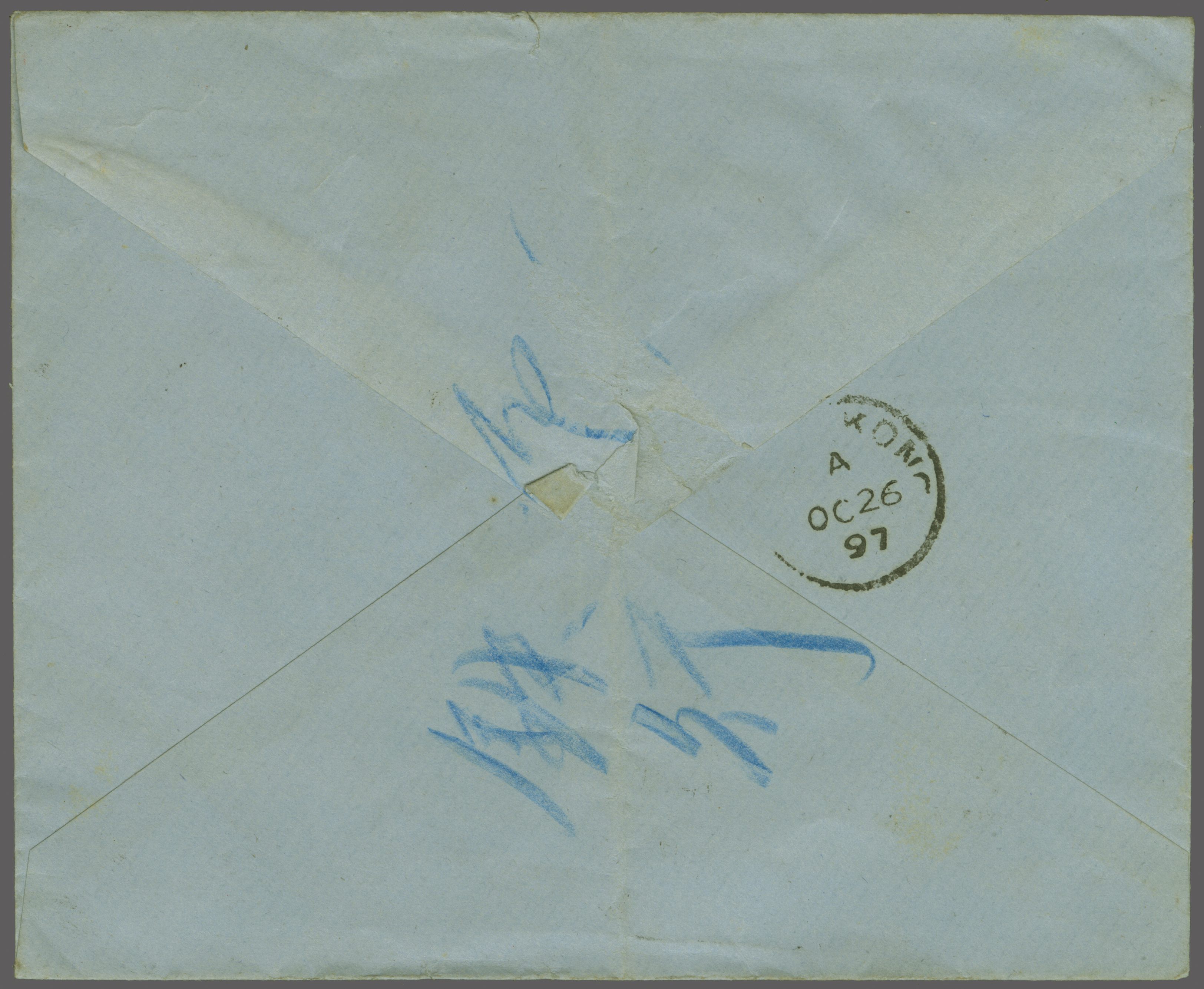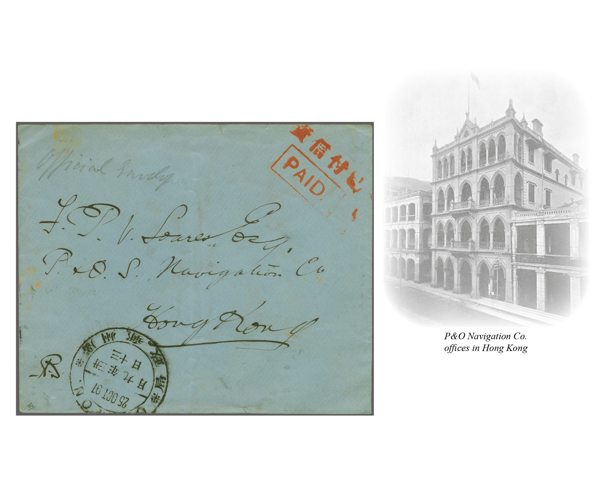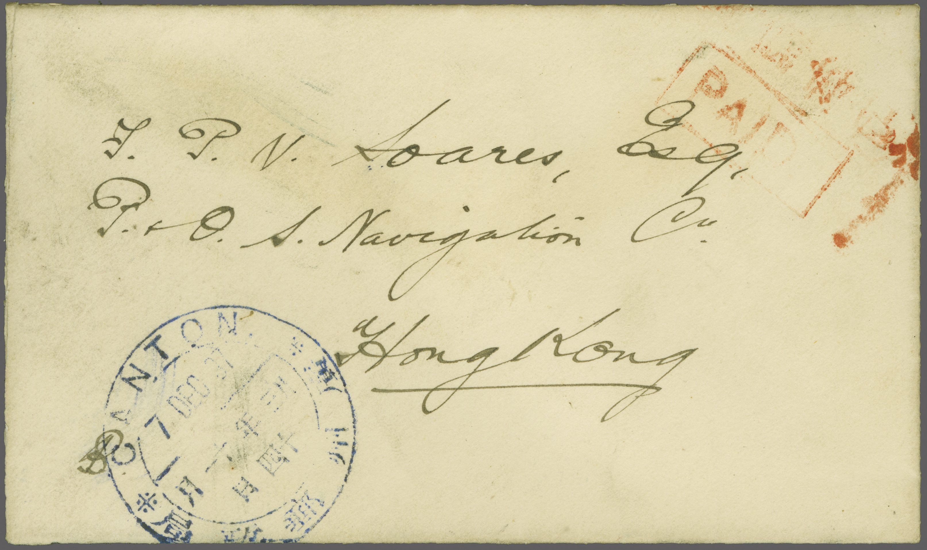 1897 (Oct 25): Stampless cover to P&O Navigation Co. in Hong Kong, struck with extremely scarce Canton offical large bilingual "PAID" handstamp in red at right and fine "CANTON dollar chop in blue (Dec 7). Reverse with