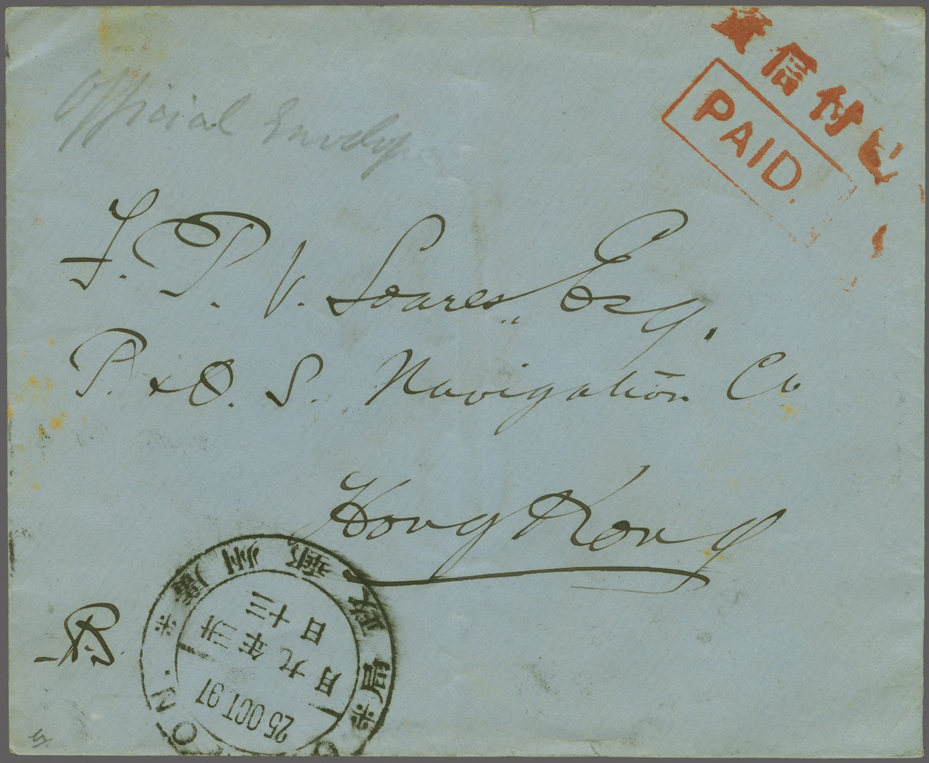 1897 (Oct 25): Stampless cover to P&O Navigation Co. in Hong Kong, struck with extremely scarce Canton offical large bilingual "PAID" handstamp in red at right and fine "CANTON" dollar chop in black (Oct 25). Reverse with